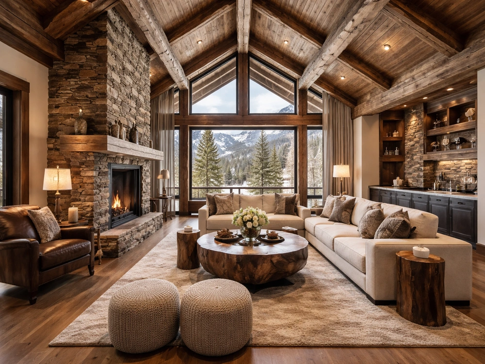 Стиль можно назвать настоящим царством дерева, однако данный материал гармонично сочетается с каменными плитами.