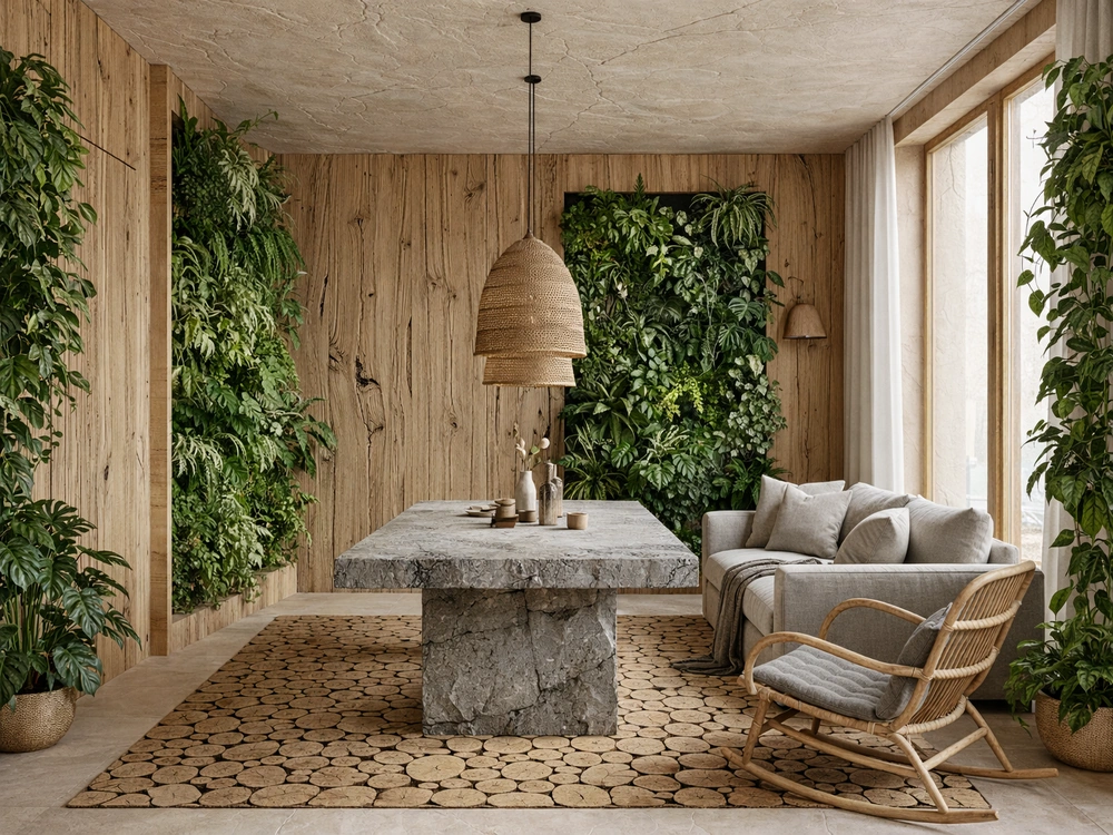 Отдельного внимания заслуживает работа с озеленением. В концепции эко-люкс растения перестают быть декором и становятся частью архитектуры стен. Вертикальные сады, интегрированные в ниши, работают как живые гобелены. Они меняют акустику помещения, очищают воздух и визуально раздвигают границы комнаты, впуская в нее лес.