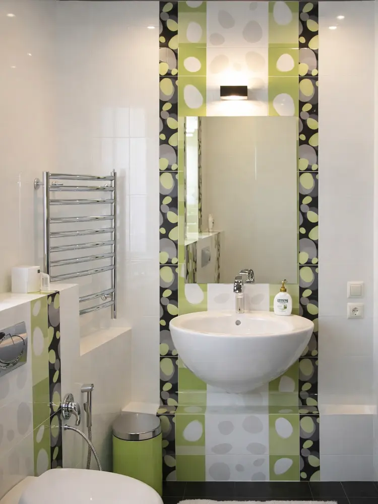 Стены оформлены керамической плиткой с чередованием гладких белых поверхностей и декоративных вставок с круговым орнаментом в оливково-зеленой гамме. Ритм вертикальных полос визуально вытягивает помещение по высоте и делает его более стройным. Такой прием особенно актуален для компактных санузлов, где важно избежать ощущения замкнутости.