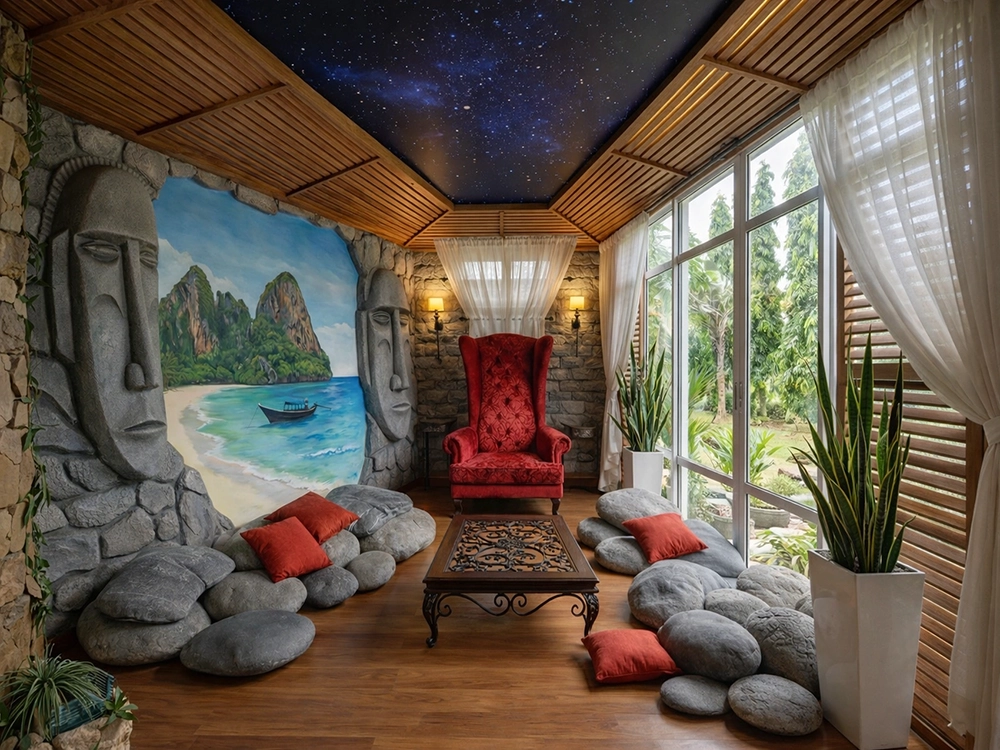 Стены помещения отделаны фактурным светлым камнем и деревянными рейками, что подчеркивает экологическую направленность проекта. Слева выделяется монументальный барельеф в виде гигантской маски или тотема, обрамляющий нишу с живописным пейзажем. Это художественное решение визуально расширяет границы комнаты, открывая вид на воображаемую морскую бухту с лодкой и зелеными холмами. Напольное покрытие выполнено из светлой паркетной доски, уложенной палубным способом, что усиливает ассоциации с прибрежным домиком.