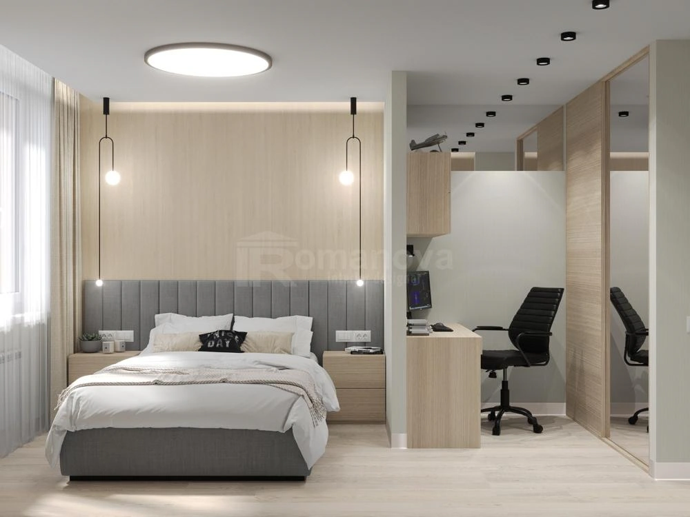 В этом проекте я продумывала спальню как многофункциональное пространство, где каждая зона логично вписана в общий объём комнаты и не перегружает интерьер. Кровать с мягким изголовьем расположена по центральной оси, что визуально сохраняет симметрию и создаёт ощущение порядка. Прикроватные тумбы выполнены в том же материале, что и корпусная мебель, за счёт чего интерьер выглядит цельным и собранным. Рабочая зона отделена лёгкой перегородкой и встроенной мебелью, что позволяет сохранить приватность спального места и одновременно использовать комнату как полноценный кабинет. Гардеробная система выполнена со светлыми фасадами и зеркальными поверхностями, что дополнительно увеличивает пространство и улучшает освещённость. Такое решение особенно актуально, когда выполняется ремонт квартир под ключ и важно заранее учесть все сценарии жизни.