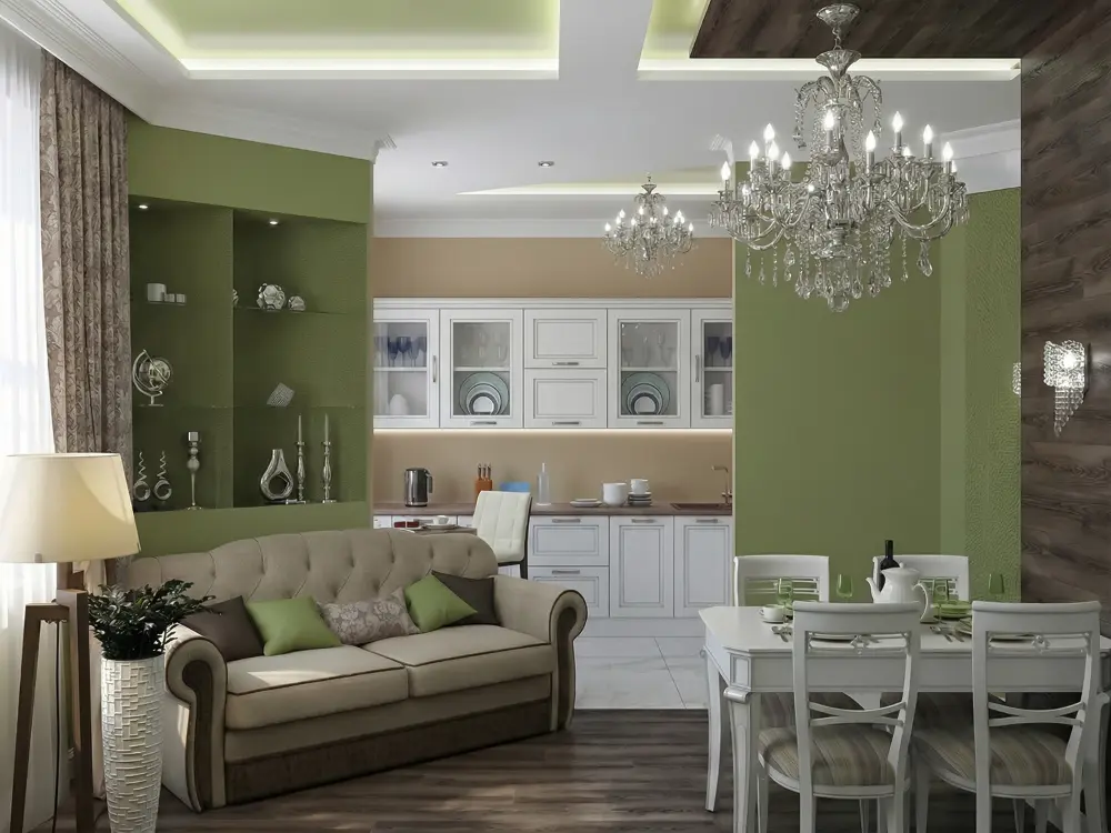 Помещение гостиной вмещает в себя и столовую зону, а также совмещена и с помещением кухни. Данная семейная пара, как и многие любители свободного пространства и удобства, предпочли объединить два разных по назначению помещения гостиную и кухню. Подобное совмещение двух комнат делают как в маленьких, так и в больших квартирах. Зонирование или деление комнат на функциональные их части условно, для этого дизайнер Ирина Романова применила разную цветовую гамму, чтобы улучшить видимость зон, сделать на каждой зоне акцент. Чтобы избежать сложных вариантов цветовой палитры и визуально этим не нагрузить общее пространство, стены решено было оформить нейтральными, спокойными цветами.