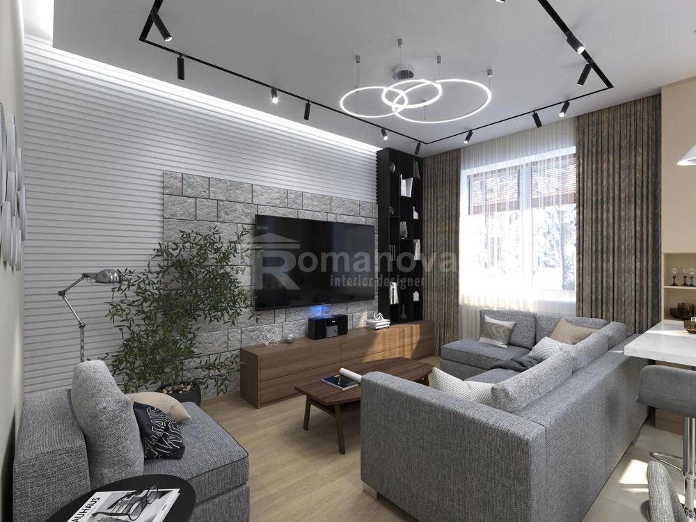 Стена за телевизором оформлена комбинированной отделкой: декоративные панели с ритмичной горизонталью сочетаются с фактурной плиткой под камень. Такое решение добавляет глубину и архитектурность, не перегружая интерьер. Освещение выстроено многоуровнево: трековые светильники обеспечивают функциональный свет, а подвесная композиция из кольцевых светильников создаёт мягкий сценарий для вечернего времени.