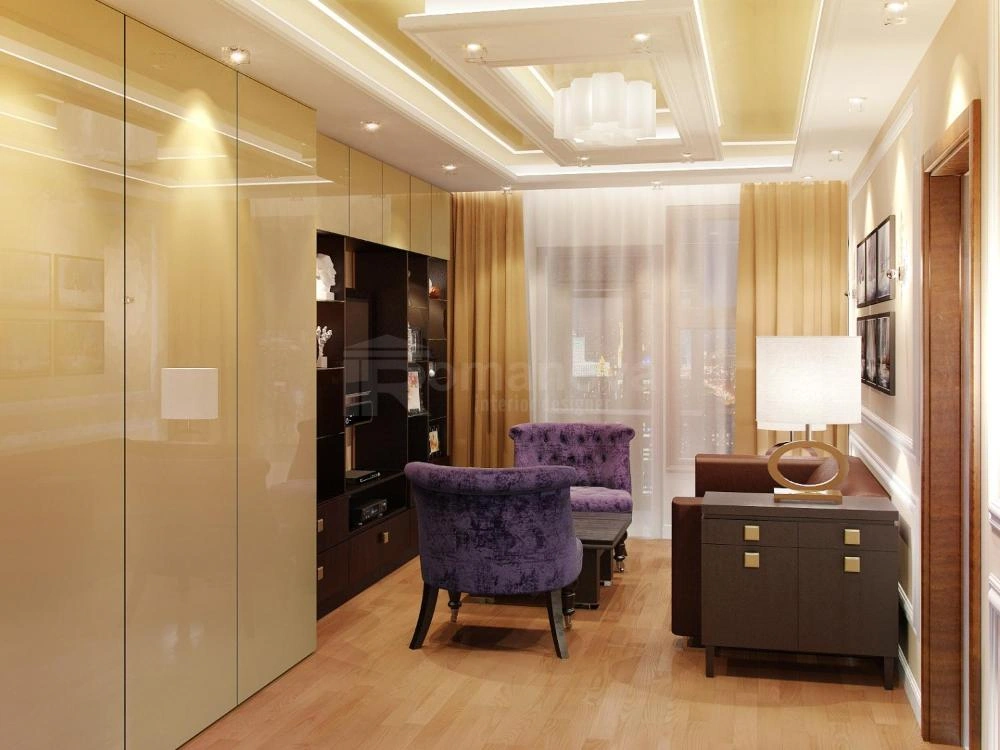 В комнате присутствует многообразие шкафов из-за потребности в этом самих заказчиков, поэтому шкафы спроектированы дизайнером таким образом, чтобы визуально не нагружать интерьер. Встроенный большой шкаф и антресоли визуально облегчены за счет своих фасадов. Светлый, мягкий оттенок и глянцевая фактура работают на расширение пространства, темные оттенки и фактура остальных шкафов, создающие гармоничный дизайн квартиры, делают интерьер более интересным и не монотонным. Комната имеет вытянутую прямоугольную форму и для этого дизайнером придуман визуальный эффект, который делает ее более квадратной за счет темных оттенков. В таком цвете выполнены шторы и выкрашена стена, противоположная окну. Теперь комната визуально не смотрится такой вытянутой.