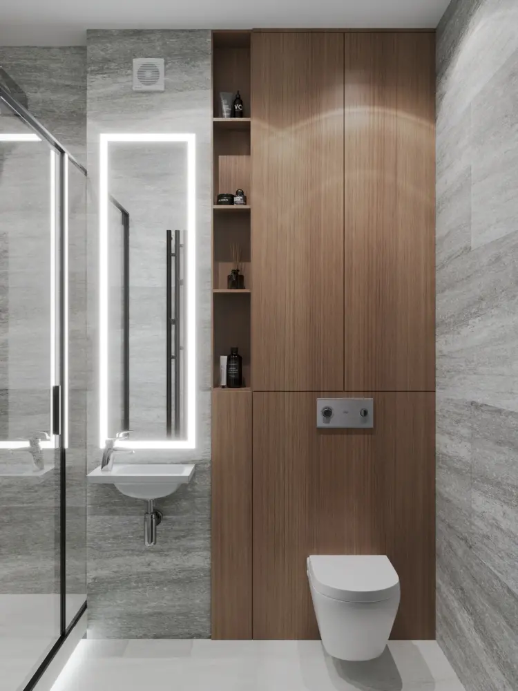 Основой визуальной концепции стал контраст двух мощных природных фактур: камня и дерева. На стенах и полу мы использовали керамогранит с выразительной, но спокойной текстурой слоистого серого камня. Горизонтальное направление рисунка на плитке помогает визуально раздвинуть узкие стены. В противовес холодному камню выступает масштабная система хранения, выполненная в теплых оттенках дерева с ярко выраженной вертикальной текстурой. Деревянные фасады скрывают за собой не только места для хранения полотенец и косметики, но и инженерные узлы, включая инсталляцию для подвесного унитаза. Практика показывает, что даже выполняя ремонт квартиры в условиях города, подобные приемы скрытого монтажа и интеграции систем хранения от пола до потолка кардинально меняют восприятие пространства, делая его чистым и архитектурным.