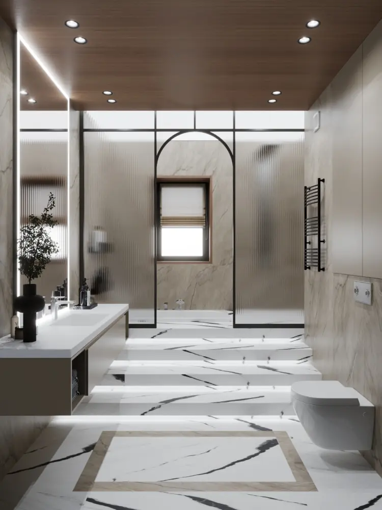 Потолок в зоне раковин обшит шпонированными панелями из МДФ с ярко выраженной текстурой натурального дерева. Дерево здесь работает не только как визуальный противовес камню, но и как акустический демпфер, гасящий эхо, характерное для больших санузлов. Вертикальным разделителем пространства служит масштабная перегородка из рифленого стекла. Она заключена в арочный металлический профиль, покрытый порошковой краской горячей сушки для максимальной защиты от влаги. Рифленое стекло фантастически преломляет дневной свет от окна, обеспечивая приватность мокрой зоны без потери освещенности.