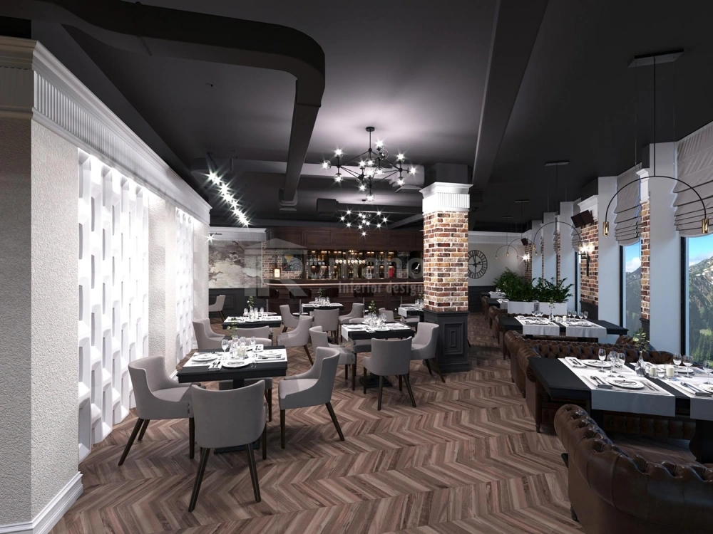 Дизайн интерьера ресторана в стиле лофт с видом на горы