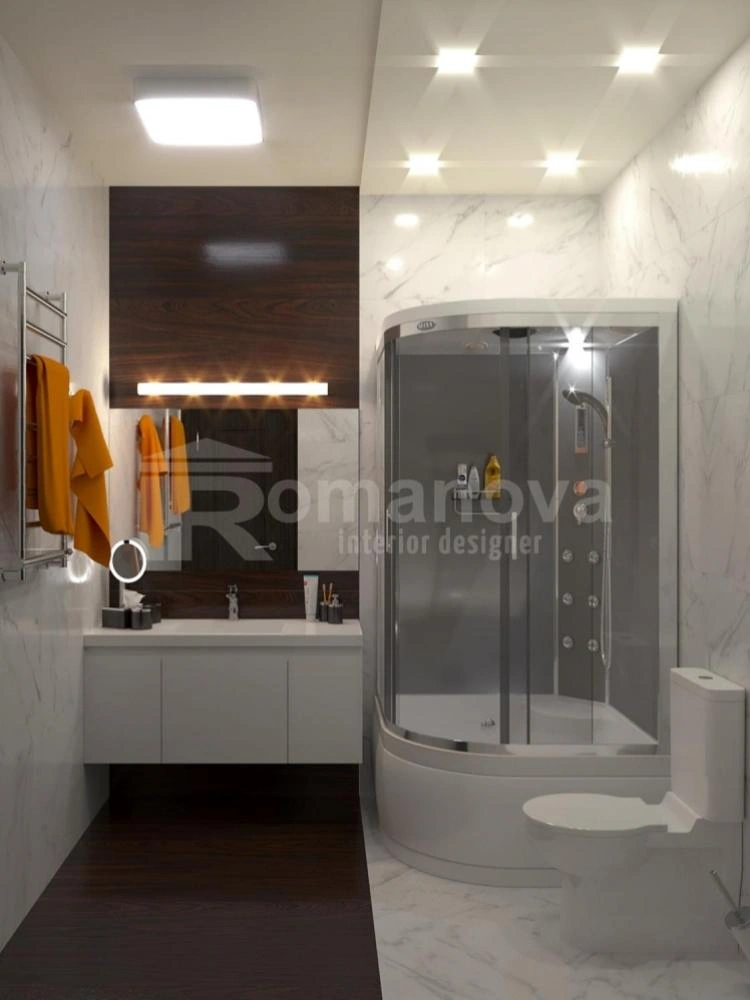 При проектировании интерьера ванной комнаты, Ирина Романова применила идею визуального зонирования пространства, для которого подобрала определённую керамогранитную плитку: керамический паркет с текстурой и цветом тёплого дерева и плитку больших размеров с имитацией благородного белого мрамора. Подобное сочетание привнесло в интерьер ванной одновременно и строгости, и теплоты. Правильное расположение сантехнического оборудования, светового оформления, цвета, построения потолочной конструкции, всё «играет» на расширение пространства, на визуальный баланс. Керамогранитная плитка, в данном дизайн-проекте, является фоновым оформлением, акцентность интерьеру ванной, добавляется с помощью текстиля и мелких предметов обихода – это полотенца, зубные щётки. Цветовая палитра для подобных акцентов может быть применена любая: беж, сирень, олива, желтый, синий и т. д., тем самым можно хоть каждый день менять цветовую палитру и в связи с этим может меняться и настроение, что очень важно для каждодневного и полноценного времяпрепровождения в подобной комнате.
