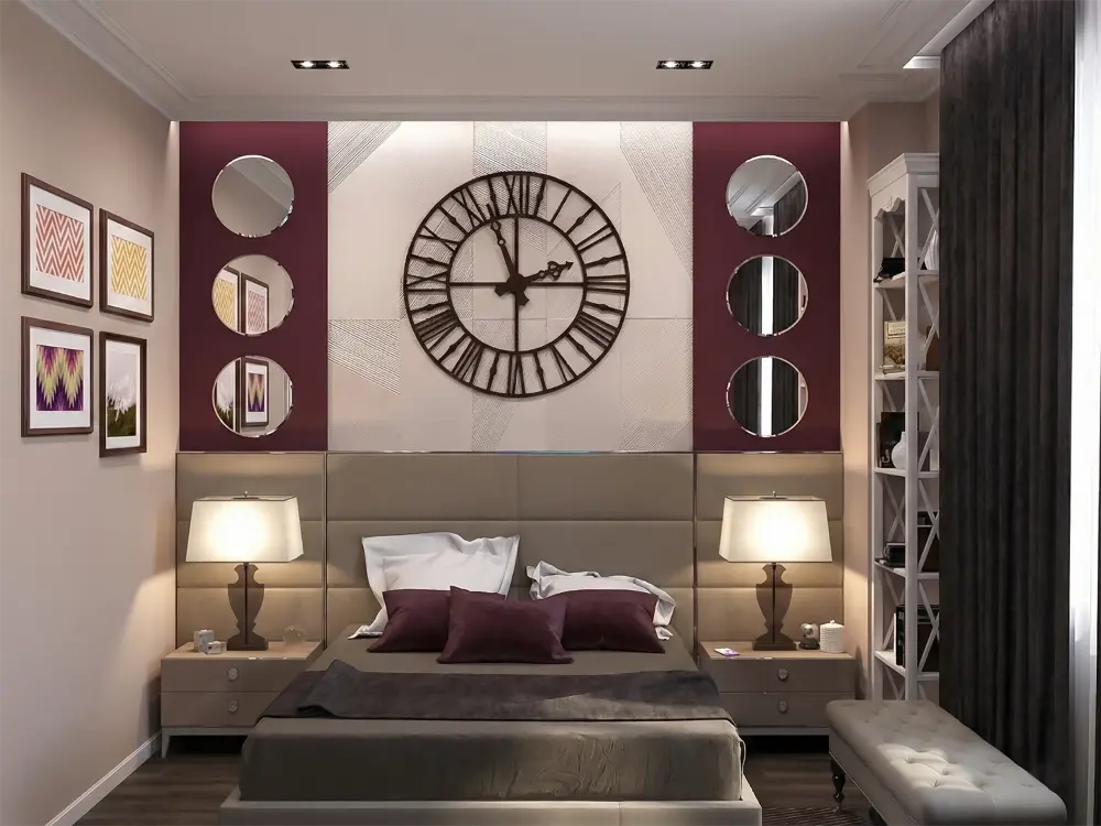 Применяемые элементы декора для дизайна интерьера спальни делают её ещё более красивой, стильной и оригинальной. Зеркала круглой формы, расположенные по двум сторонам центральной стены, настенные часы большого диаметра, а также декоративные предметы, размещённые на прикроватных тумбах и в открытых стеллажах, превращают помещение в элегантно оформленное и функциональное пространство, помогая воплотить идею интерьера в реальность и сформировать целостный, продуманный образ.