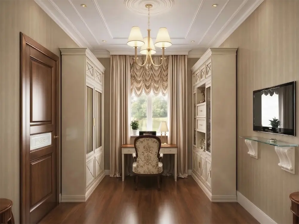 Особое внимание в проекте уделено потолочному пространству. Белый матовый потолок украшен геометрическим орнаментом из молдингов, образующих прямоугольные секции. В центре расположена круглая лепная розетка, служащая основанием для люстры. Осветительный прибор имеет классическую форму с изогнутыми металлическими рожками золотистого цвета и конусообразными тканевыми плафонами, дающими мягкий, рассеянный свет. Дополнительное освещение обеспечивают точечные светильники, встроенные по периметру потолка. Стены оклеены обоями с вертикальной текстурой, что визуально приподнимает потолок. На правой стене размещена телевизионная панель в черной глянцевой раме, под которой закреплены две декоративные консольные полки белого цвета с лепным декором в виде волют.