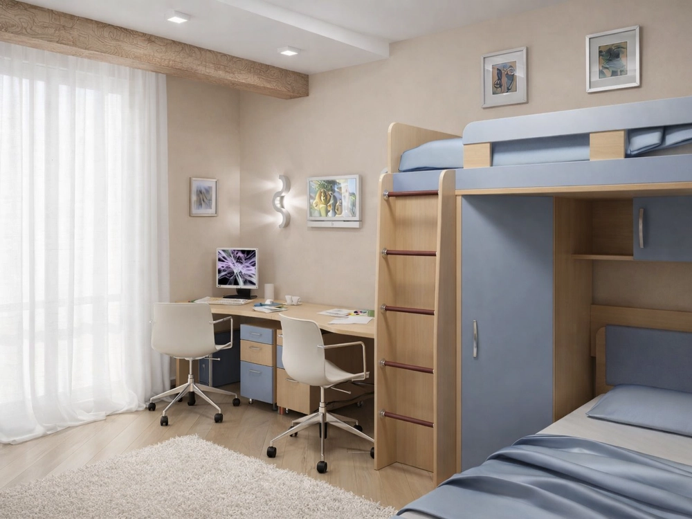 Рабочая зона организована вдоль окна и включает два полноценных письменных стола с отдельными тумбами и мобильными креслами. Такое решение удобно для одновременных занятий и не создает ощущения тесноты. Естественный свет равномерно попадает на обе рабочие поверхности, что особенно важно для детского зрения. Дополнительные настенные светильники обеспечивают комфортное освещение в вечернее время.