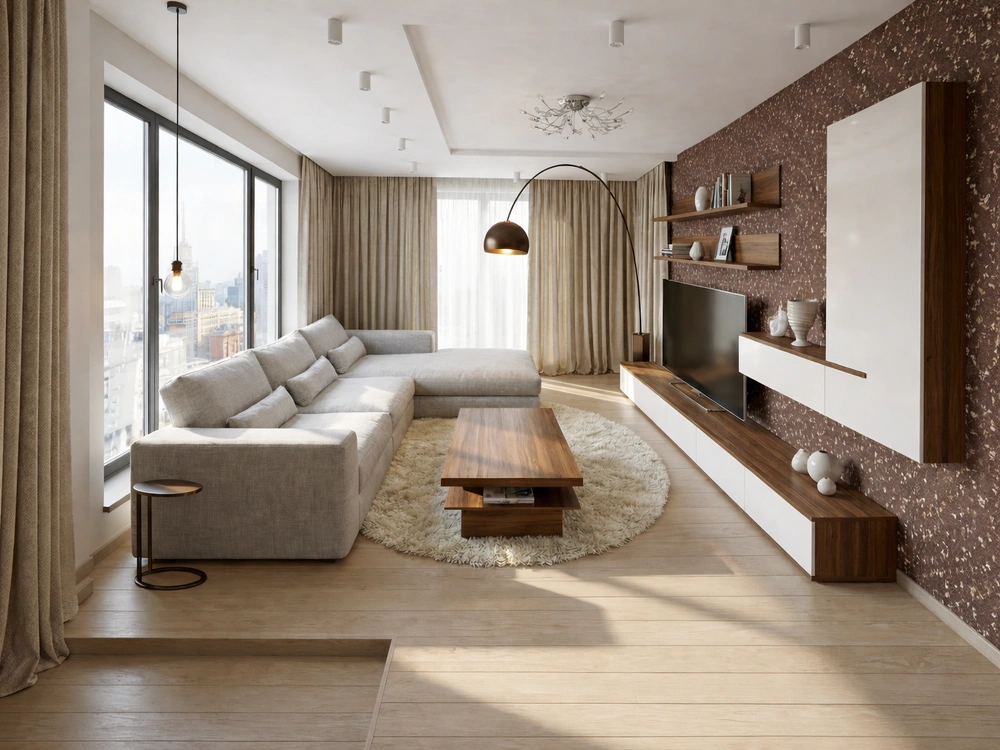 Большой угловой диван с лаконичными подлокотниками занимает значительную часть пространства, приглашая к отдыху. Его форма и расположение четко зонируют комнату, отделяя зону релаксации от проходной части. Панорамное окно слева (или его искусная имитация в виде фотопанно) наполнено деталями городского пейзажа, связывая интерьер с внешней средой. Чтобы грамотно объединить все эти элементы — от сложного освещения до авторской мебели — и получить гарантированно качественный результат, рекомендуется своевременно заказать дизайн проект квартиры, что позволит избежать ошибок на этапе реализации.