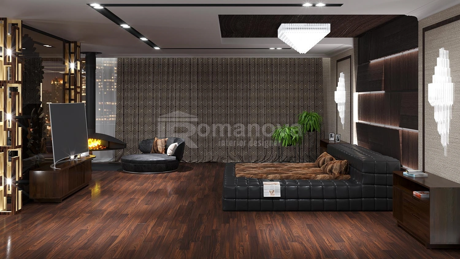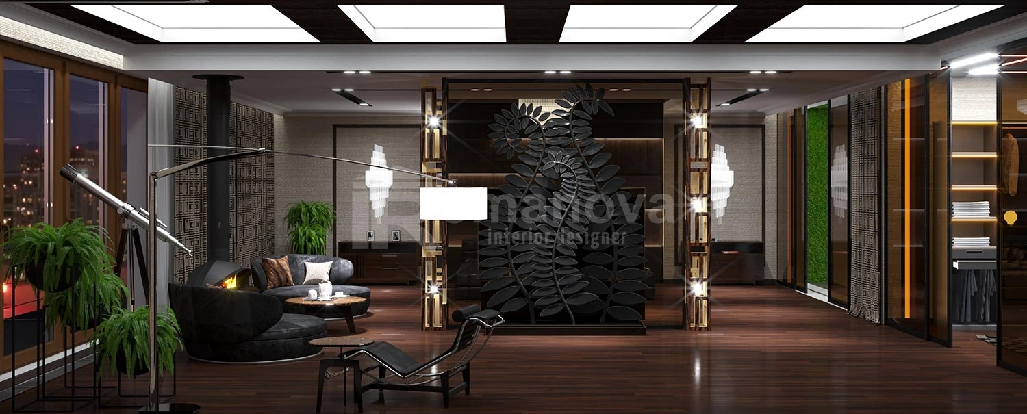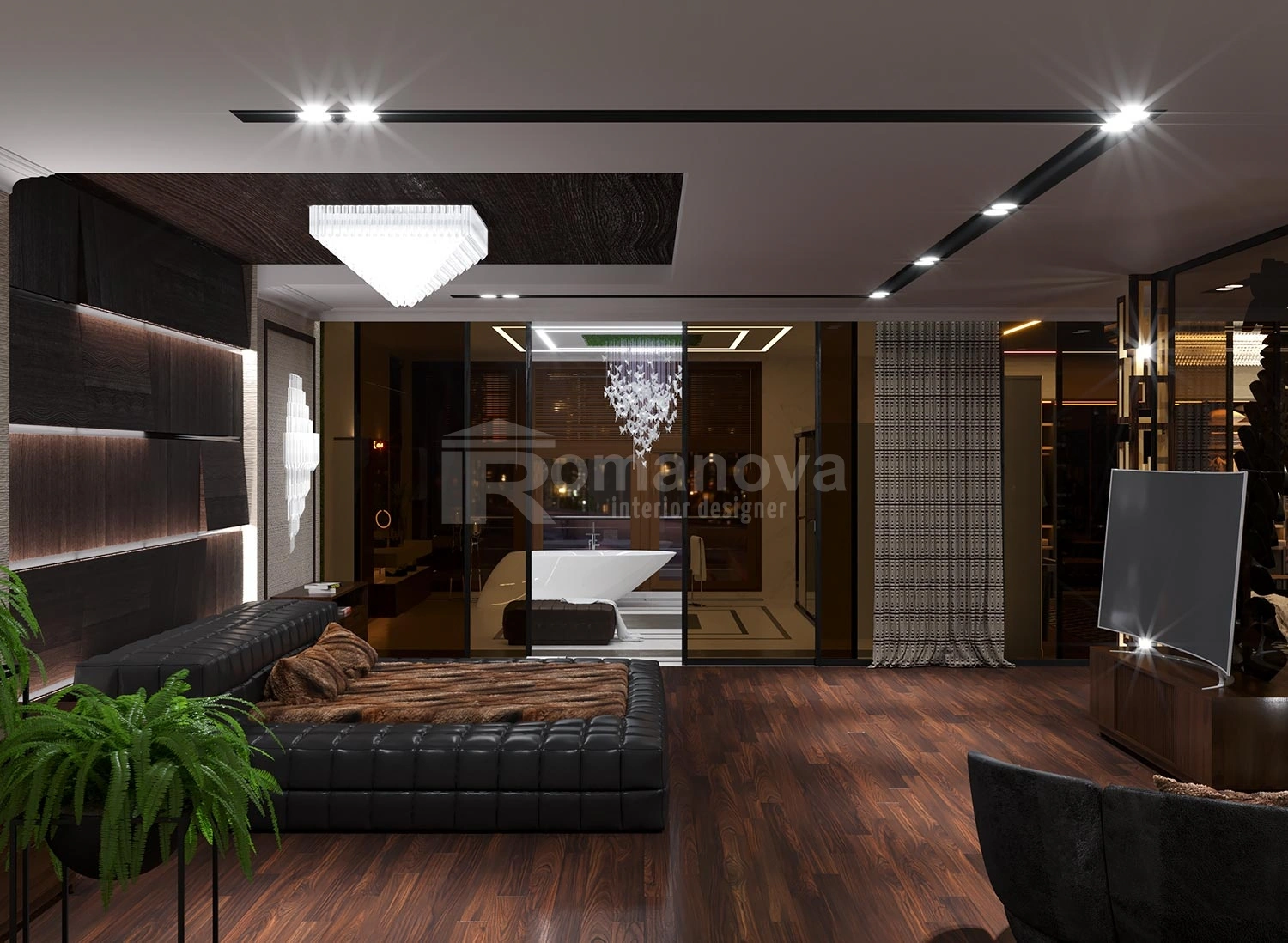 Для дизайна интерьера спальни было применено зонирование пространства, за счет чего одно большое и неуютное помещение теперь имеет несколько зон, в итоге помещение смотрится визуально цельным, ёмким, уютным, стильным. Дизайнером Ириной Романовой, были применены больших габаритов мягкая мебель, отделанная кожей черного цвета, в том же черном цвете мягкую мебель дополняют предметы интерьера: подвесной камин, напольная больших размеров скульптура, напольная подзорная труба и некоторая дополнительная мебель, такая как встроенный книжный шкаф для книг. Придя после работы хозяину будет очень приятно посидеть у камина, наслаждаясь прекрасными видами из своих панорамных окон, любуясь ночным городским мегаполисом. В интерьере спальни помимо черного цвета, применён ещё и темно-коричневый цвет для мебели, а также для отделки пола и частичной отделки стен и потолка.