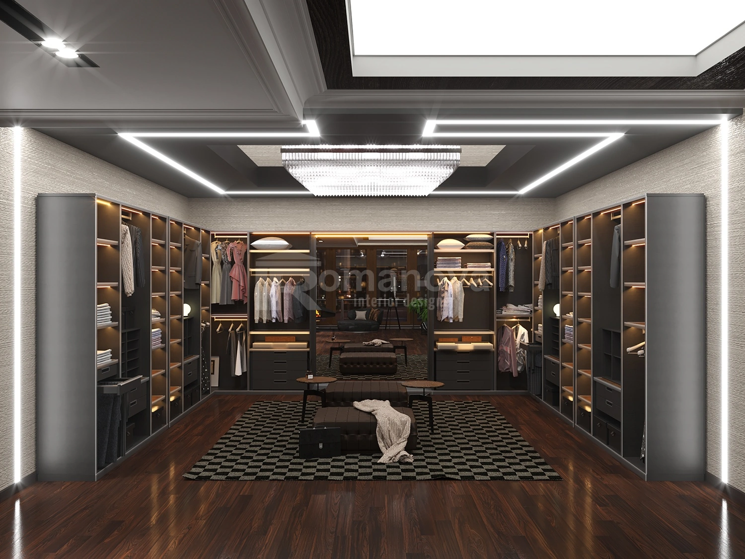Разноплановое освещение в потолочной части для остальных помещений приватной зоны, а именно в ванной комнате и гардеробной так же имеют дизайн элементы, привносящие масштабность помещениям.