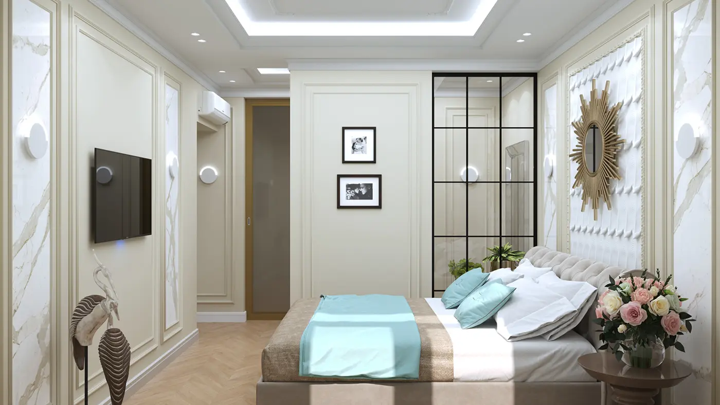 Интерьер спальни имеет спокойную цветовую палитру, но при этом выглядит достаточно ярко и стильно за счёт декоративного оформления. Для декора комнаты были применены лепные элементы и глянцевая венецианская фактура с имитацией благородного мрамора.