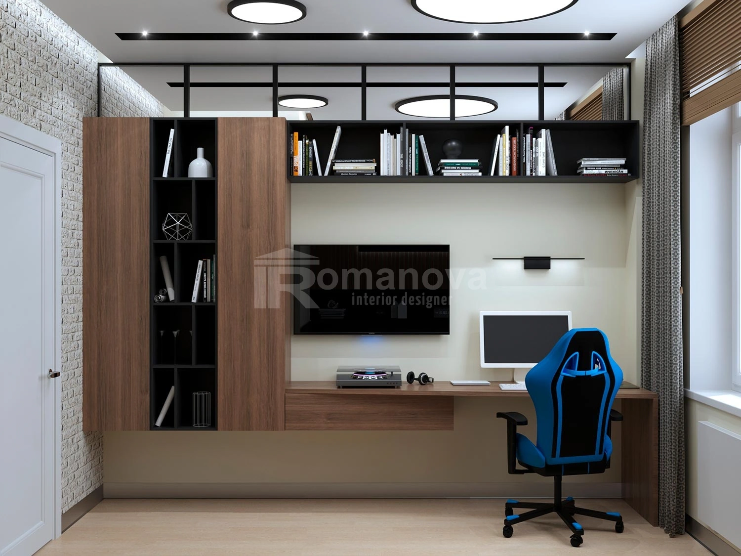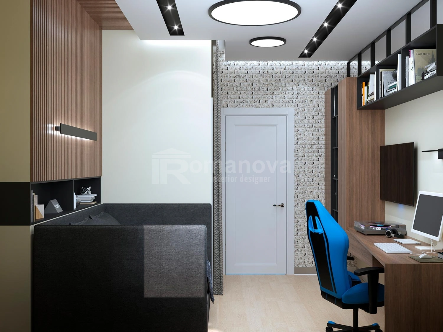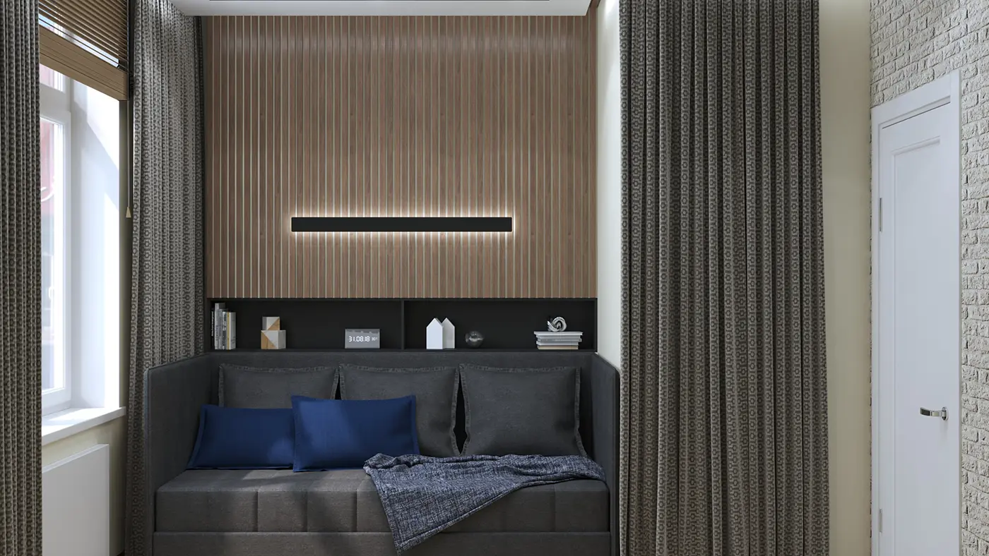 Что касается интерьера детской комнаты, то проект разработан совершенно в другом стилистическом направлении – это тандем двух современных стилей минимализм и лофт.