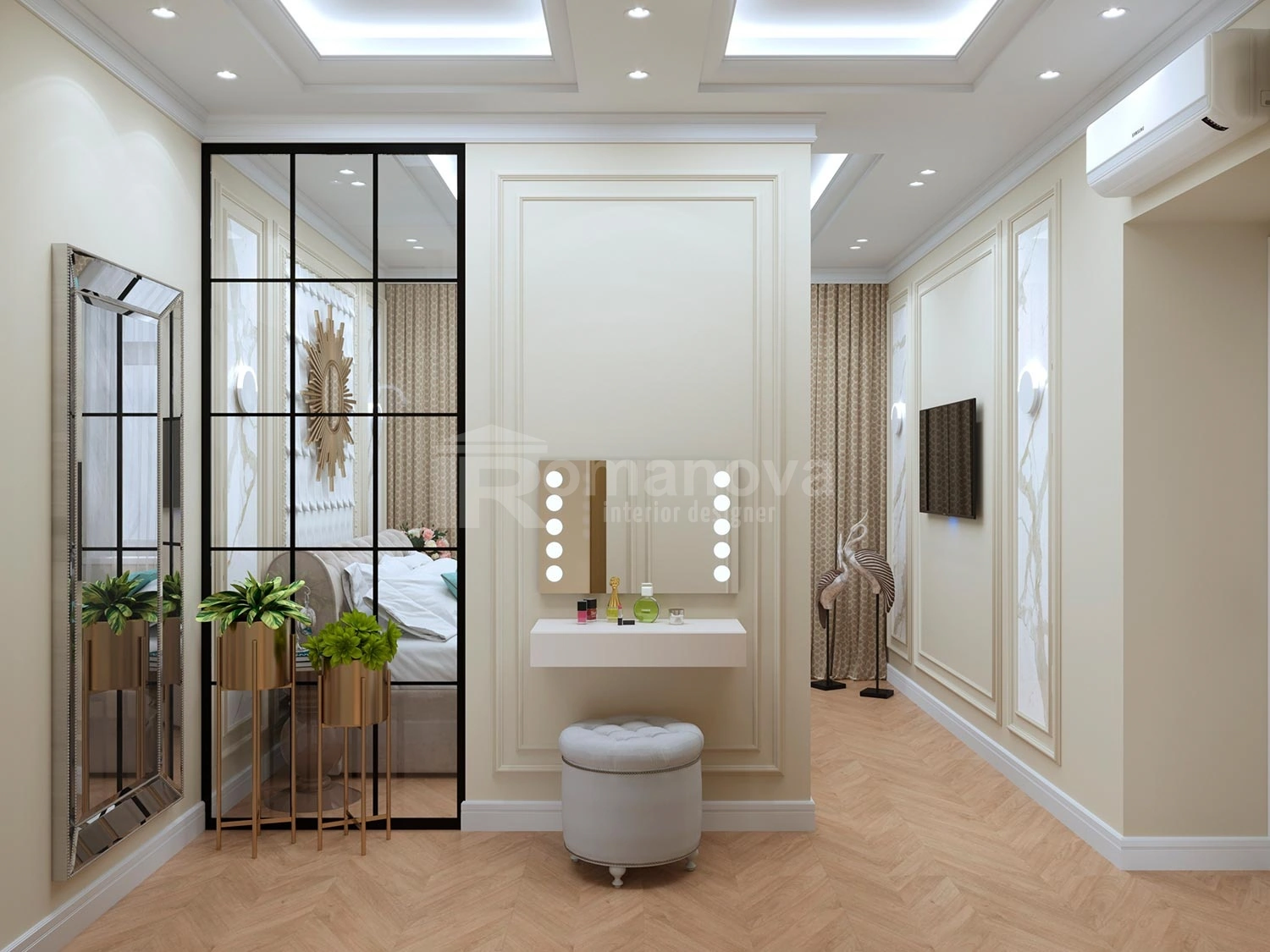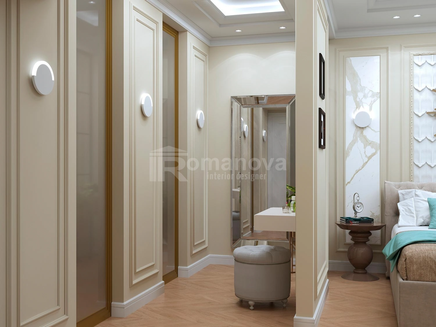 Дизайн интерьера квартиры в стиле неоклассика разработан дизайнером интерьера Ириной Романовой для молодой пары с ребёнком подросткового возраста.