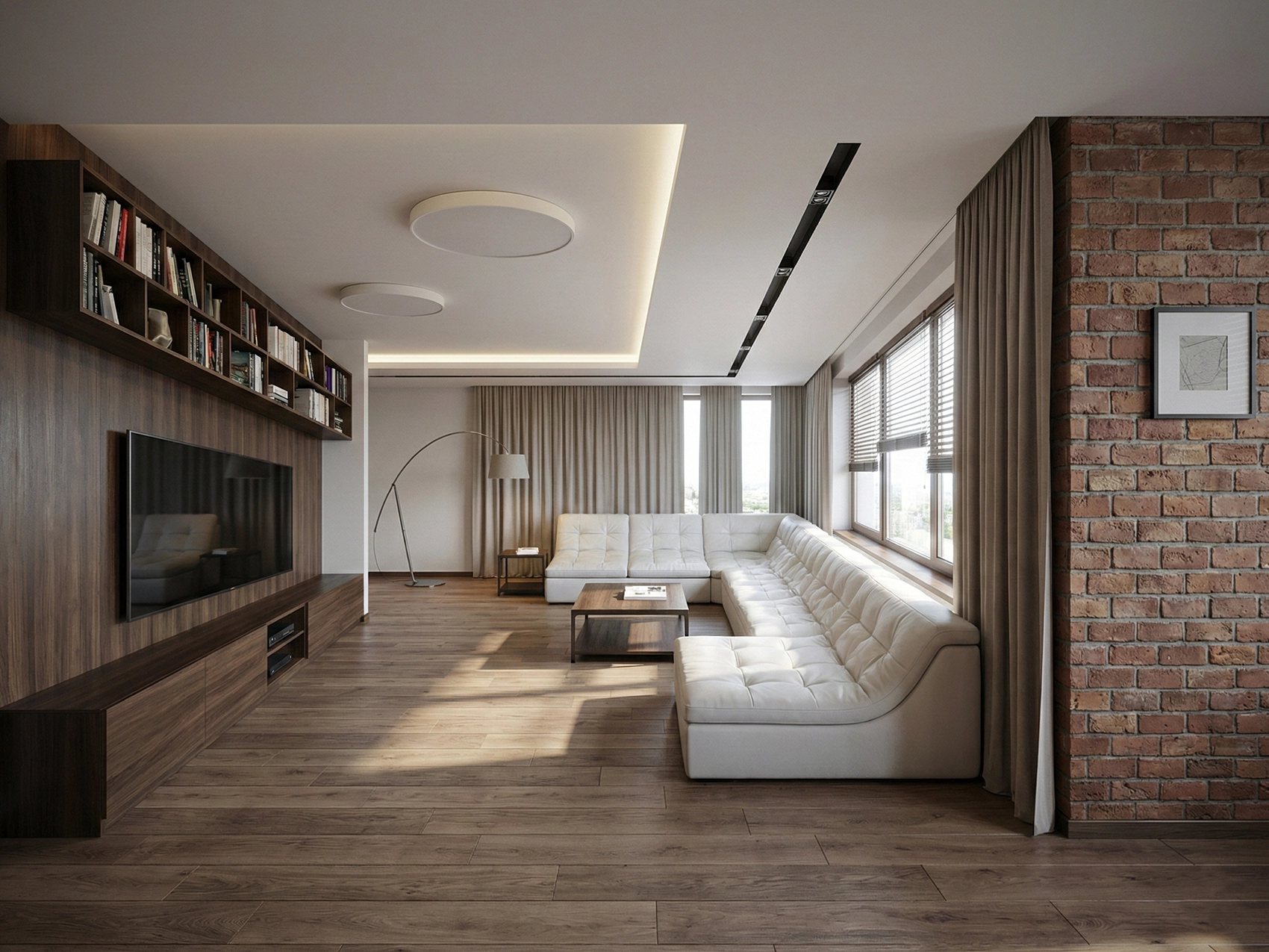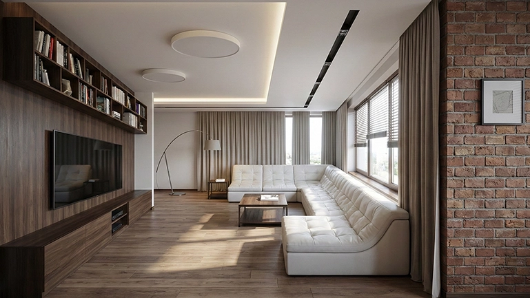 Главным элементом зоны отдыха стал большой угловой диван светлого оттенка. Его форма подчёркивает геометрию пространства и создаёт ощущение защищённости. Светлая обивка из практичной ткани уравновешивает насыщенные тёмные оттенки дерева и кирпича, создавая необходимый баланс теплоты.