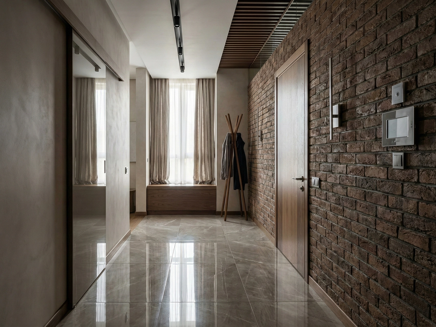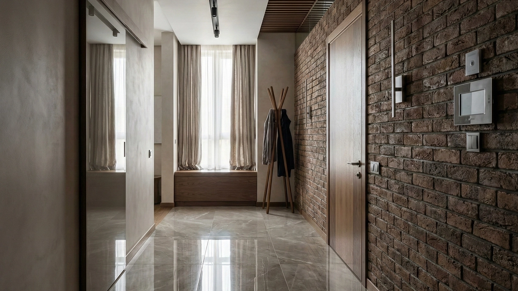 Прихожая и коридор в этом дизайн-проекте выполняют не только функциональную, но и эмоциональную роль. Именно с этих зон начинается знакомство с интерьером квартиры. Я использовала сочетание кирпичной кладки, дерева и нейтральных стен, чтобы создать эффект глубины и архитектурной выразительности.