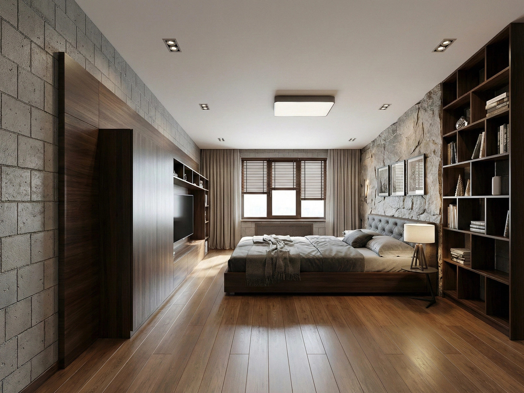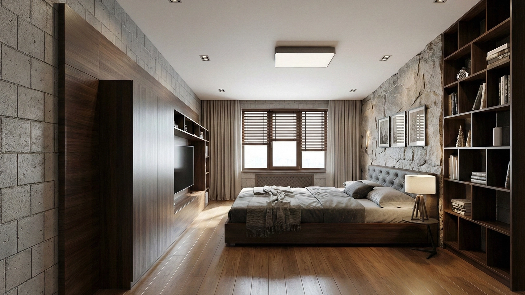 Спальня отца оформлена в спокойной, сдержанной палитре. Здесь нет ярких акцентов — только благородные текстуры и мягкий свет. Центральным элементом стала кровать с мягким изголовьем. За ней расположена акцентная стена с фактурой натурального камня, которая добавляет интерьеру глубину и статусность.