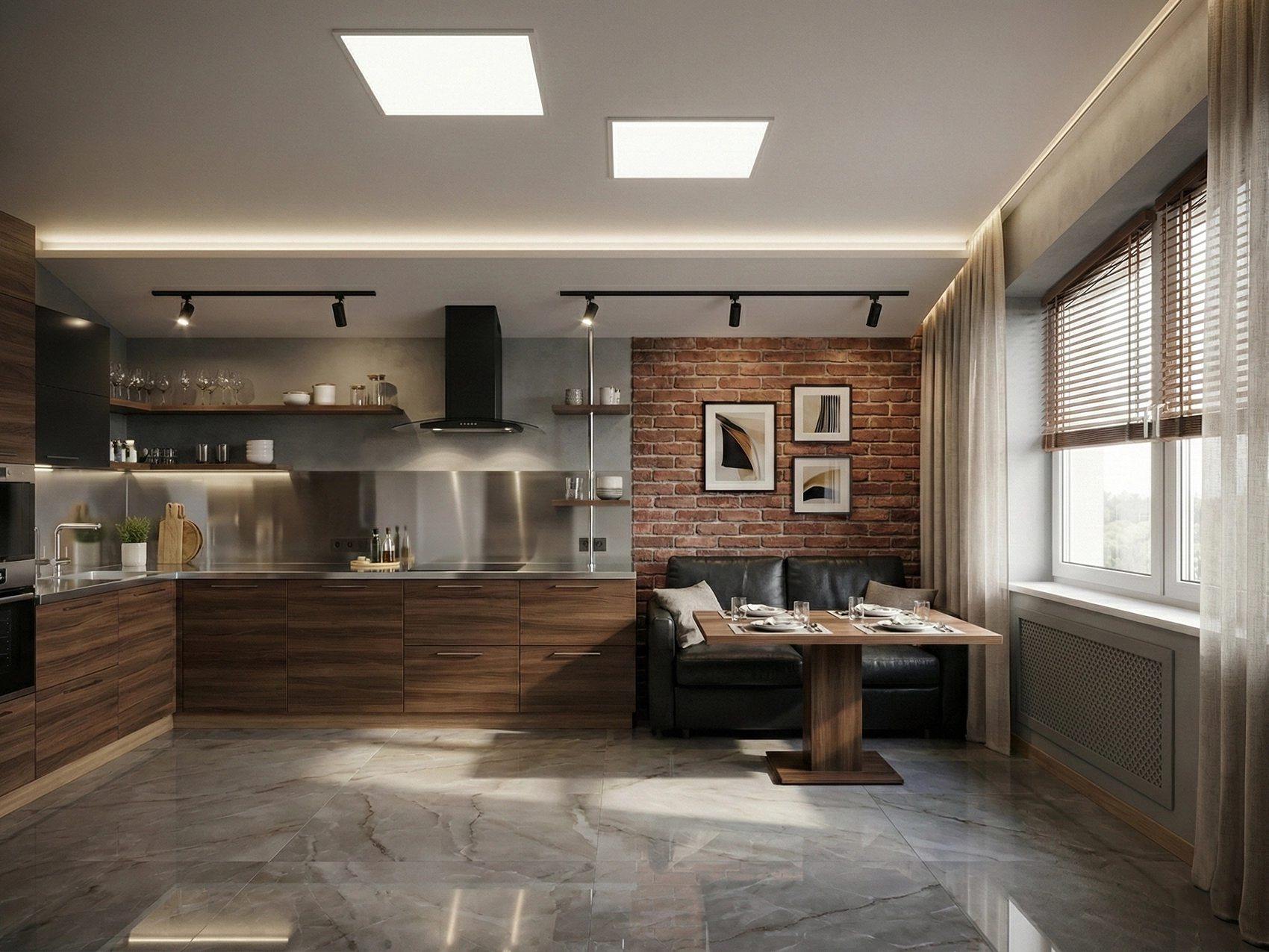 Обеденная зона оформлена компактно, но комфортно. Мягкий диван у кирпичной стены создаёт уютную атмосферу и визуально отделяет кухню от остального пространства. Это решение особенно удобно для повседневных приёмов пищи и неформального общения, реализуя настоящий современный дизайн интерьера дома в рамках городского пространства.