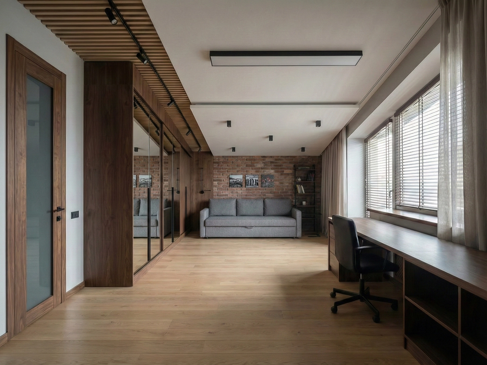 В этой комнате я использовала более динамичные, но всё же сдержанные решения. Кирпичная стена добавляет брутальности, а тёплое дерево уравновешивает индустриальные нотки. Рабочая зона организована у окна, что обеспечивает хорошее естественное освещение. Места хранения продуманы таким образом, чтобы подросток мог самостоятельно поддерживать порядок без лишних усилий.