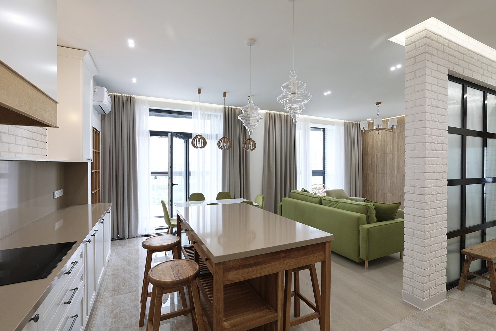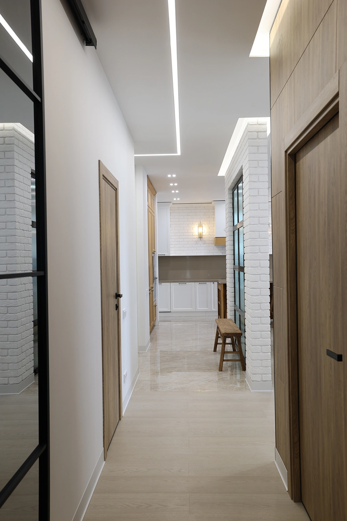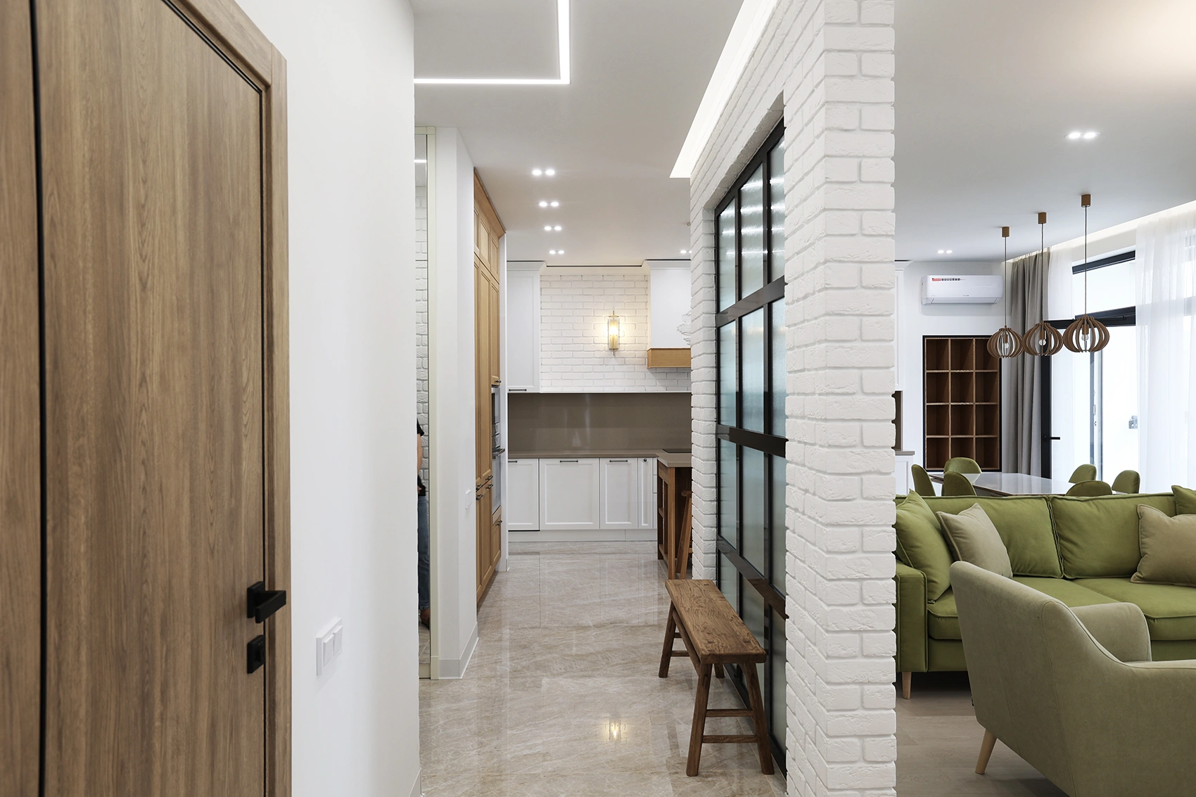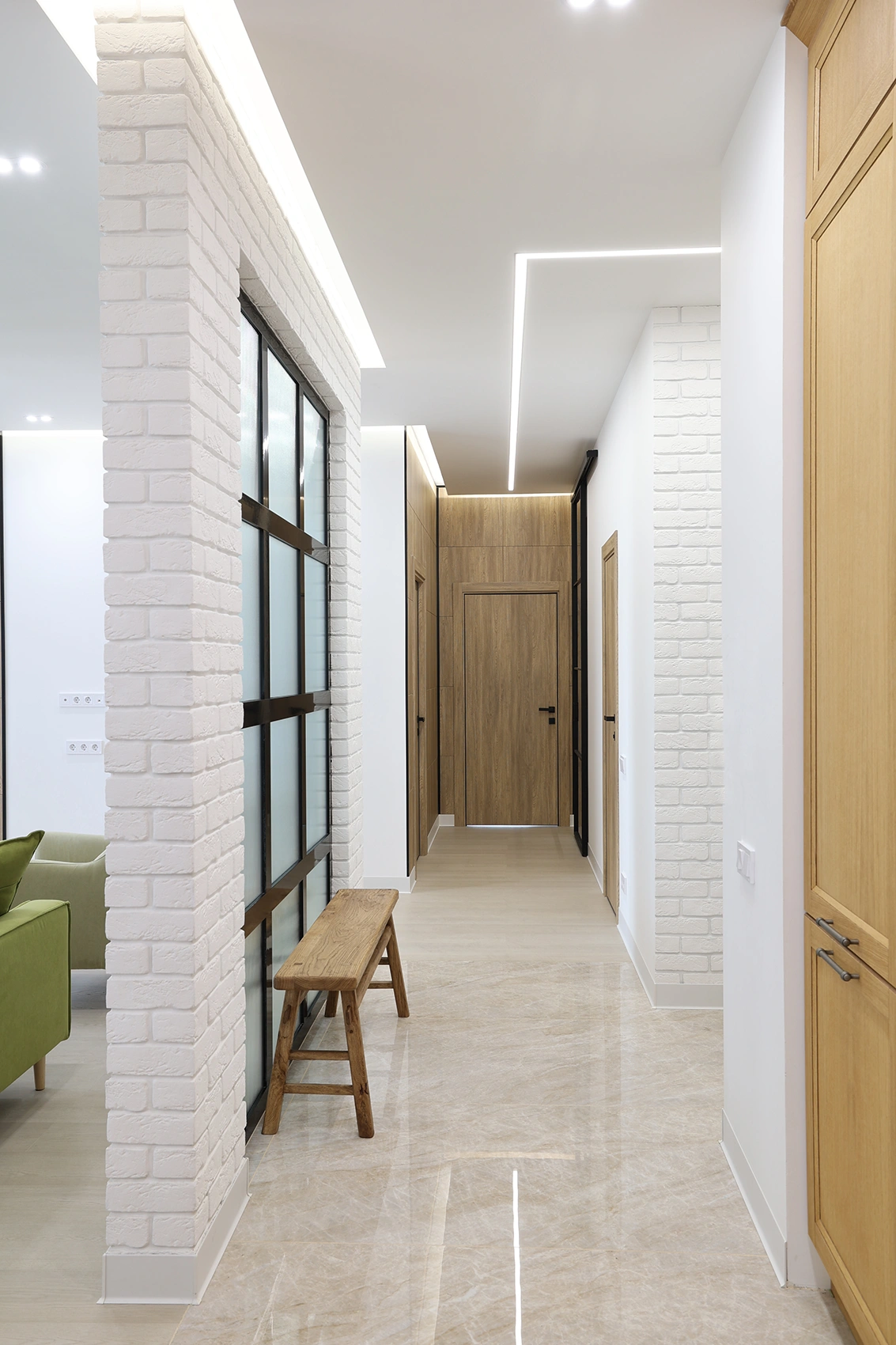 Для оформления квартиры были применены такие отделочные материалы как искусственный камень в виде кирпича, шпонированные панели, фреска, покраска, крупноформатный керамогранит в глянцевом исполнении, паркетная доска, приятные текстуры для обивки мягкой мебели и штор, а также разноплановое освещение, которое спроектировано с учётом разных групп включения света, что очень комфортно в быту.