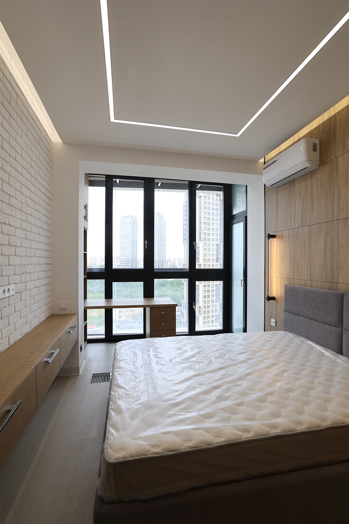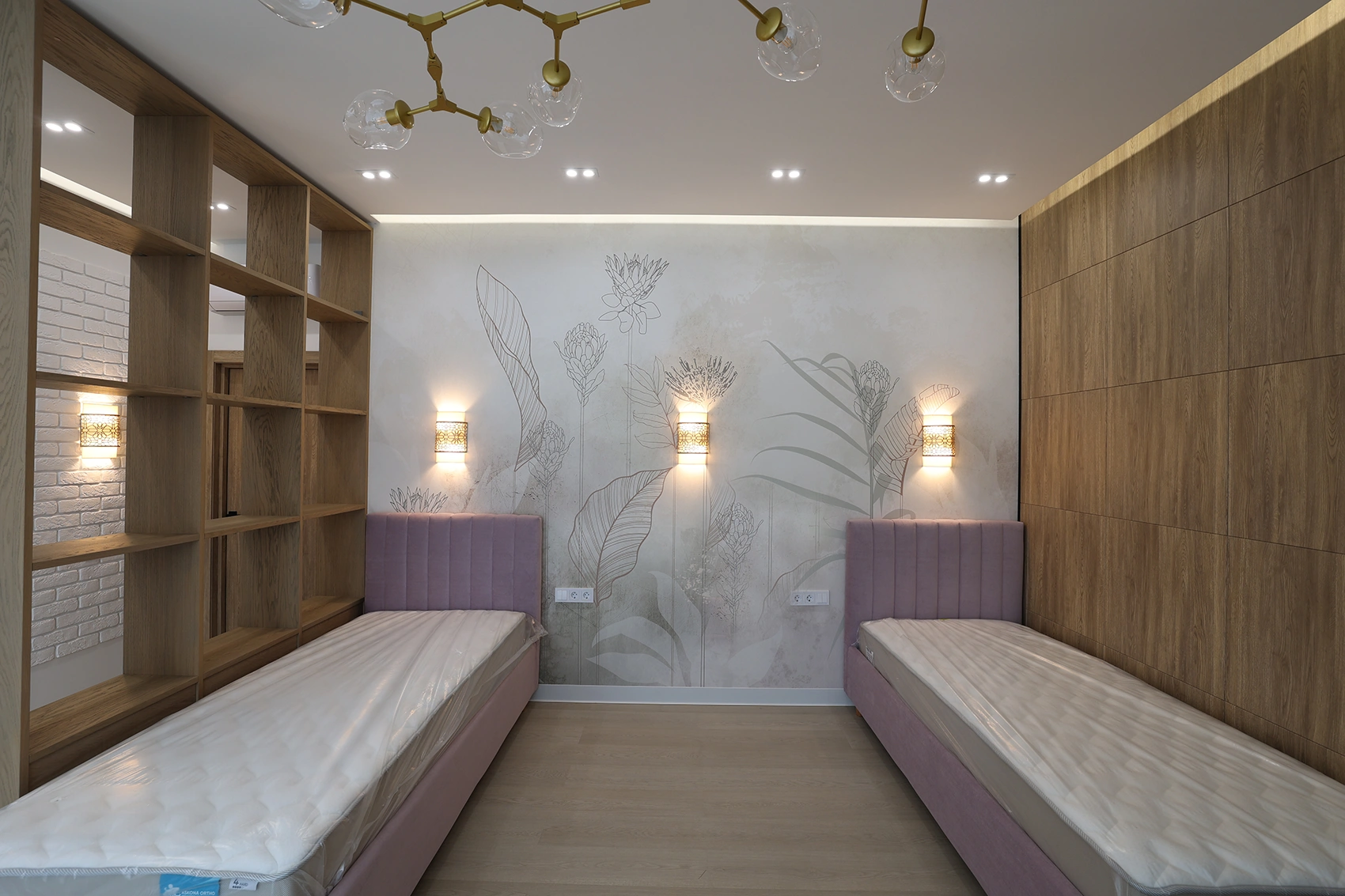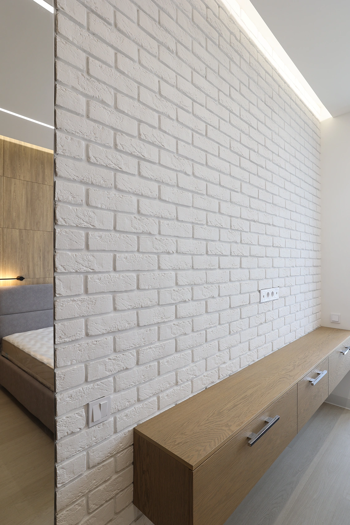 Для оформления квартиры были применены такие отделочные материалы как искусственный камень в виде кирпича, шпонированные панели, фреска, покраска, крупноформатный керамогранит в глянцевом исполнении, паркетная доска, приятные текстуры для обивки мягкой мебели и штор, а также разноплановое освещение, которое спроектировано с учётом разных групп включения света, что очень комфортно в быту.