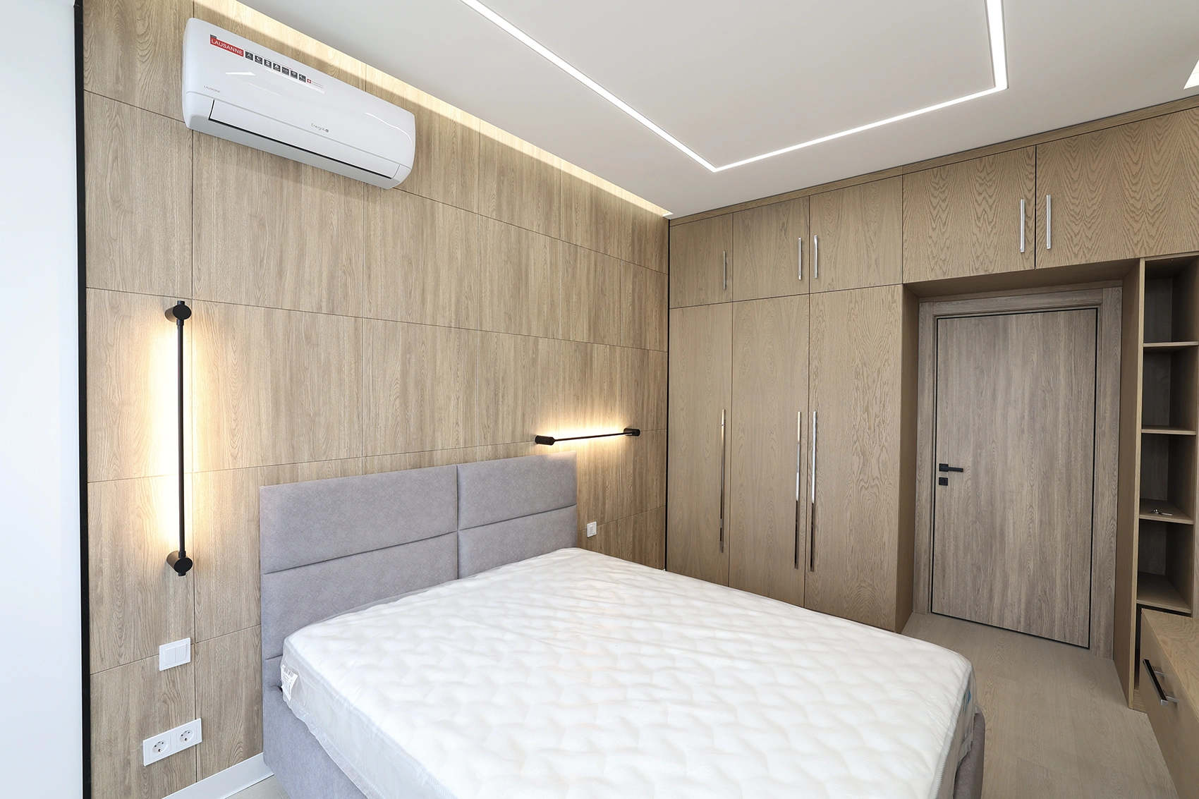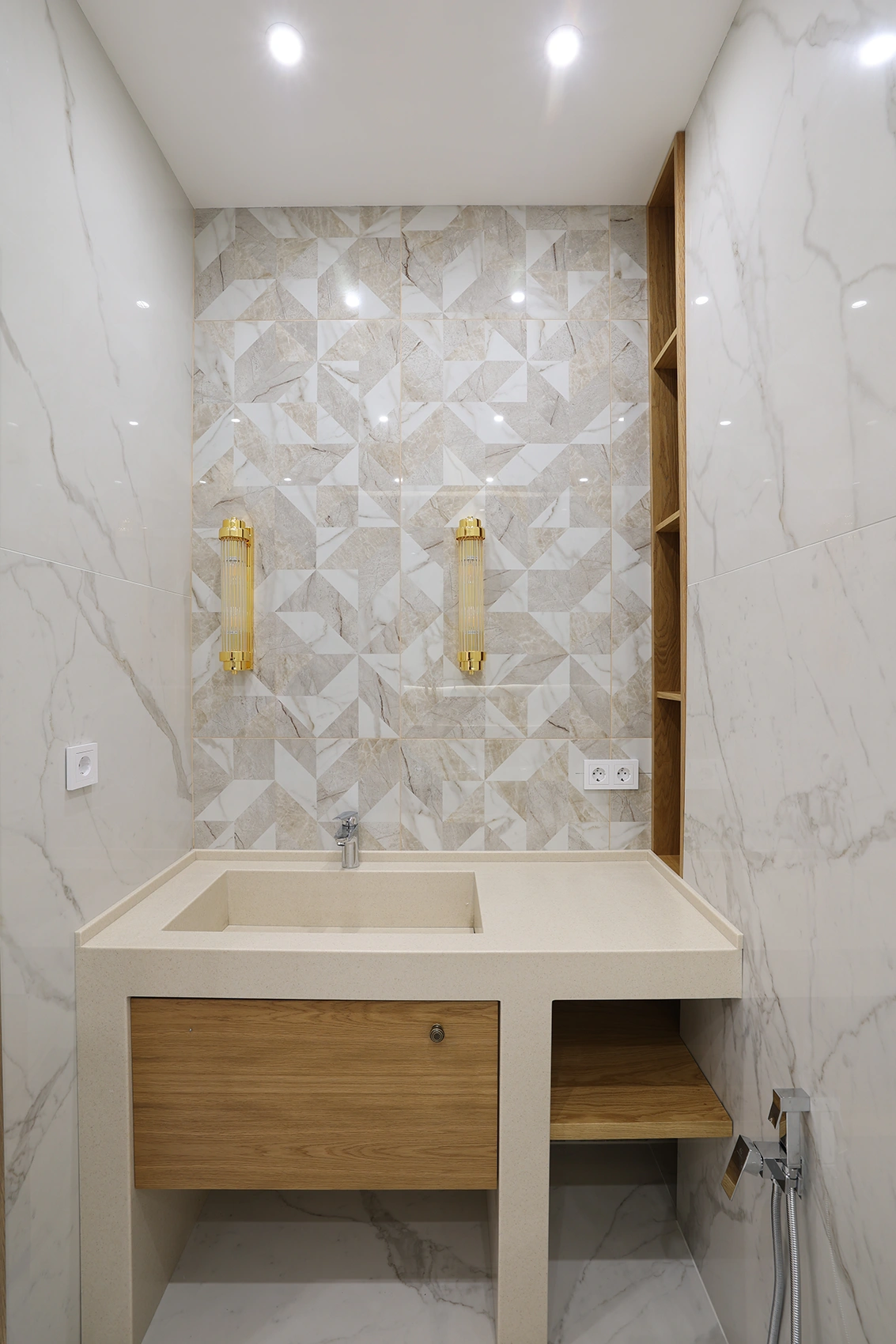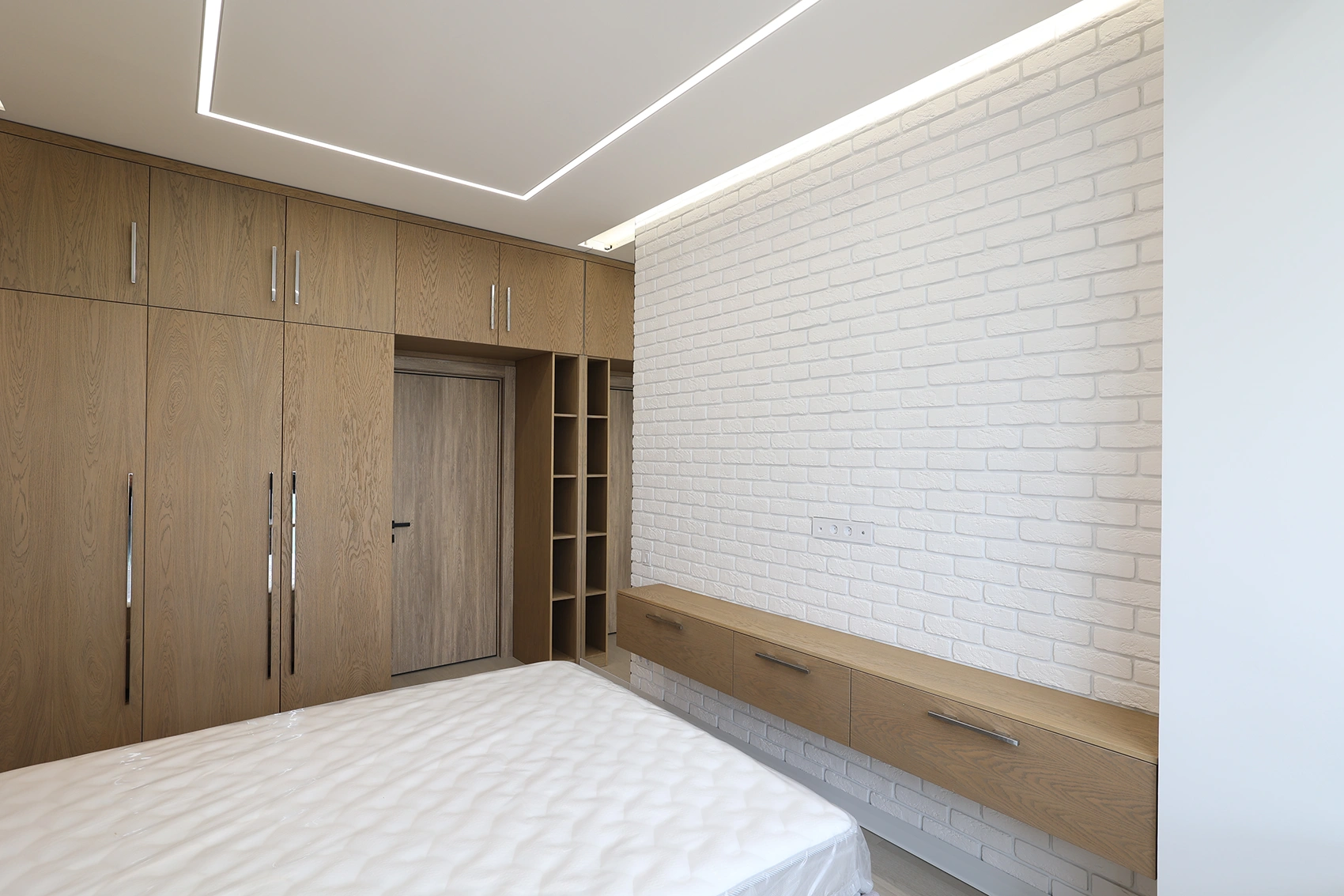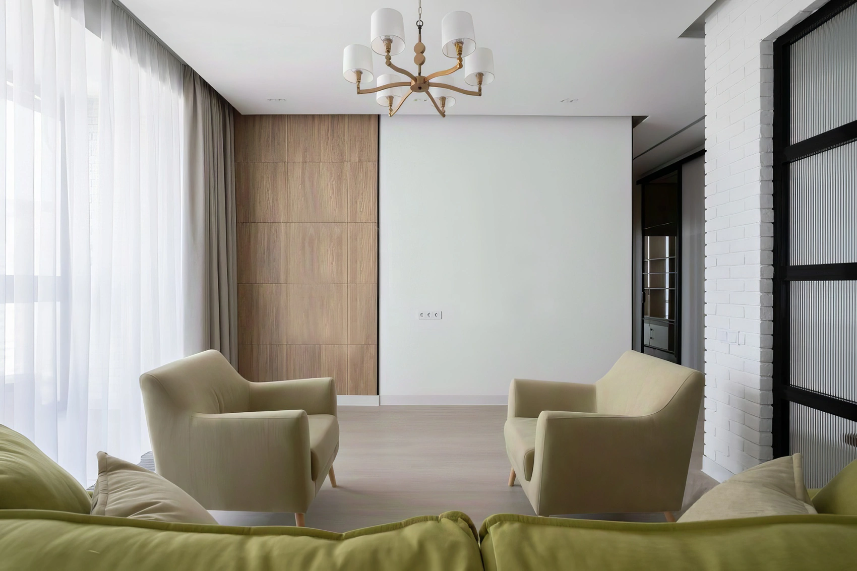 Для оформления квартиры были применены такие отделочные материалы как искусственный камень в виде кирпича, шпонированные панели, фреска, покраска, крупноформатный керамогранит в глянцевом исполнении, паркетная доска, приятные текстуры для обивки мягкой мебели и штор, а также разноплановое освещение, которое спроектировано с учётом разных групп включения света, что очень комфортно в быту.