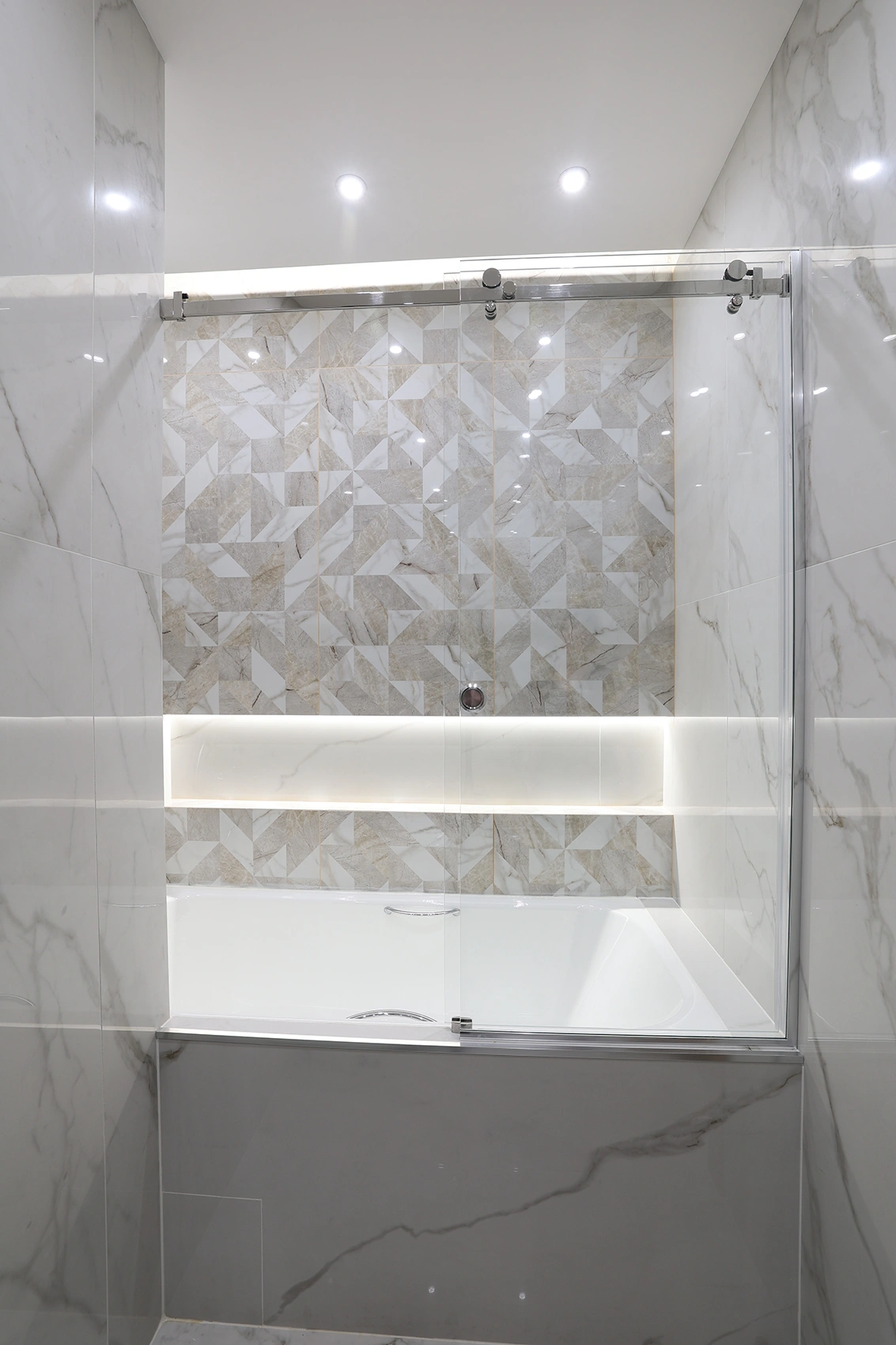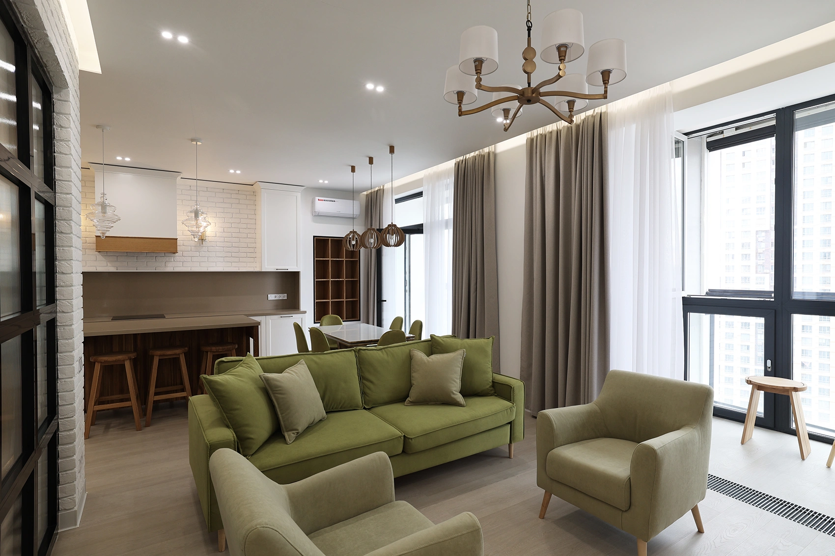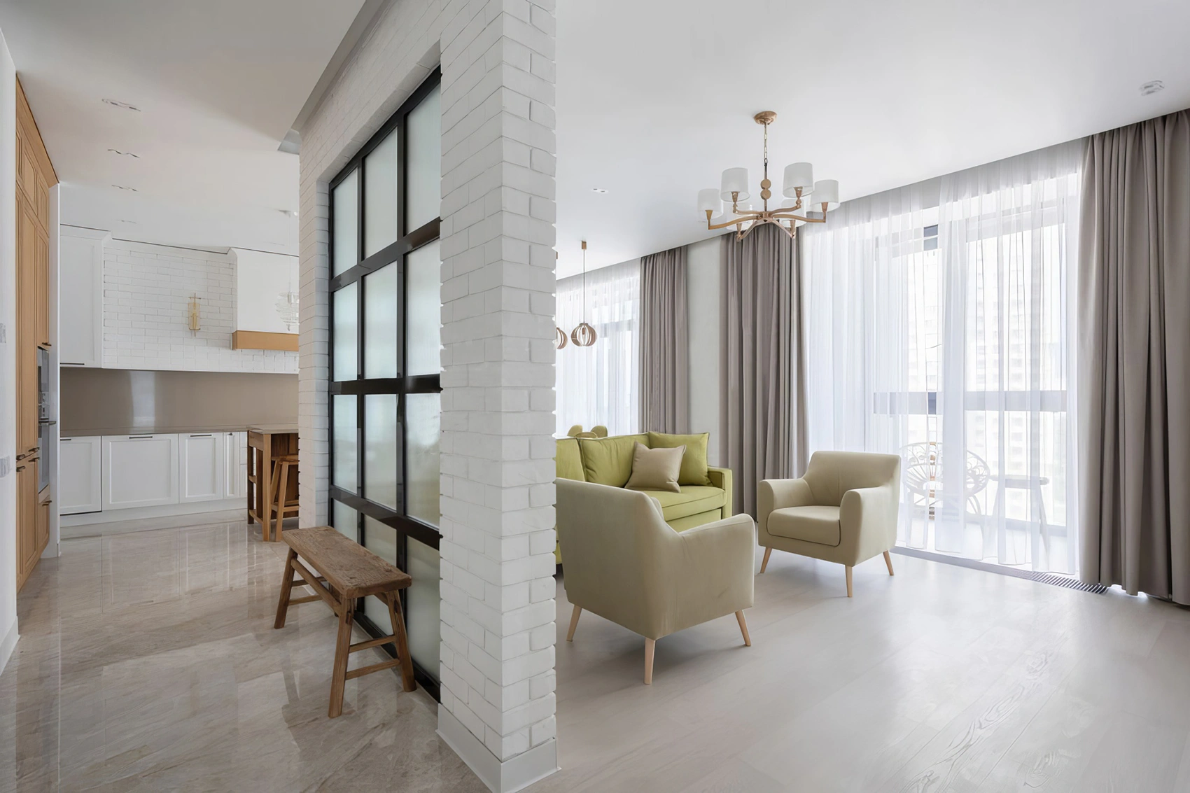 Планировочное решение для квартиры разработано с учётом всех пожеланий заказчиков. Главной задачей стояло объединение сразу нескольких зон в квартире – это прихожая, гостиная, кухня и балкон. Подобное объединение позволило ещё больше визуально увеличить площадь квартиры. Для комфортного нахождения в гостиной зоне, между прихожей и гостиной была выстроена стеновая конструкция, которая зонирует данные пространства, но не нагружает его за счёт декора.
