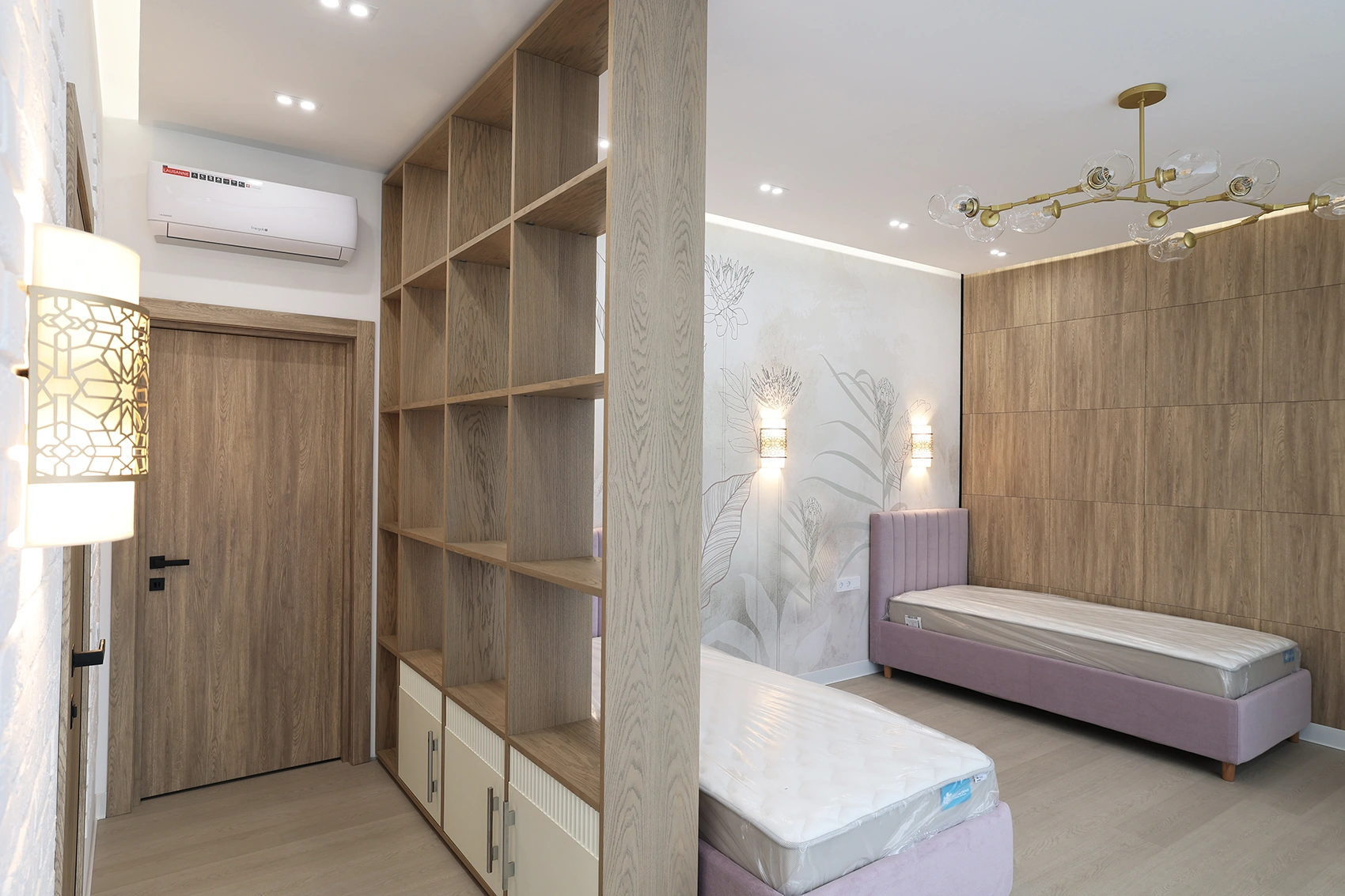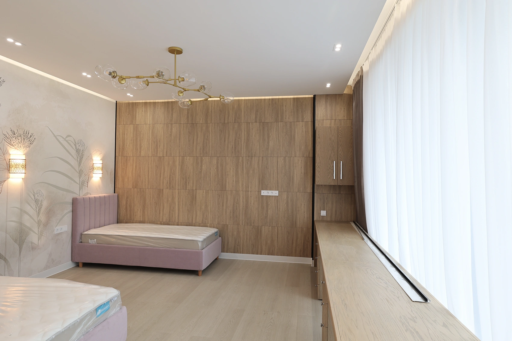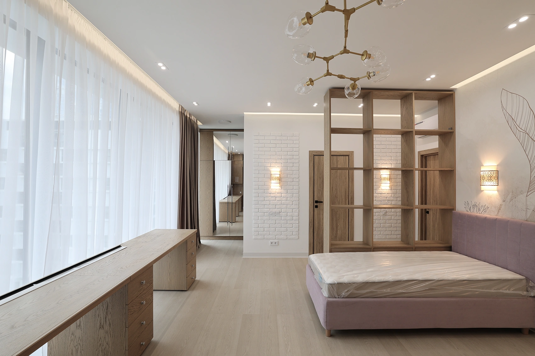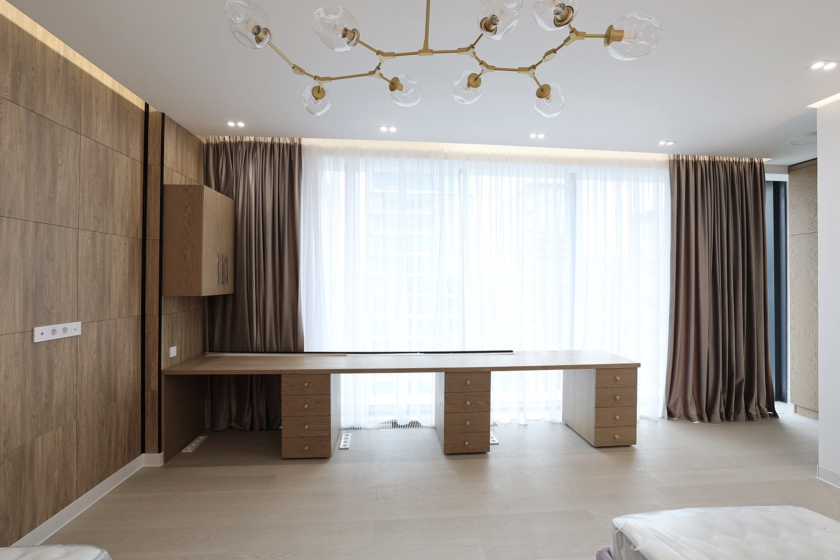 Функциональное наполнение квартиры после разработанного дизайн-проекта теперь имеет максимальное количество вместительных шкафов и конечно гардеробную комнату. Помимо платяных шкафов, комнаты укомплектованы и рабочими местами, которые предназначены как для детей, так и для родителей.
