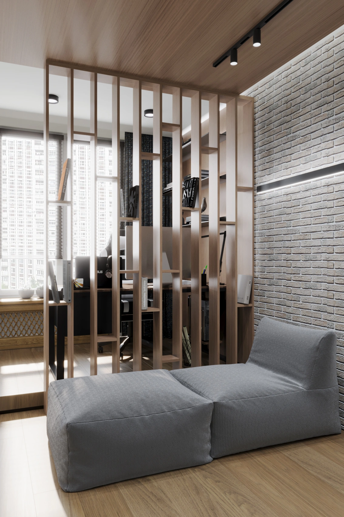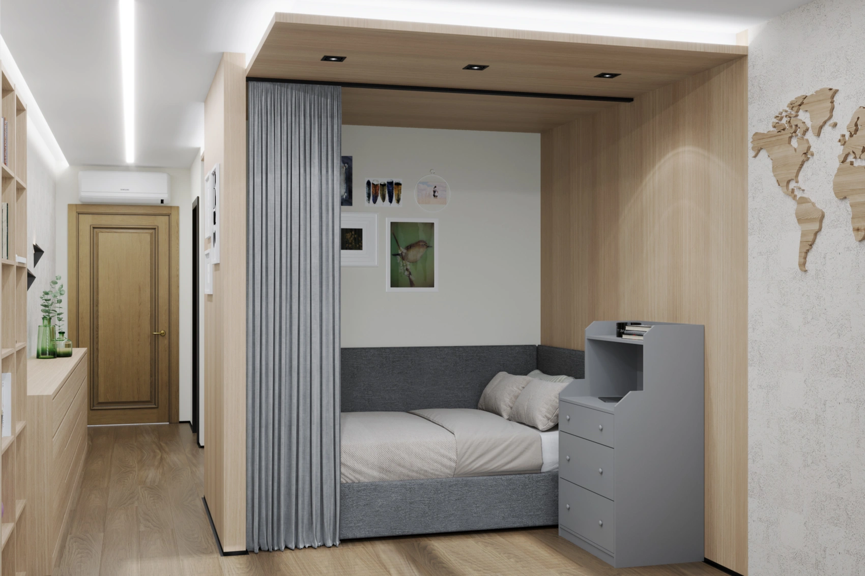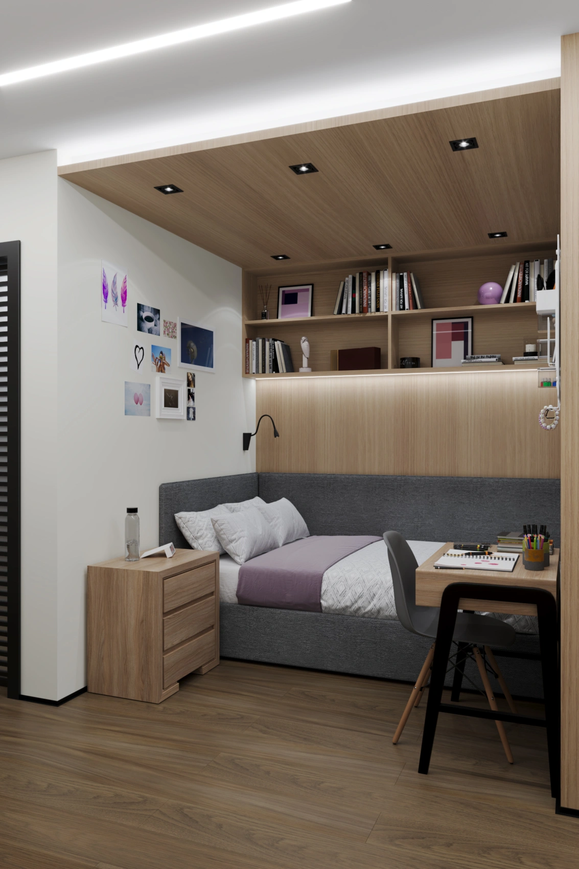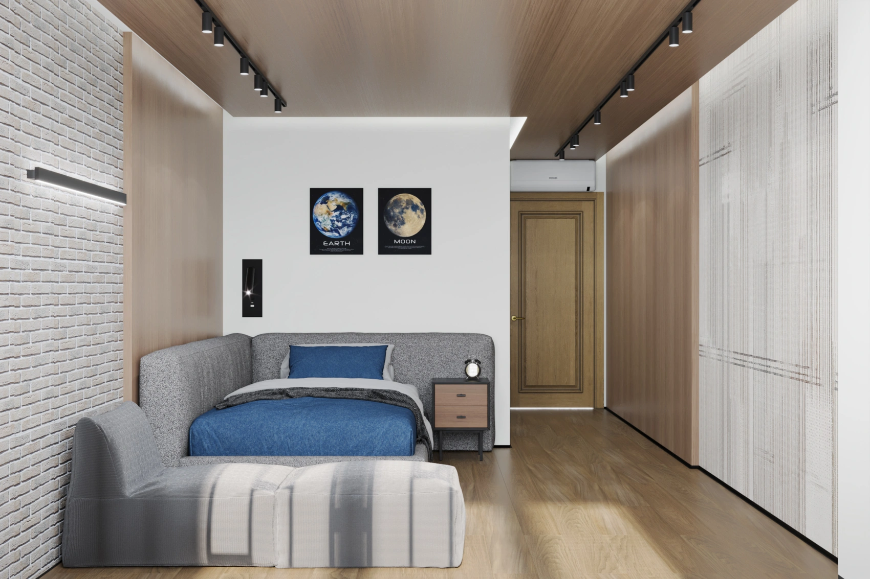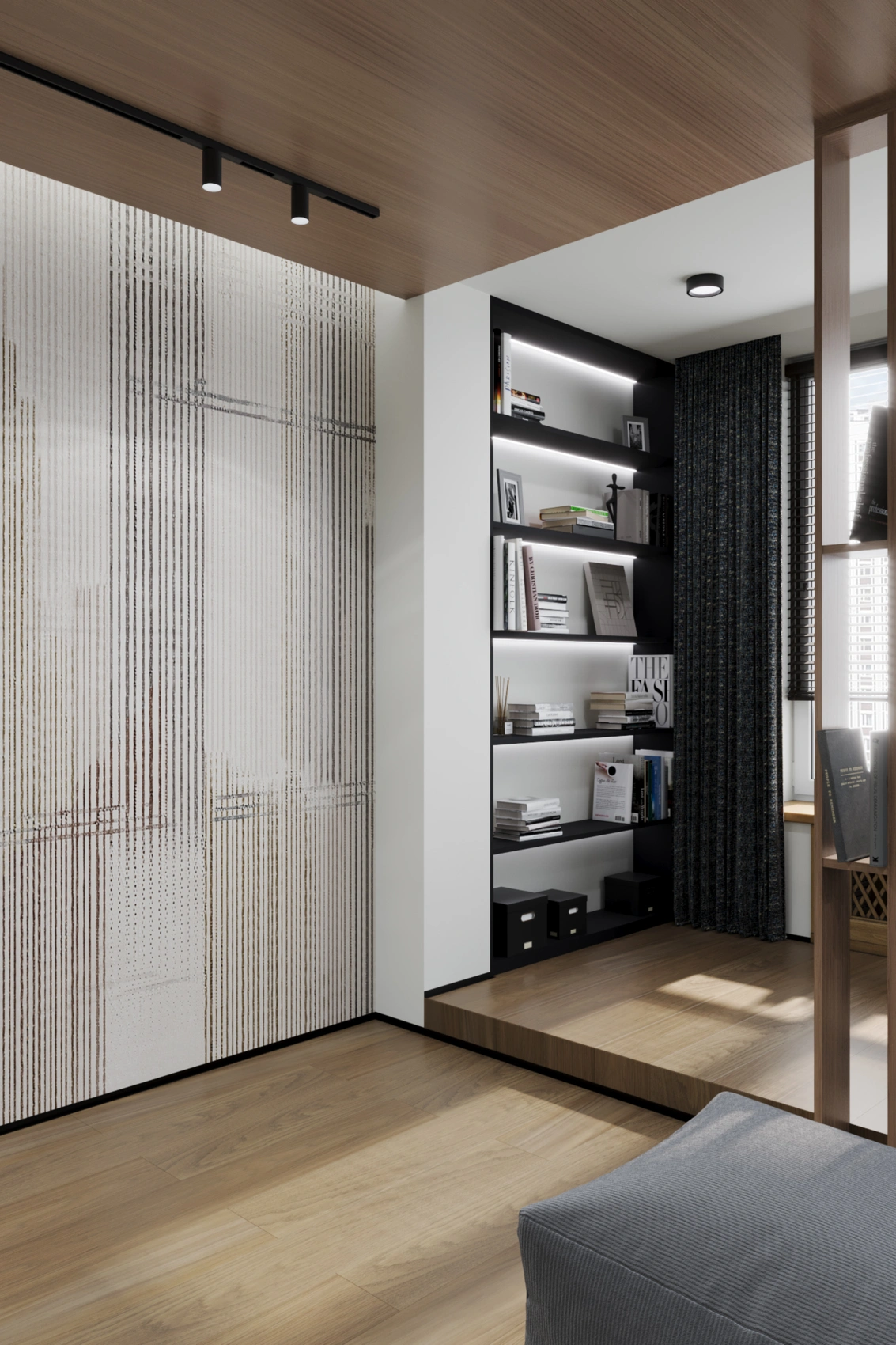 В квартире достаточное количество помещений, для которых был применён индивидуальный подход. Основным пожеланием хозяев был отказ от телевизоров во всех помещениях и применение био-камина в гостиной. Для детей, в частности дочек, было пожелание применение зонирования под их принципиальные нужды, но с объединением в единую концепцию, так как комната является их общей площадью.