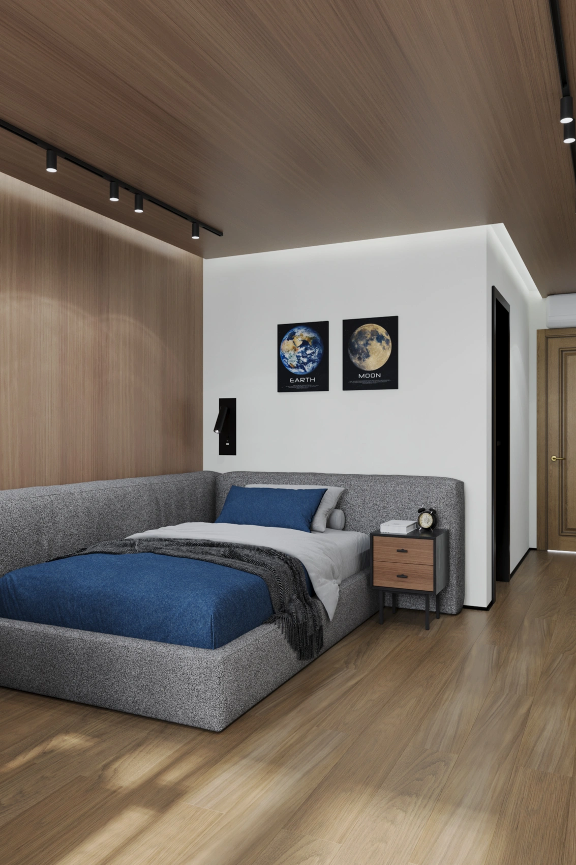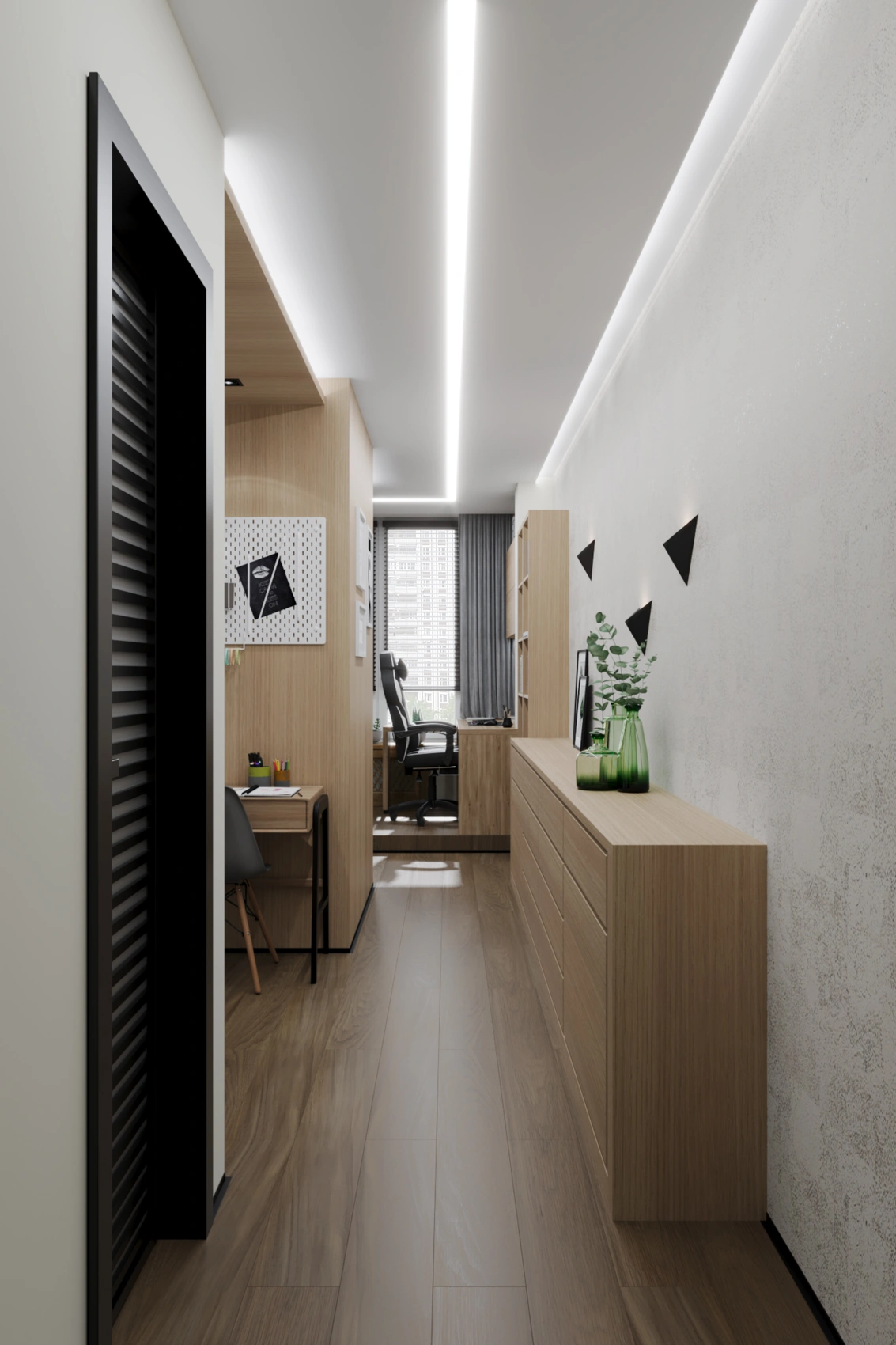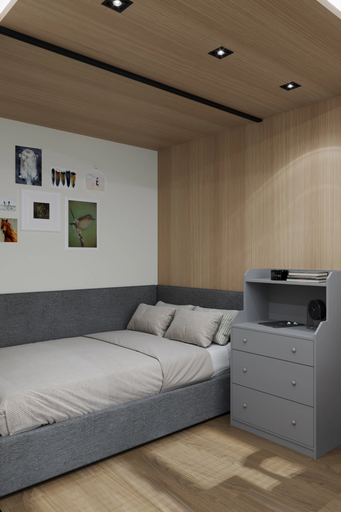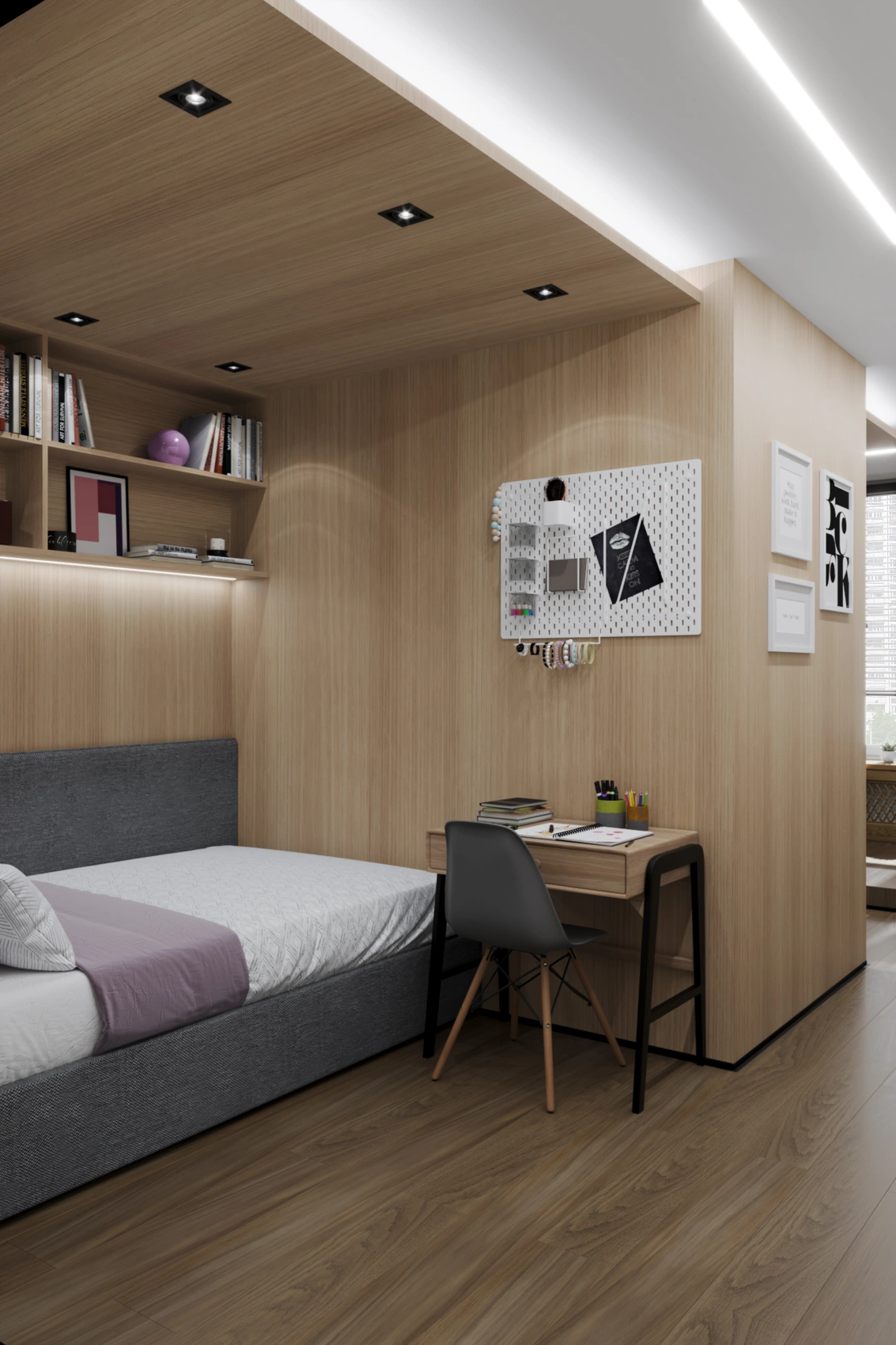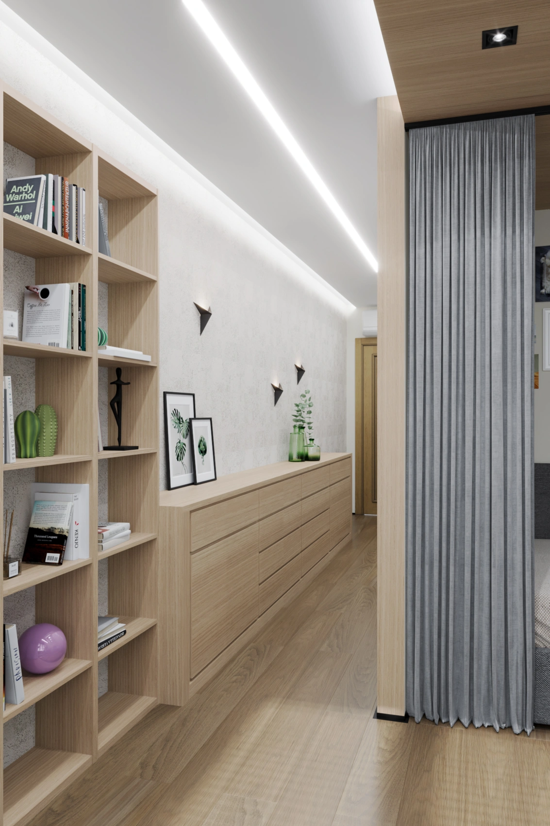 В квартире достаточное количество помещений, для которых был применён индивидуальный подход. Основным пожеланием хозяев был отказ от телевизоров во всех помещениях и применение био-камина в гостиной. Для детей, в частности дочек, было пожелание применение зонирования под их принципиальные нужды, но с объединением в единую концепцию, так как комната является их общей площадью.