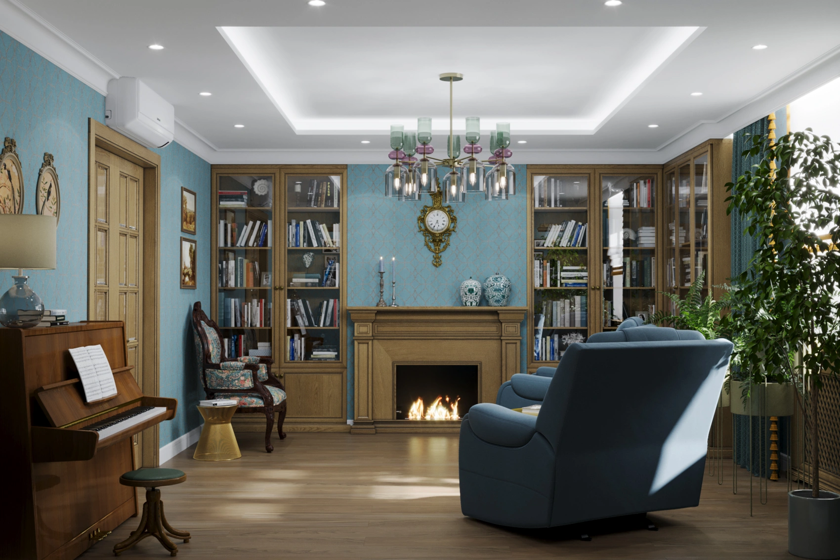 Английский стиль в сочетании с элементами шинуазри прослеживается в декоре мебели и отделки стен – это спокойные и глубокие тона, где-то контрастные, но при этом очень элегантные. Добавление био-камина в гостиной, добавляет визуального колорита и статности дому.