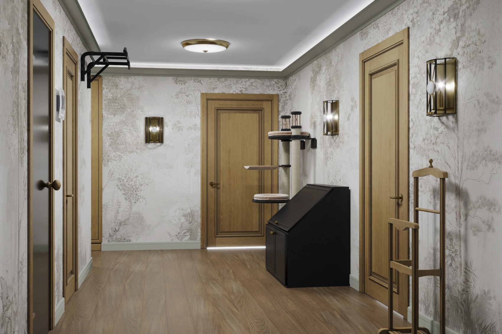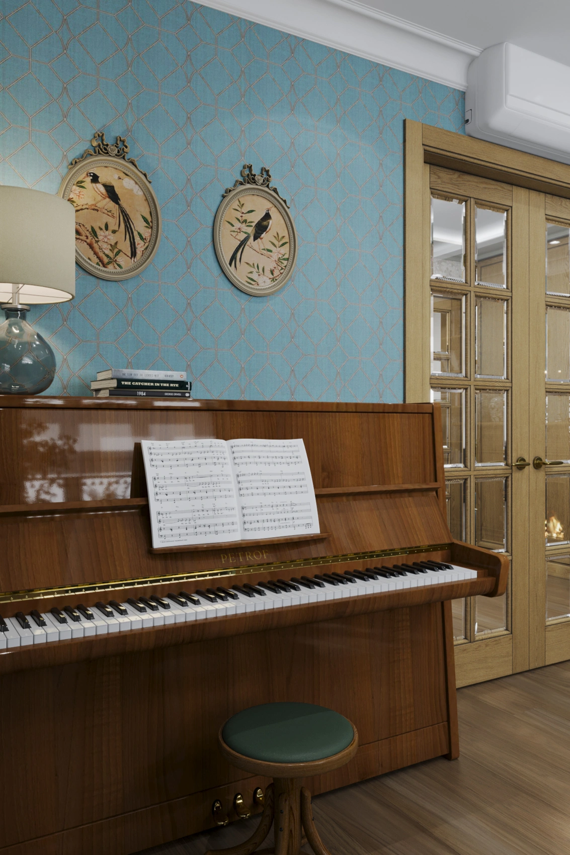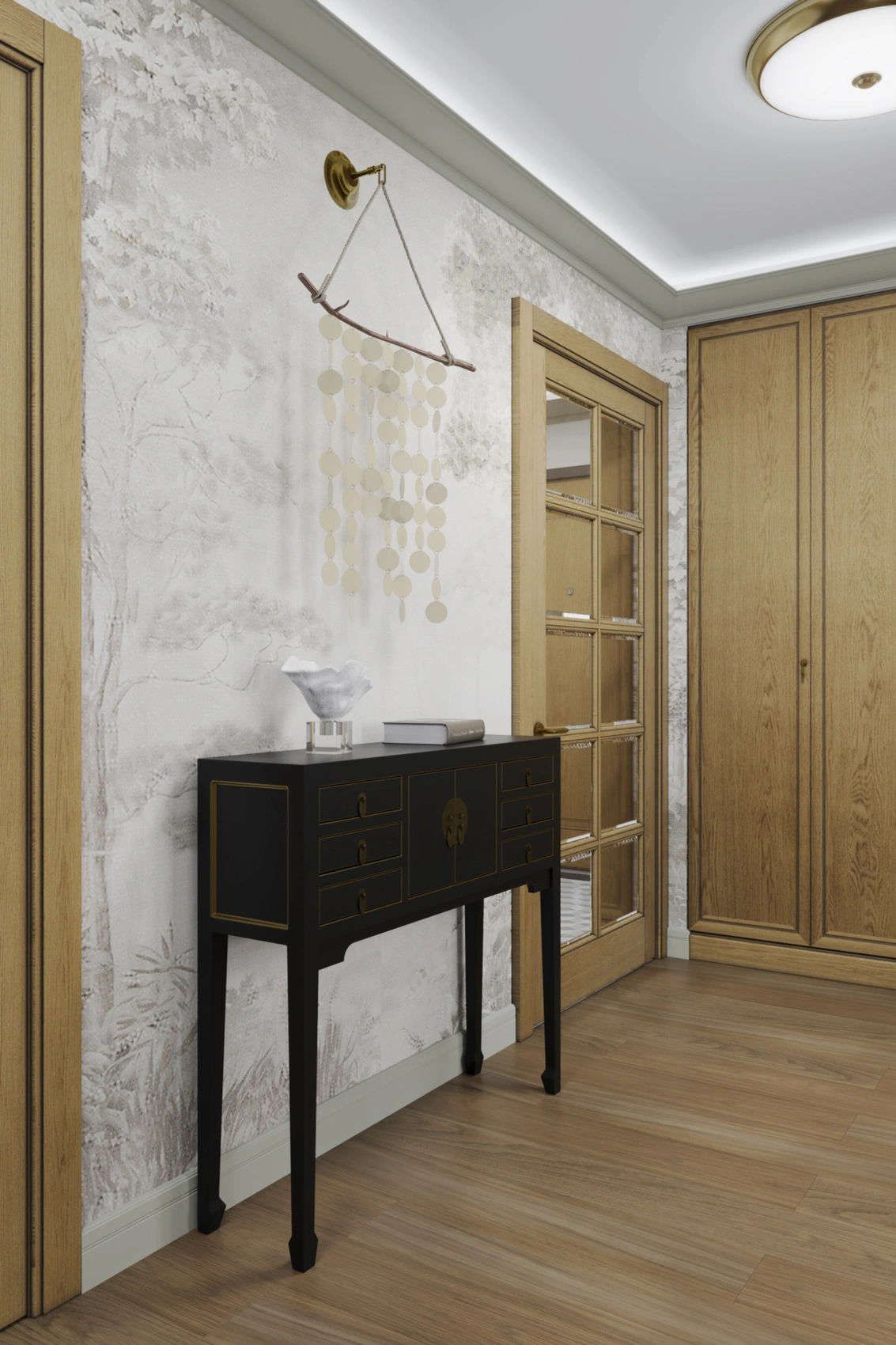 Интерьер квартиры выполнен в сочетании трёх стилистических направлений – это английская классика с добавлением стиля шинуазри для основной части квартиры и современный стиль минимализм был применён для двух детских комнат – двух дочек и сына.