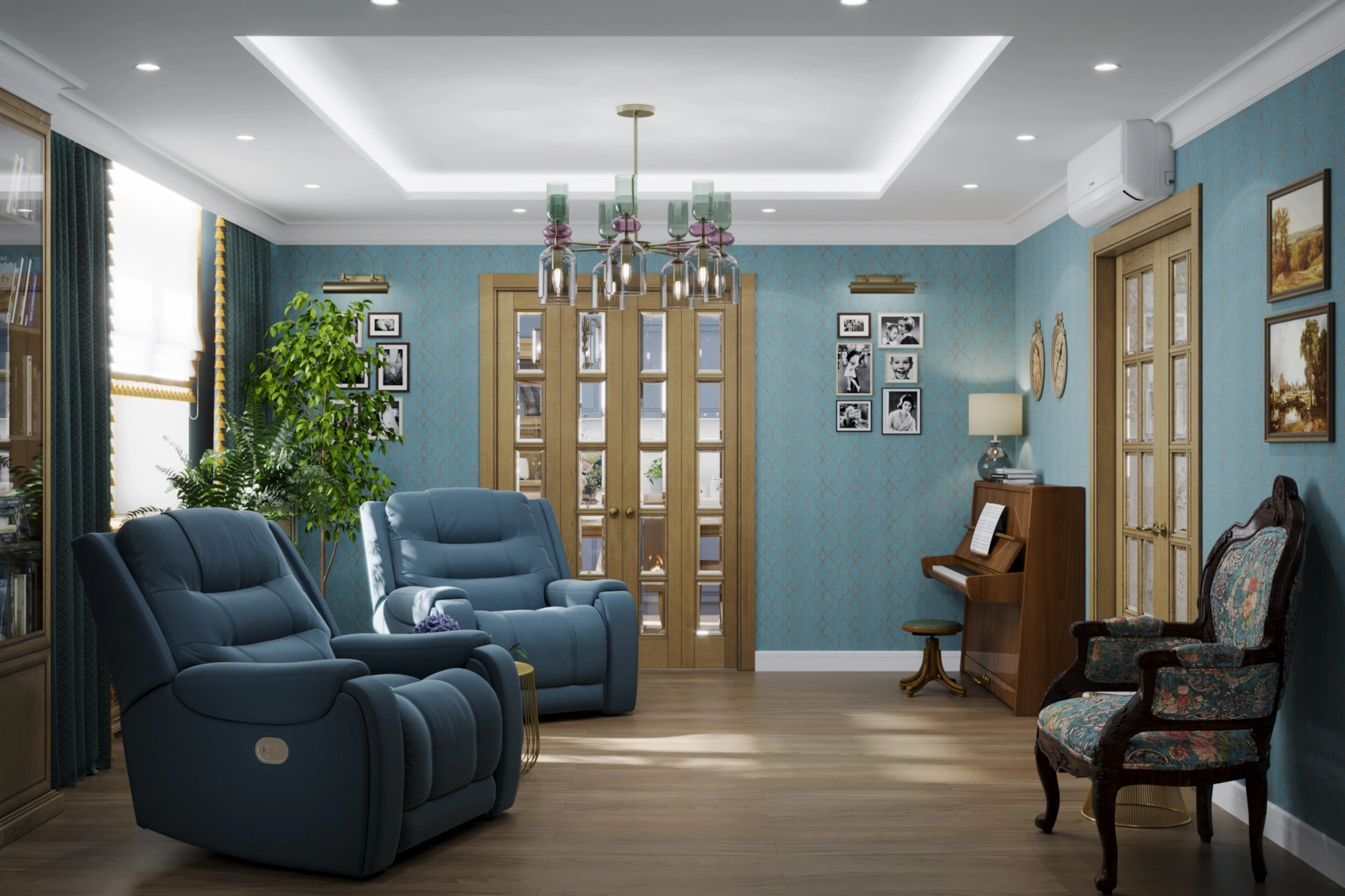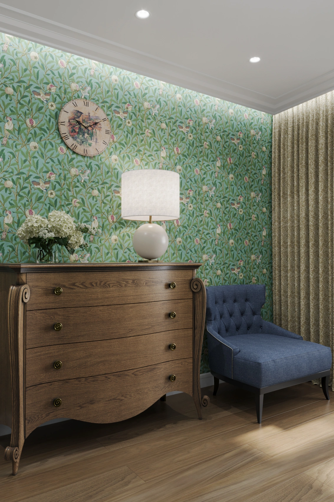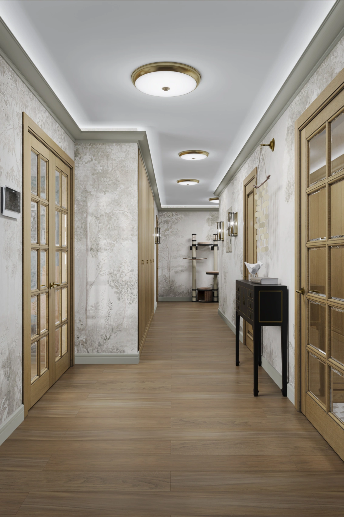 Интерьер квартиры выполнен в сочетании трёх стилистических направлений – это английская классика с добавлением стиля шинуазри для основной части квартиры и современный стиль минимализм был применён для двух детских комнат – двух дочек и сына.