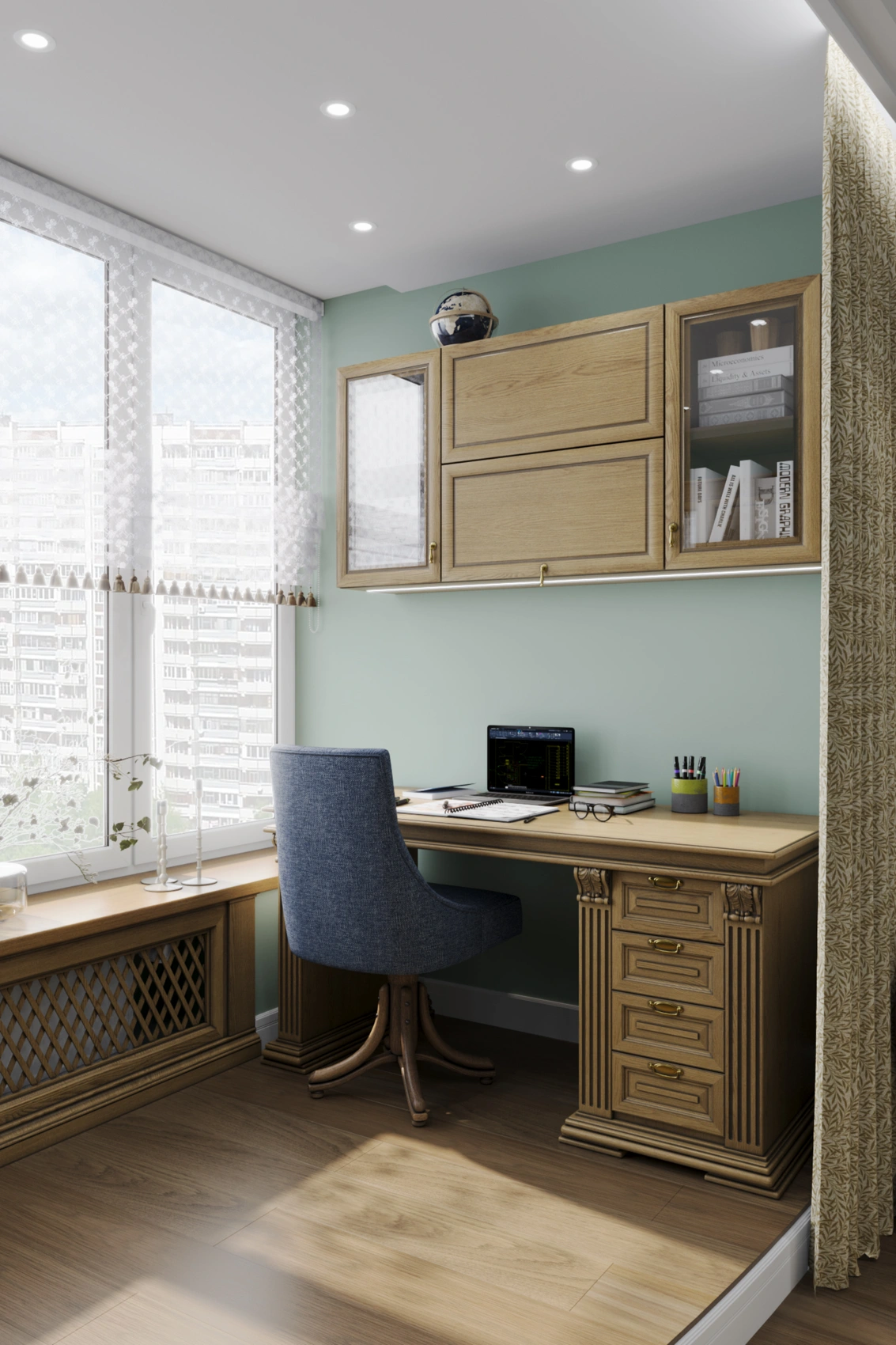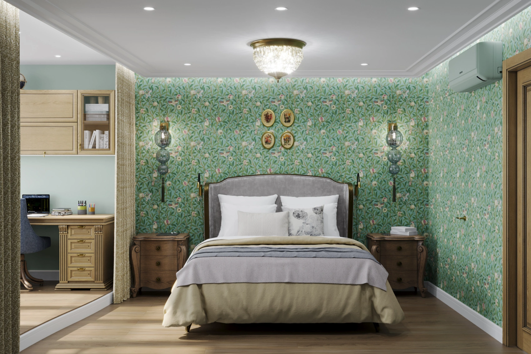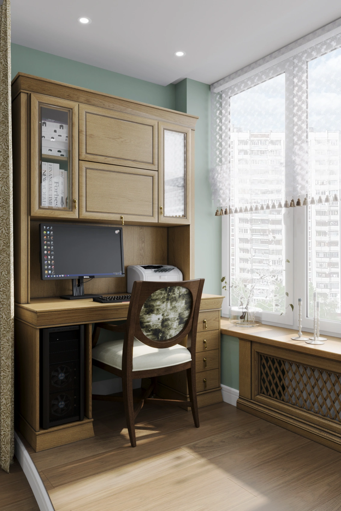 В спальне помимо спального места применена зона кабинета на два стола. Дизайн спальни имеет такие же глубокие и уютные цветовые сочетания, которые комфортны не только для отдыха, но и для работы.