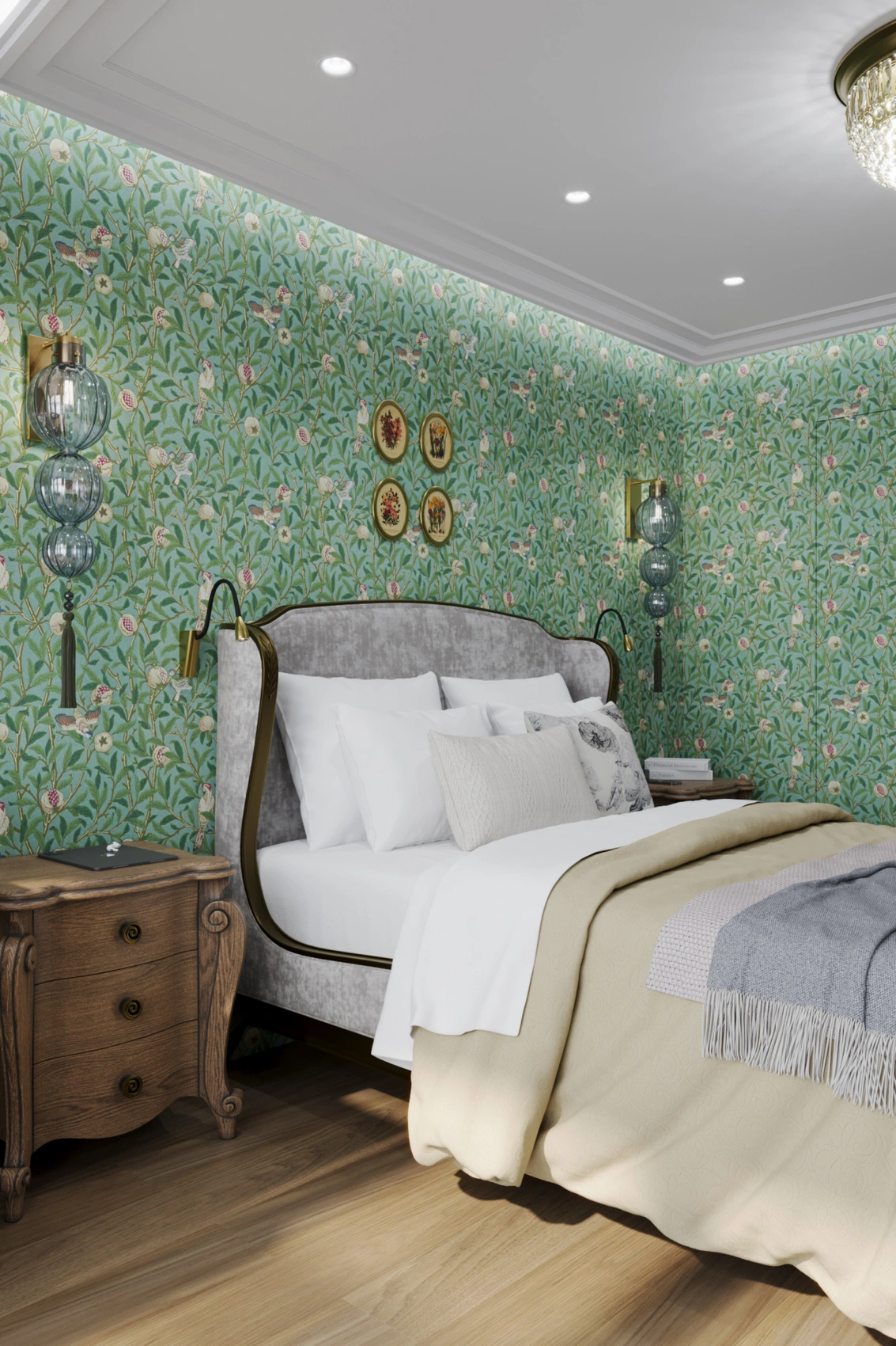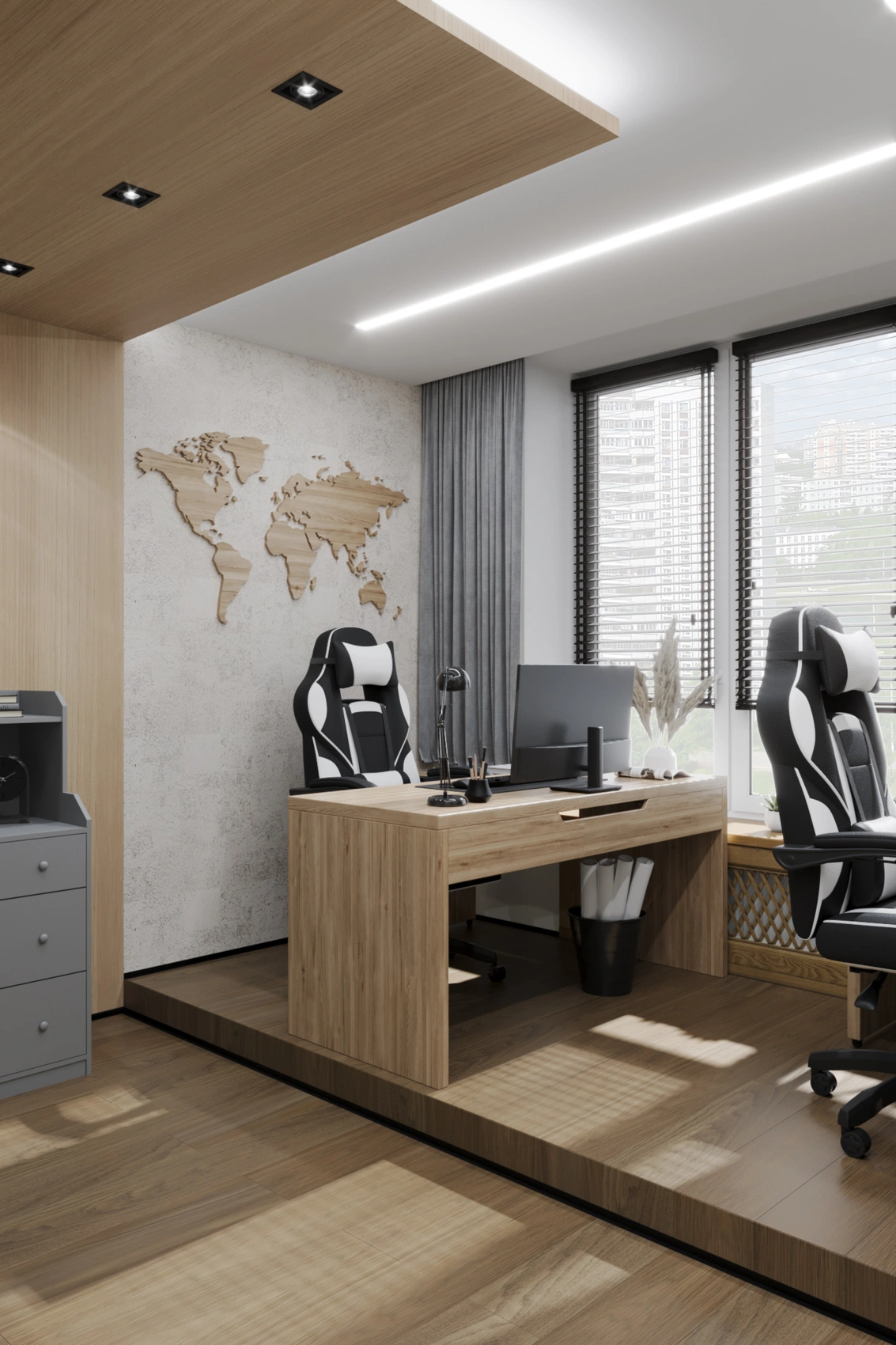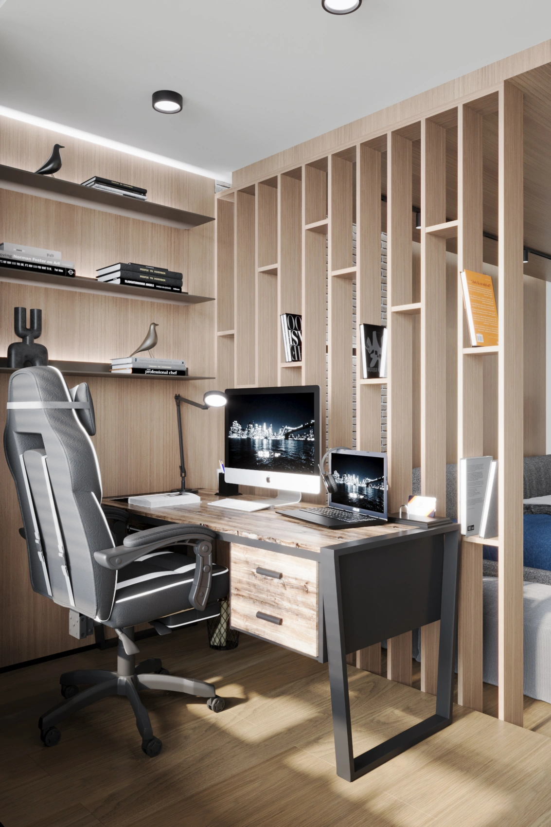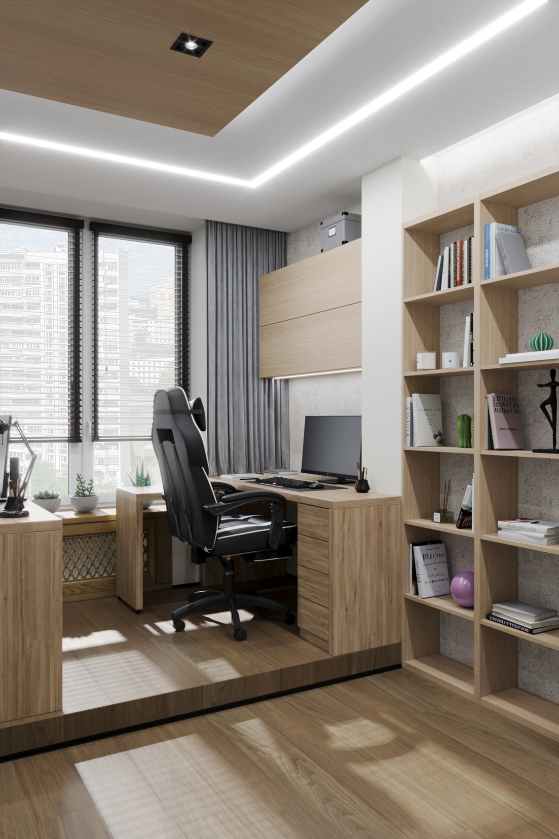 В спальне помимо спального места применена зона кабинета на два стола. Дизайн спальни имеет такие же глубокие и уютные цветовые сочетания, которые комфортны не только для отдыха, но и для работы.