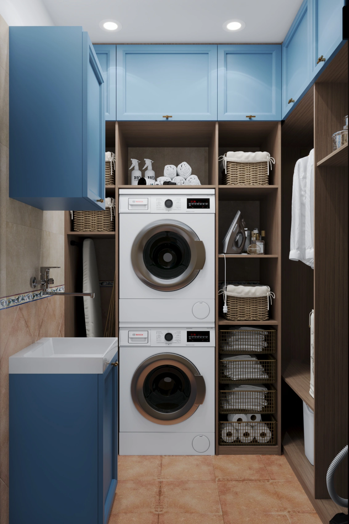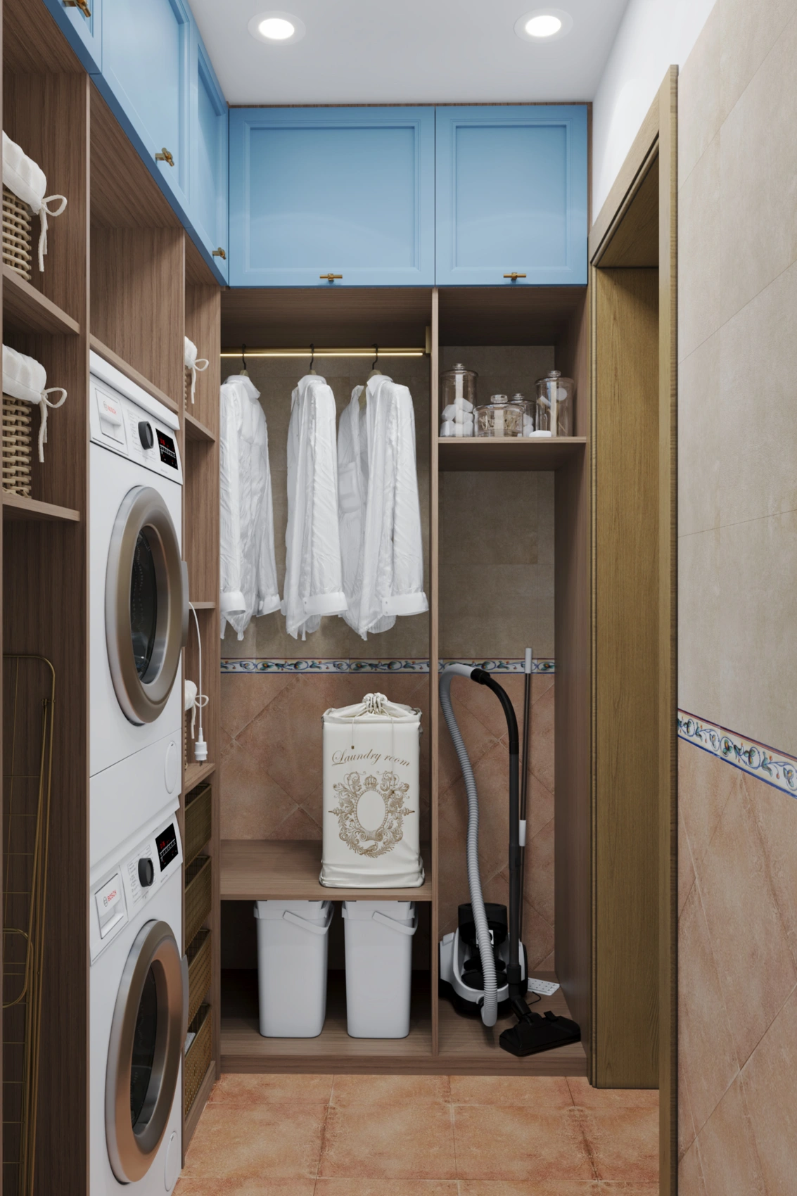Комната постирочной разработана таким образом, чтобы сбалансировать не только саму шкафную секцию, но и удобство ее наполнения с применением всей нужной бытовой техники.