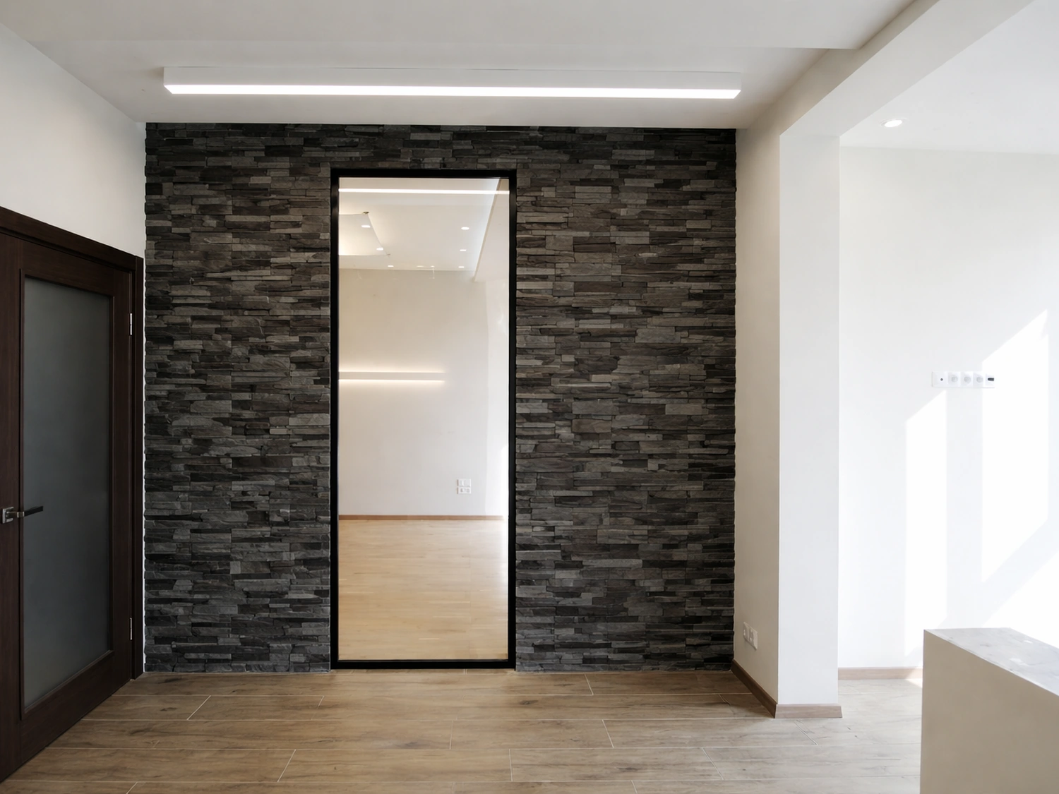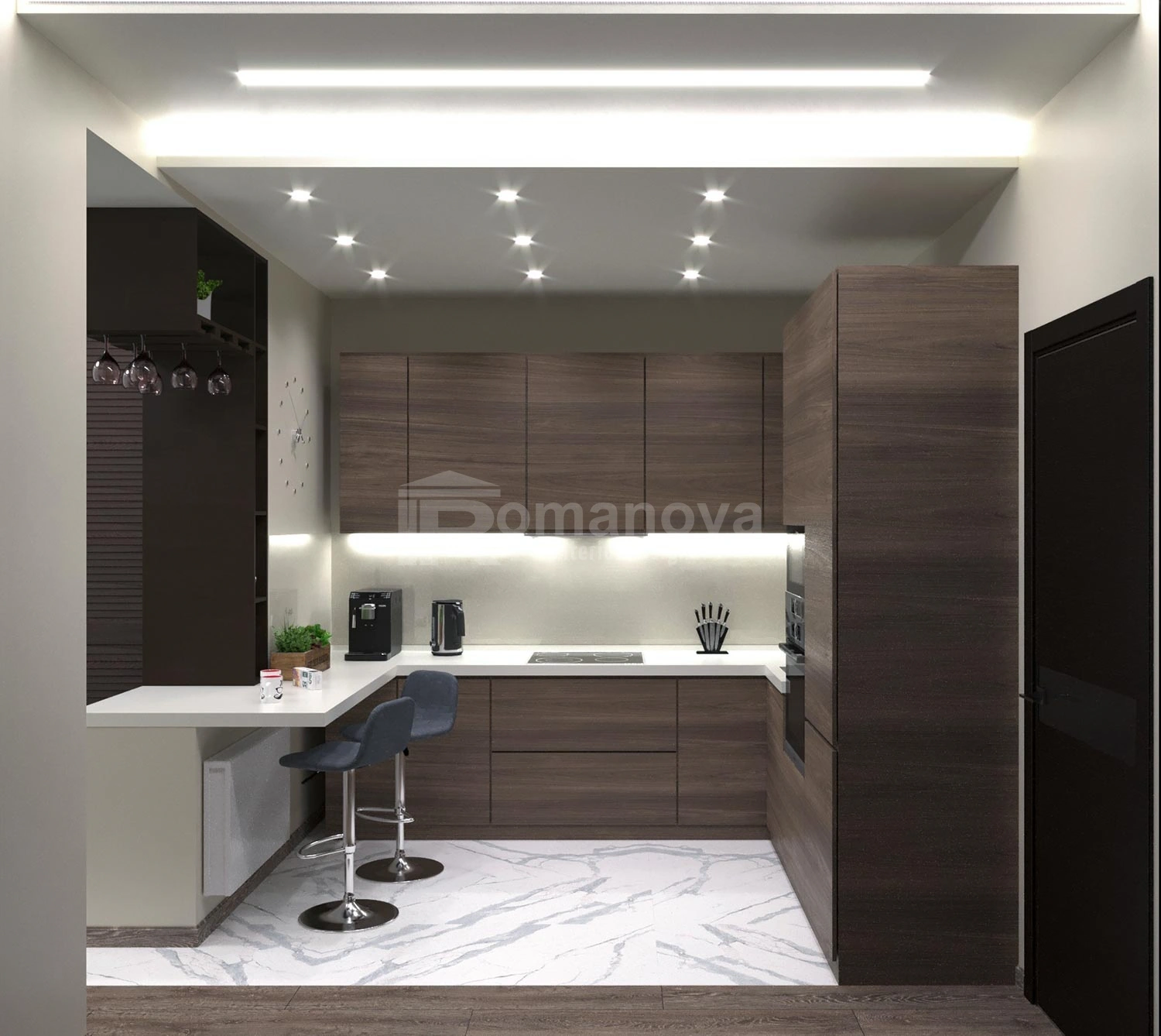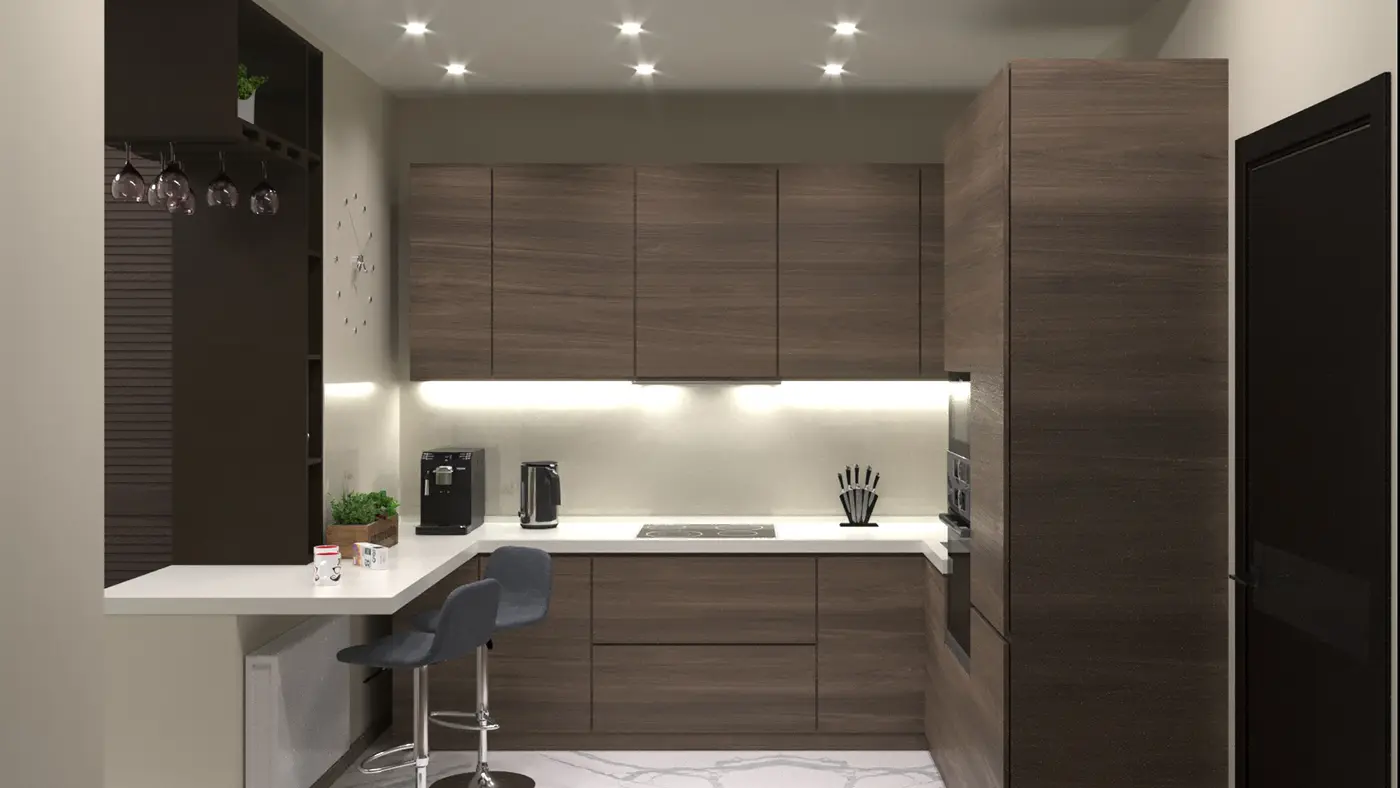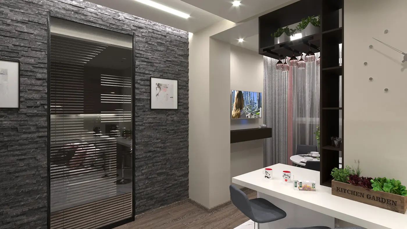 Приятная атмосфера квартиры, наполнена лёгкой основной цветовой палитрой, которая дополнена искусственным камнем дымчатого цвета, который создаёт индивидуальность интерьеру.