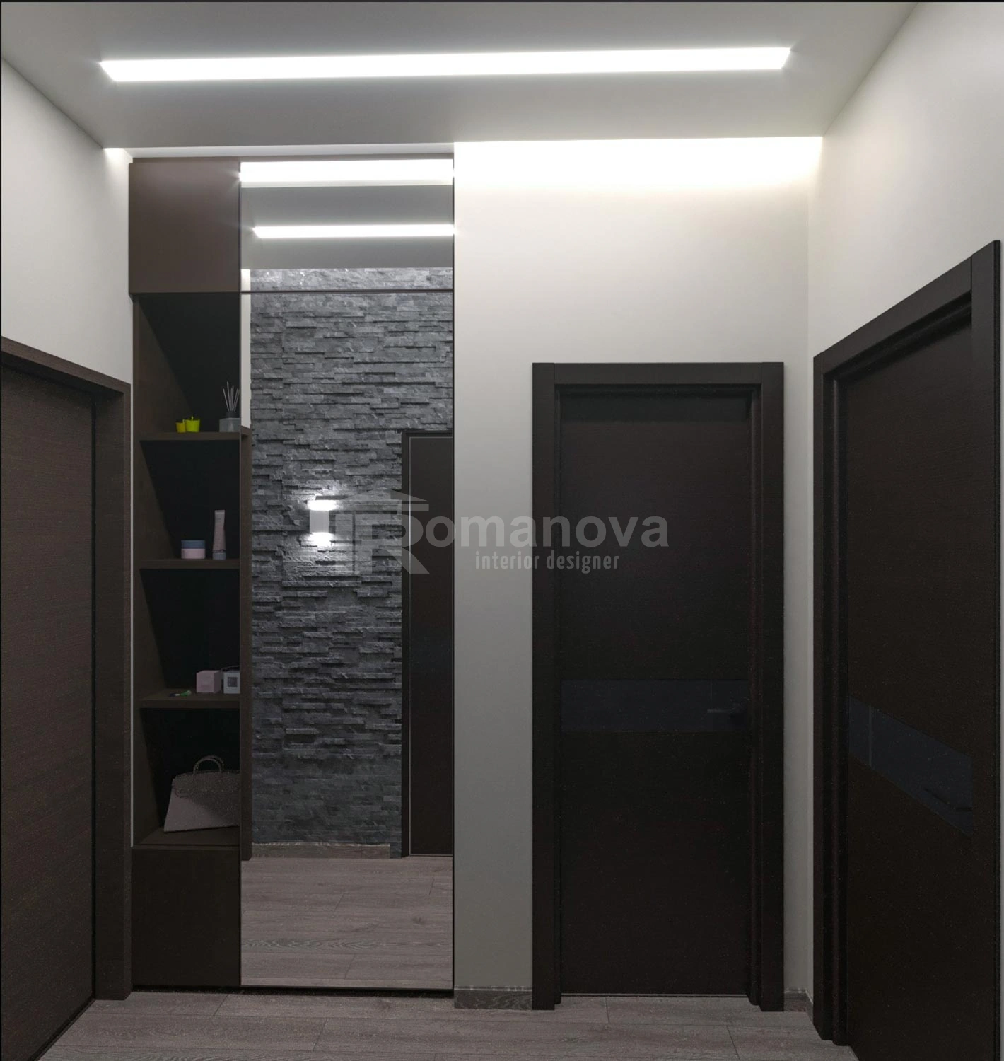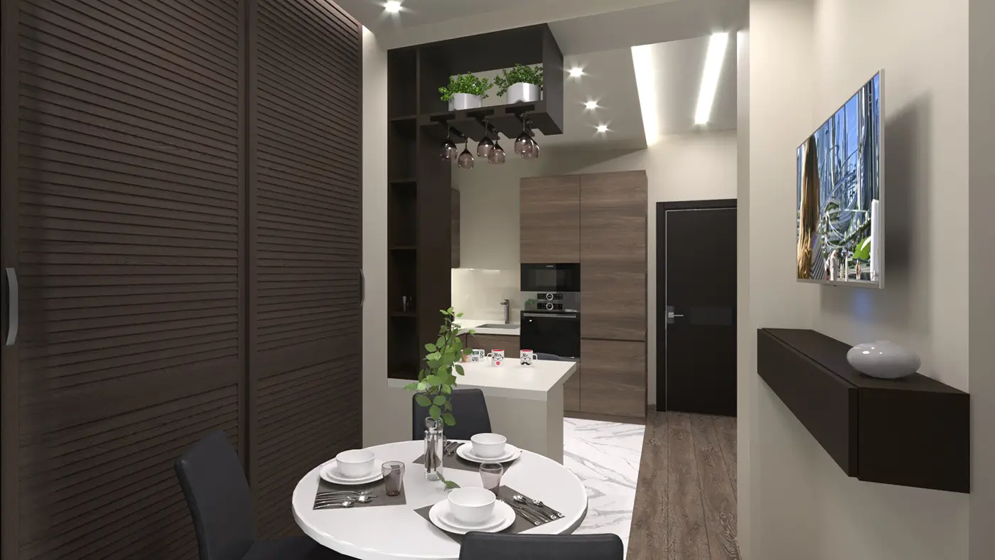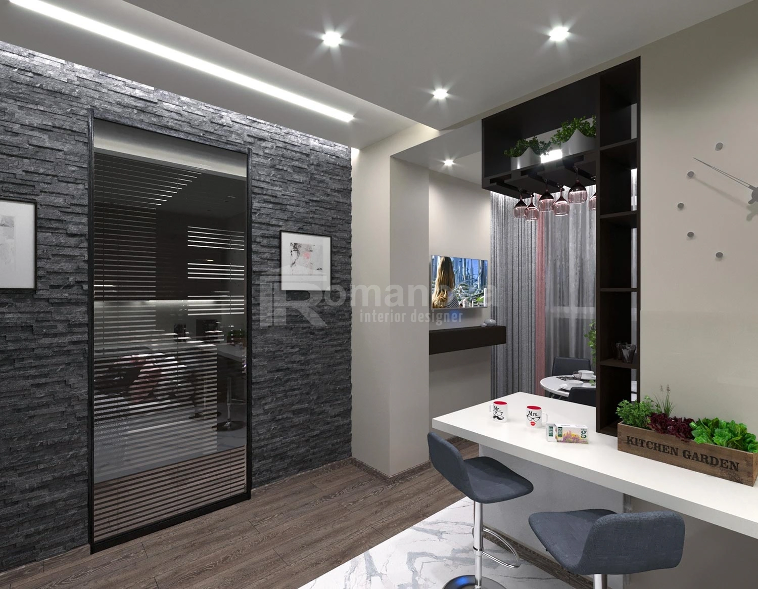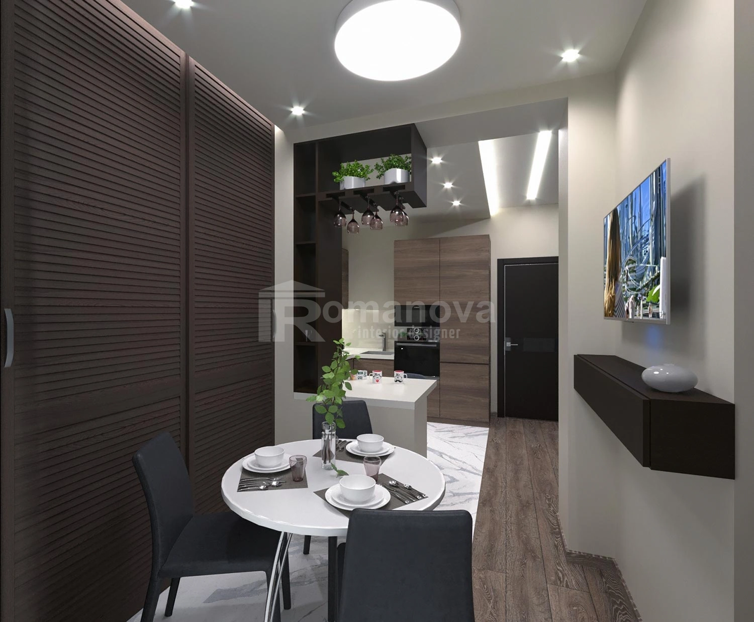 Дизайн-проект однокомнатной квартиры, спроектированный дизайнером интерьера Ирины Романовой для молодой девушки - будущего архитектора. Проект был выполнен в современном стиле минимализм.