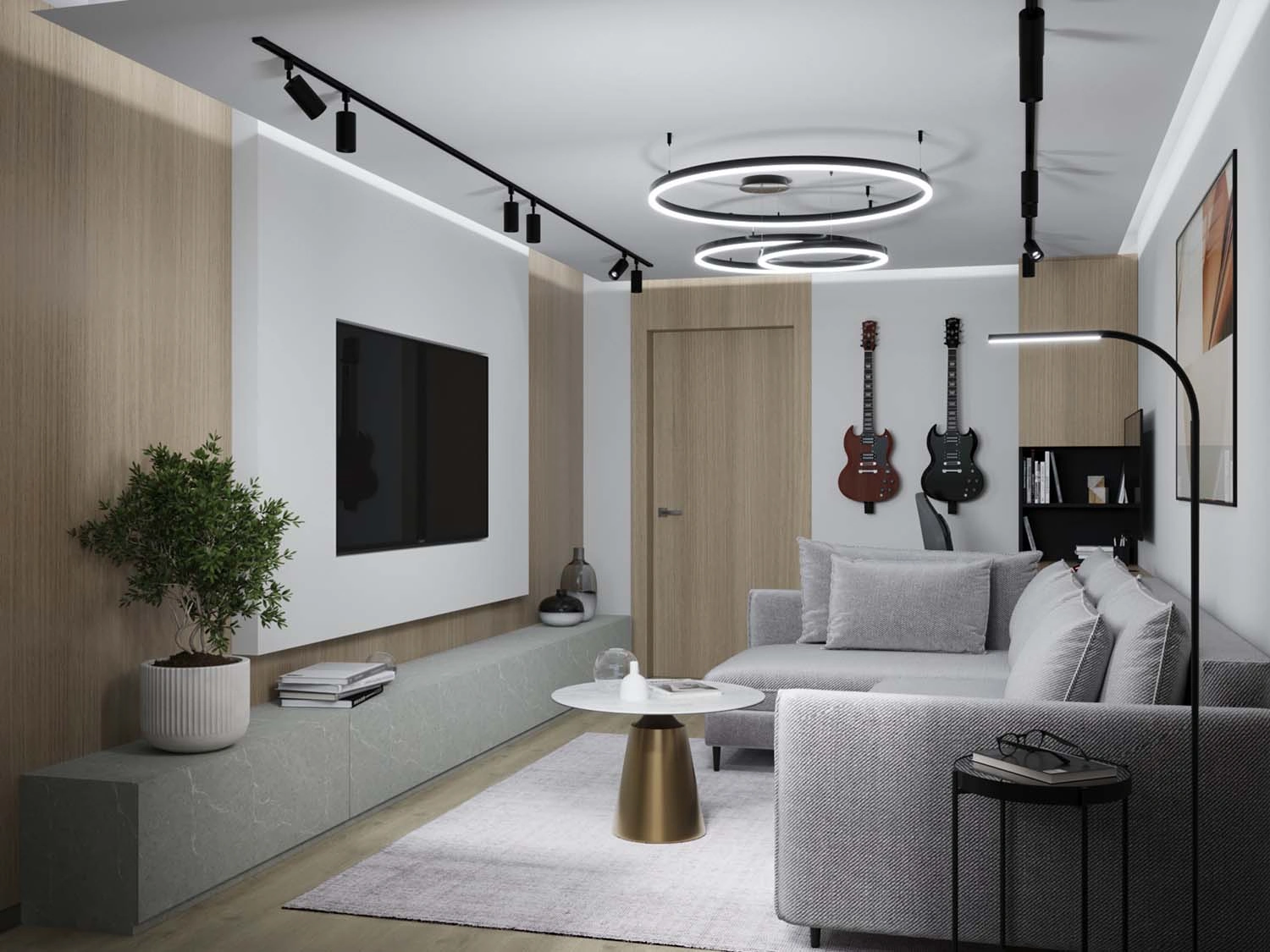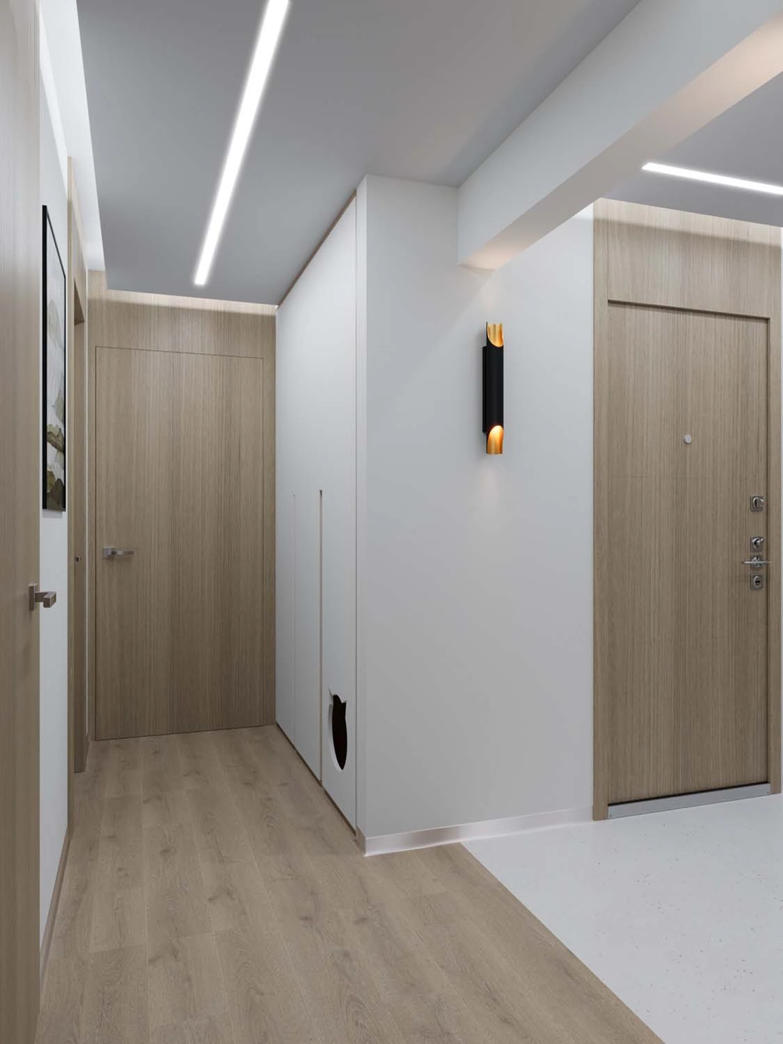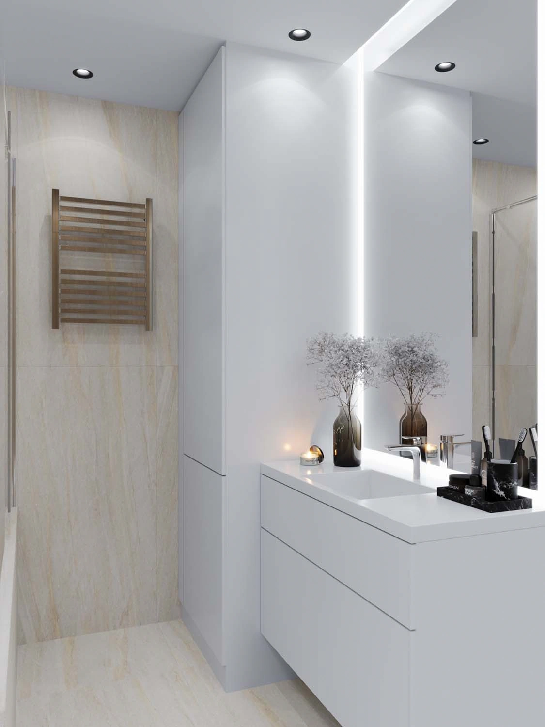 В первую очередь, конечно, стояла задача эргономически правильно разработать планировочное решение для каждого помещения с учётом максимального функционала, а уж второй задачей интересно, современно и стильно обыграть каждое пространство, в котором участвовало и правильно спланированное освещение. Освещение в дизайне играет не менее важную роль, так как при включении разного сценария освещения, помещение можно кардинально трансформировать под определённое настроение. 😉