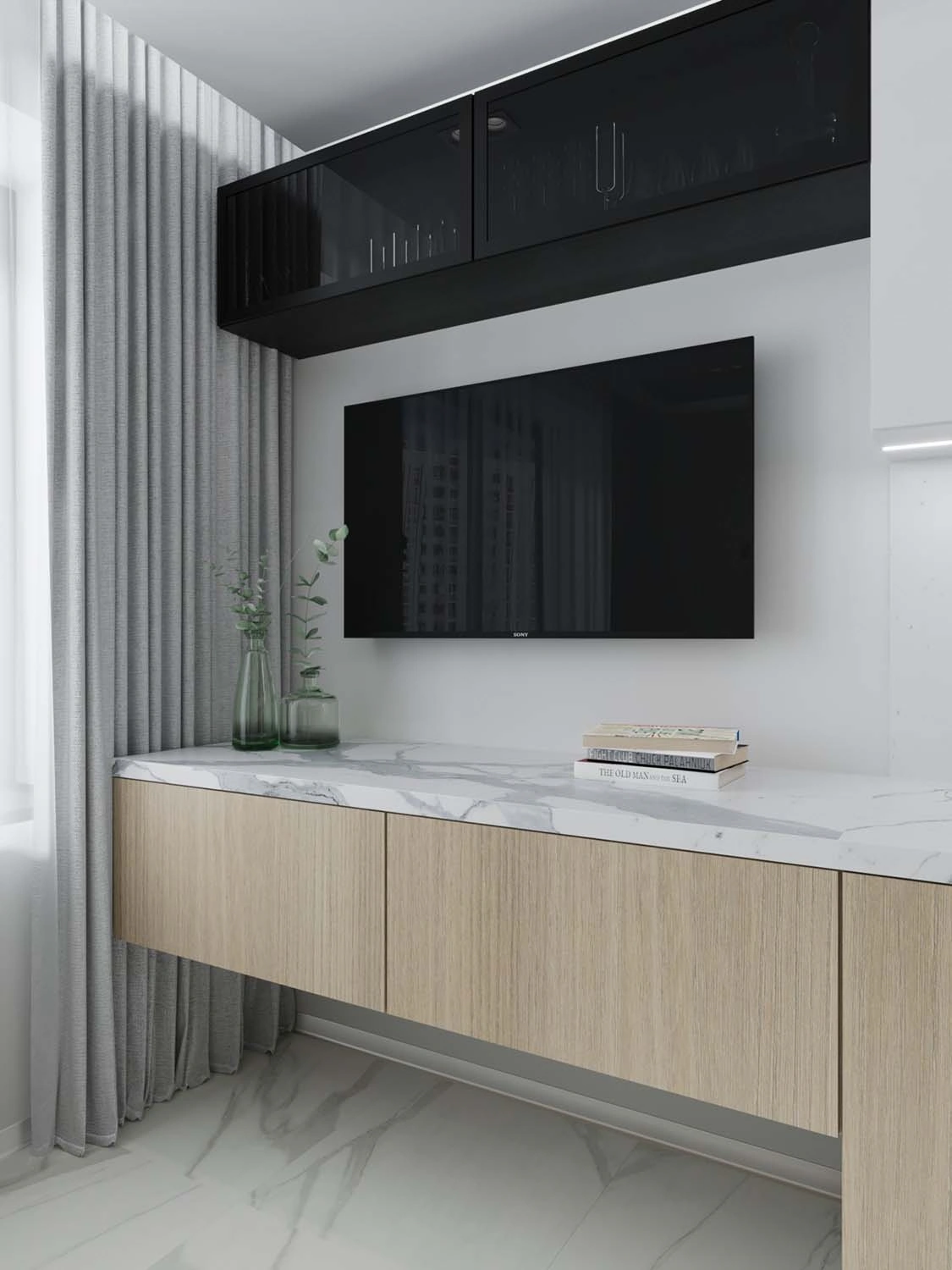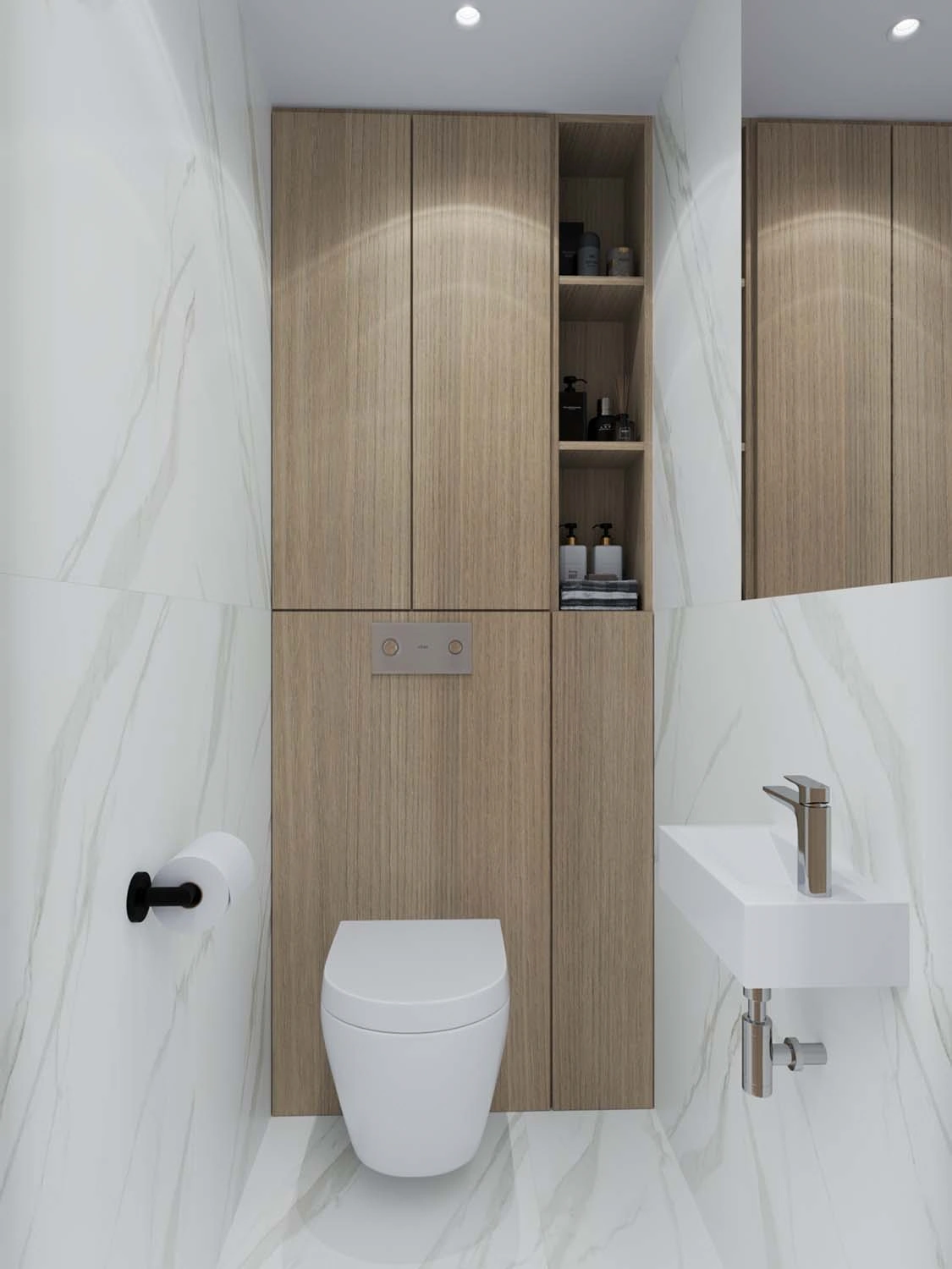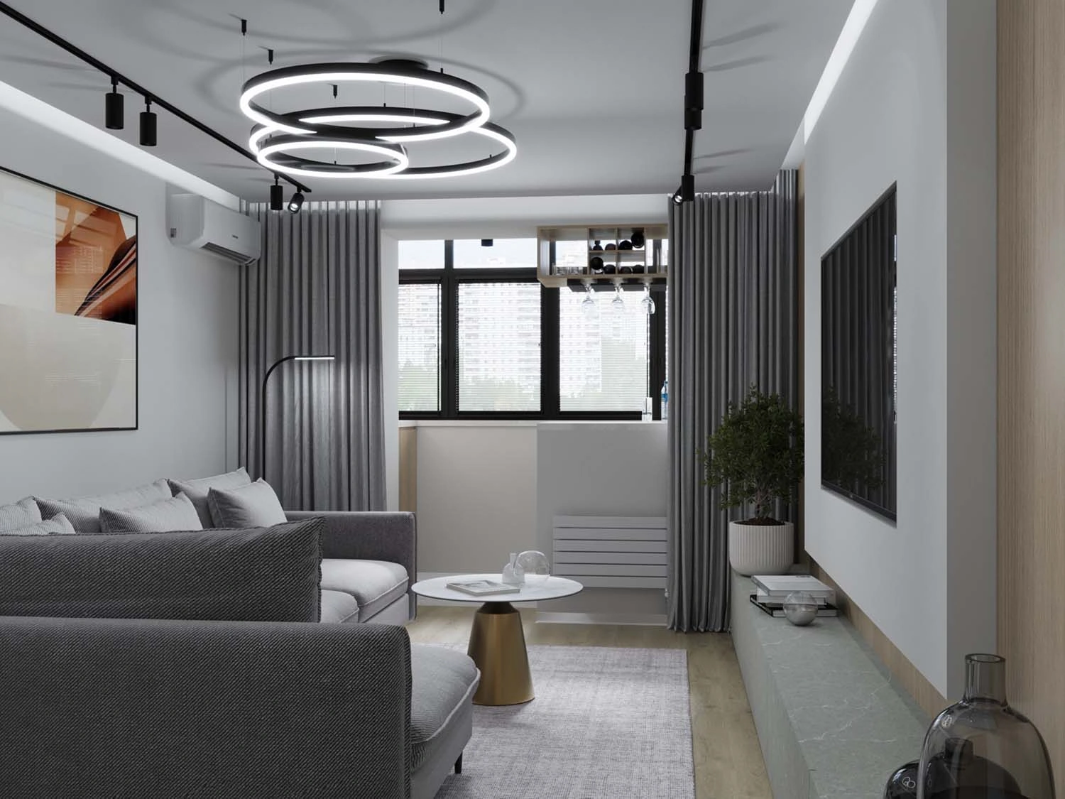 В первую очередь, конечно, стояла задача эргономически правильно разработать планировочное решение для каждого помещения с учётом максимального функционала, а уж второй задачей интересно, современно и стильно обыграть каждое пространство, в котором участвовало и правильно спланированное освещение. Освещение в дизайне играет не менее важную роль, так как при включении разного сценария освещения, помещение можно кардинально трансформировать под определённое настроение. 😉