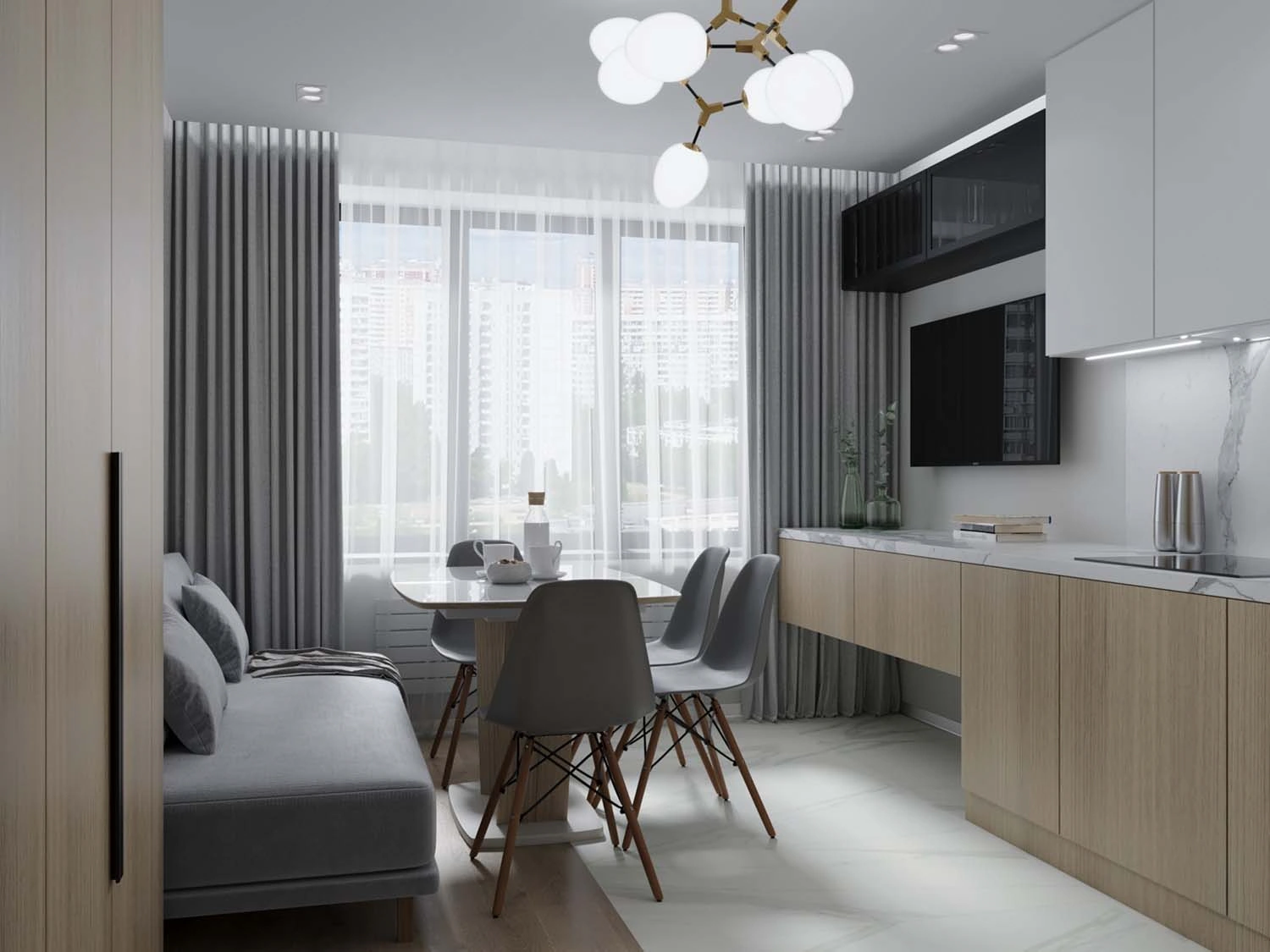 Ребятам близок простой и при этом стильный интерьерный стиль минимализм. Свою квартиру хозяева хотели видеть в светлой цветовой палитре с дополнением серых спокойных оттенков и мягкого цвета дерева. Подобное сочетание в последнее время очень полюбилось современной молодёжи, так как при таком цветовом сочетании чувствуется комфортная атмосфера, в которой можно спокойно отдыхать после суматошного дня. 👍🏻