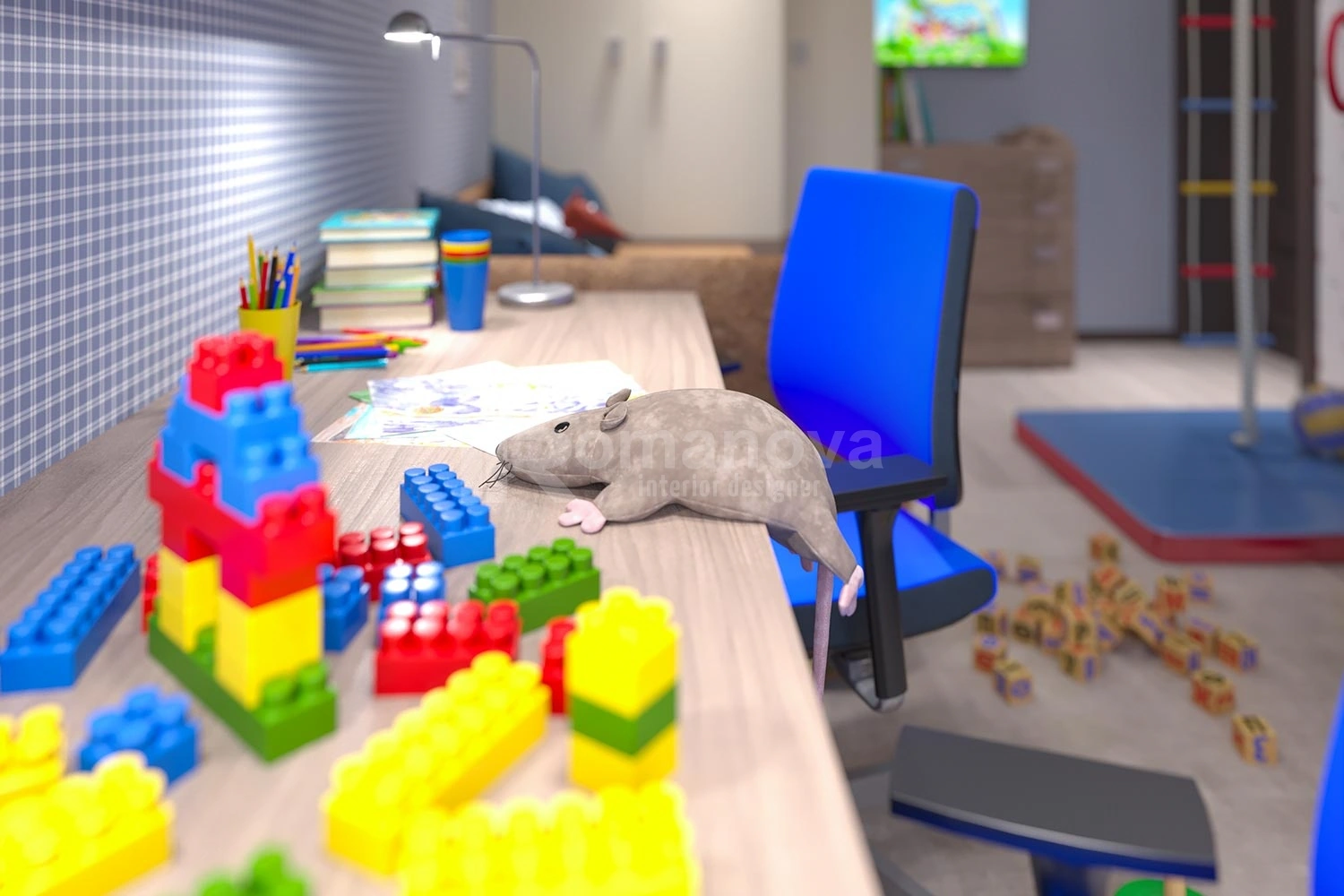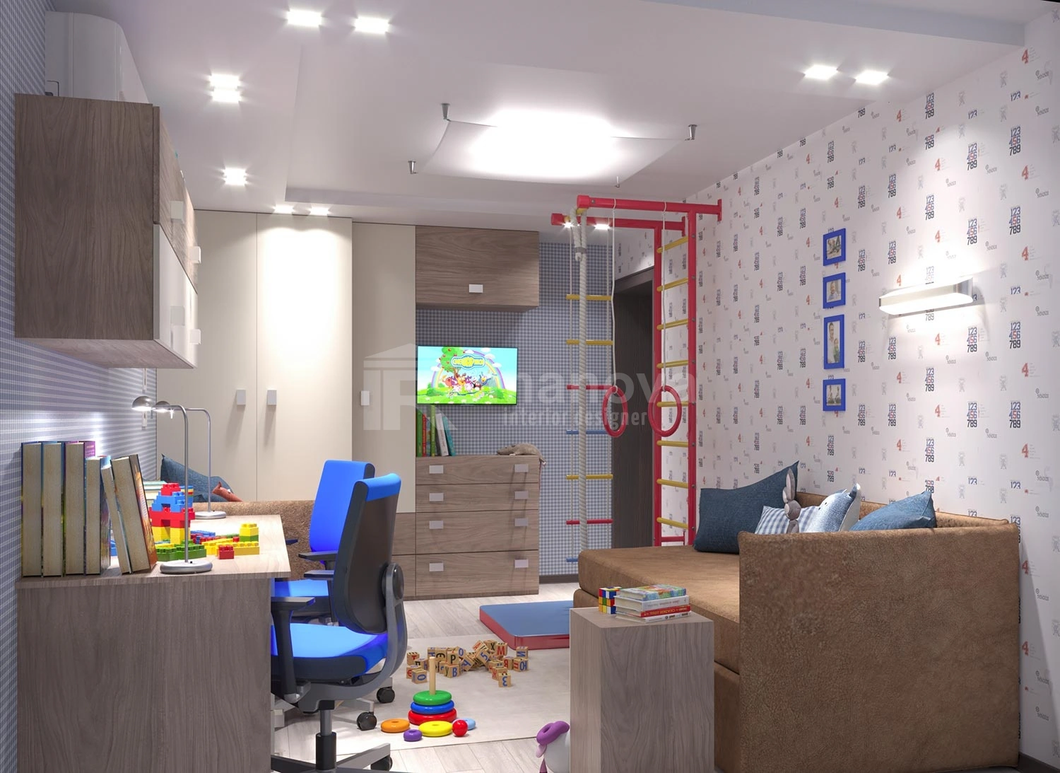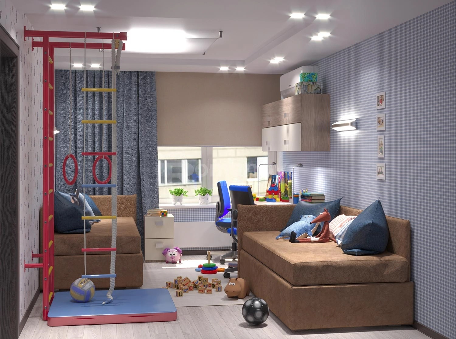 Для детской, были подобраны обои в мелкую клетку голубого цвета, которые являются основным фоном в интерьере детской комнаты. Дополнительным акцентом для оформления стен, подобраны обои из той же коллекции, но уже с рисунками цифр на белом фоне, что очень освежает пространство. Шторы и подушки на кроватях, поддерживают тематику комнаты для мальчишек. Выбранный цвет обивки для кроватей, смягчают холодную фоновую палитру интерьера, а контрастом и дополнительным ярким акцентом, является красный цвет, который прослеживается в спортивном оборудовании и игрушках. Подобное оформление детской комнаты, будет расти вместе с ещё пока маленькими мальчишками и не надоест им ещё очень долго.