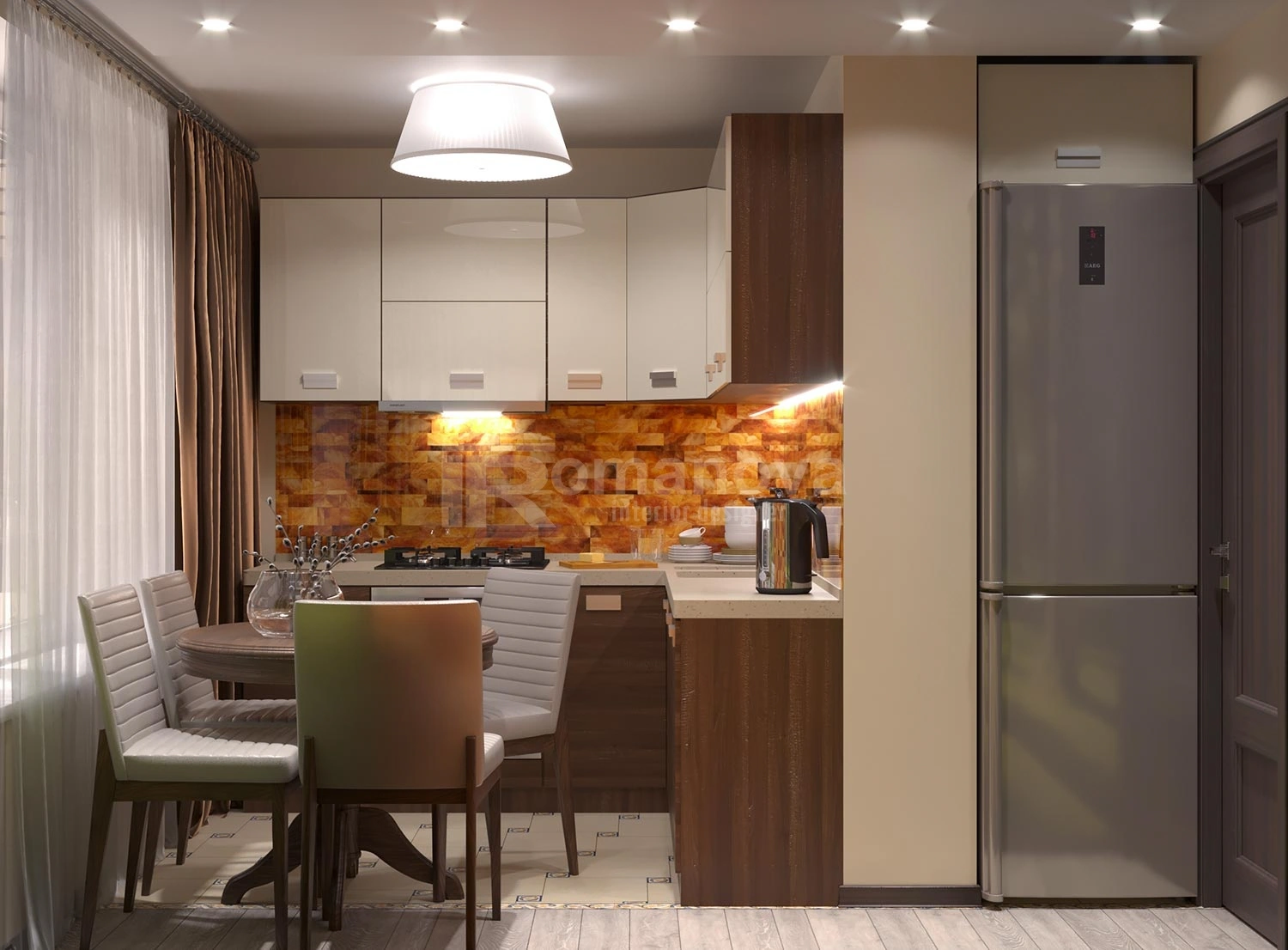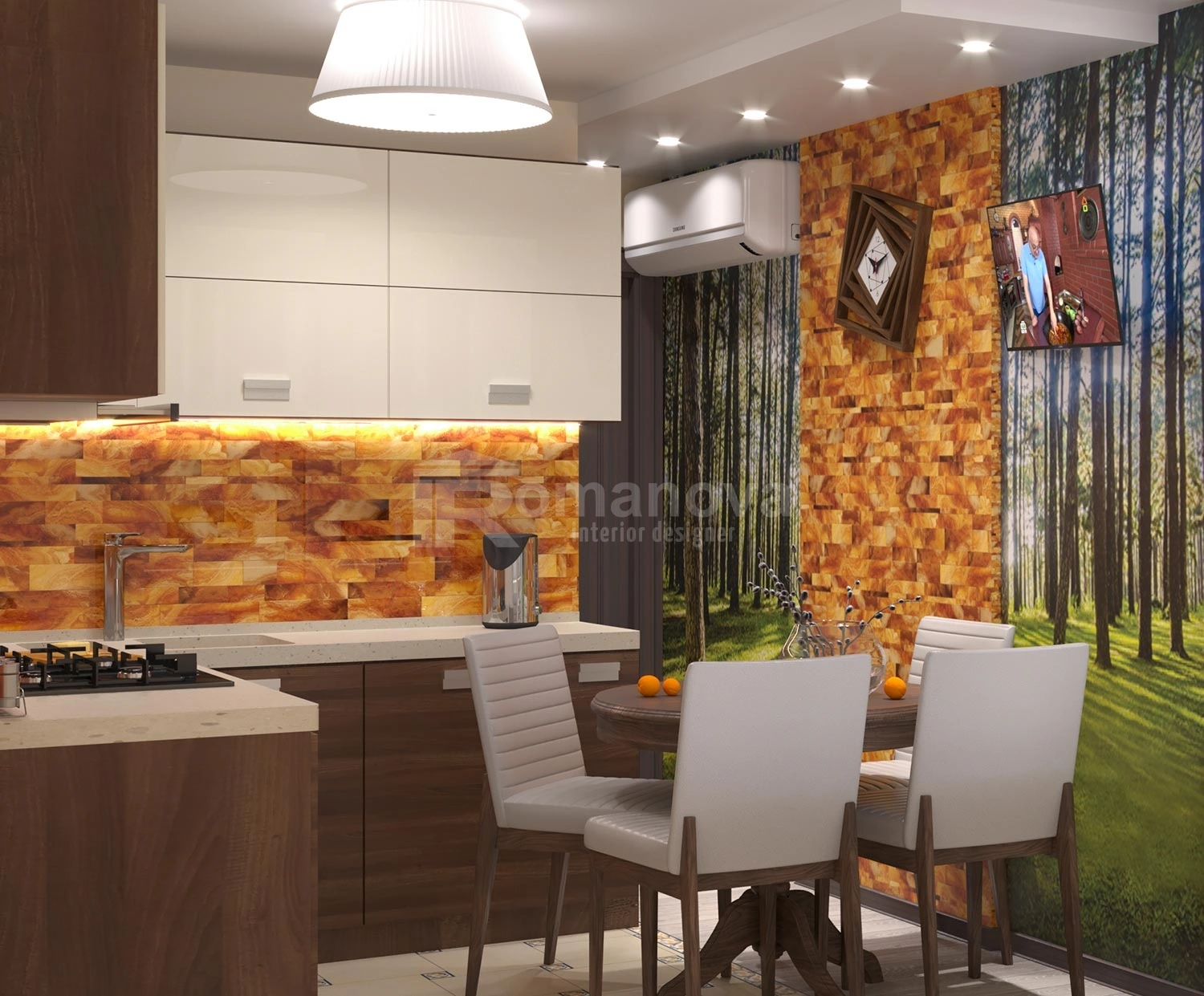 Кухонное пространство, украшено, помимо фонового светло-бежевого тона для стен, очень уютными фотообоями с лесной тематикой, которые придают помещению визуальной перспективы и объёма. Дополнением к фотообоям добавлен яркий принт, имитирующий кладку в виде кирпичиков из натурального рыжего оникса, что позволяет, воспринимать интерьерное оформление кухни в ярком, сочном и ненавязчивом дизайн-концепте. Световое оформление помещения, имеет разные группы включения света и спроектировано таким образом, чтобы освещать каждый уголок.