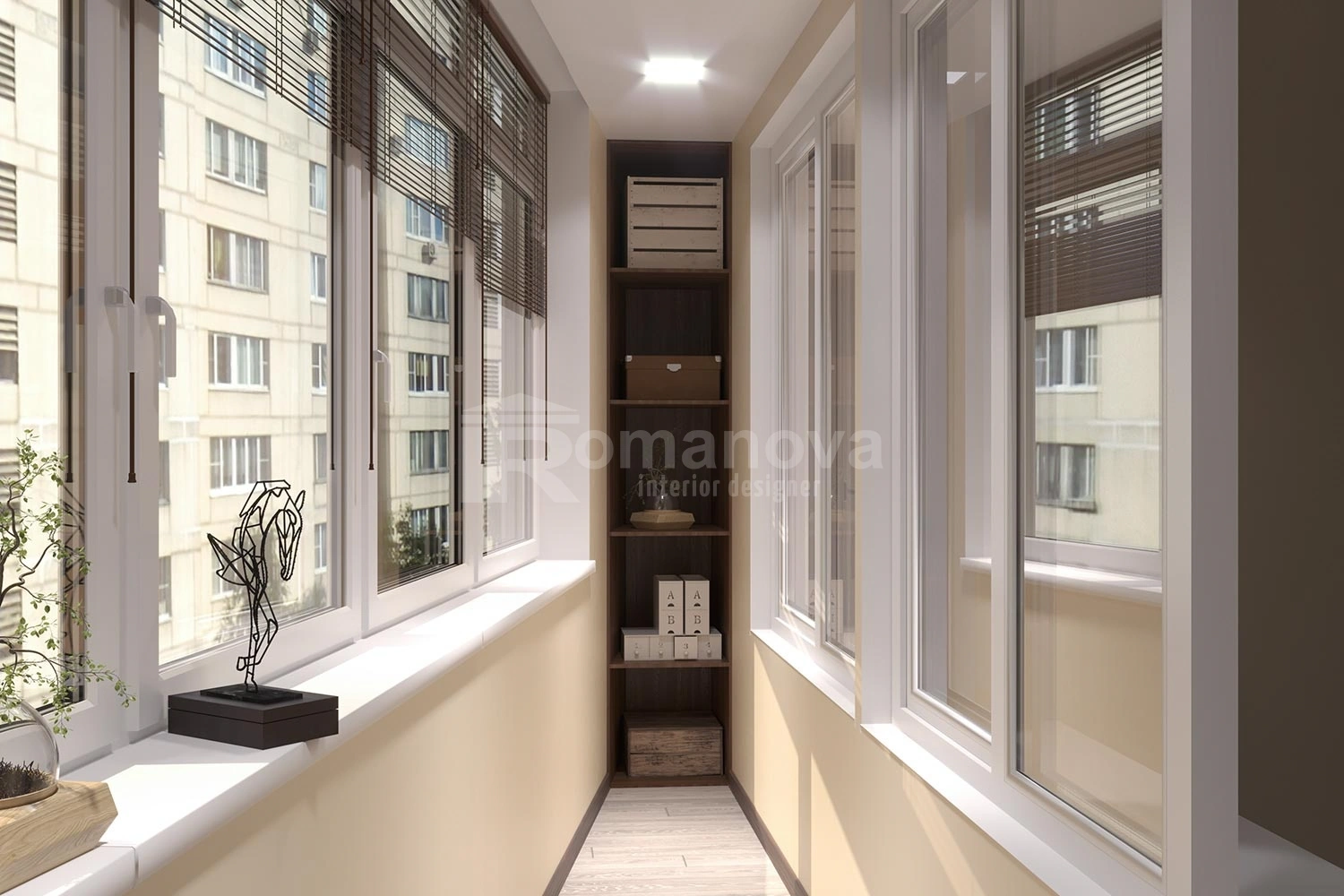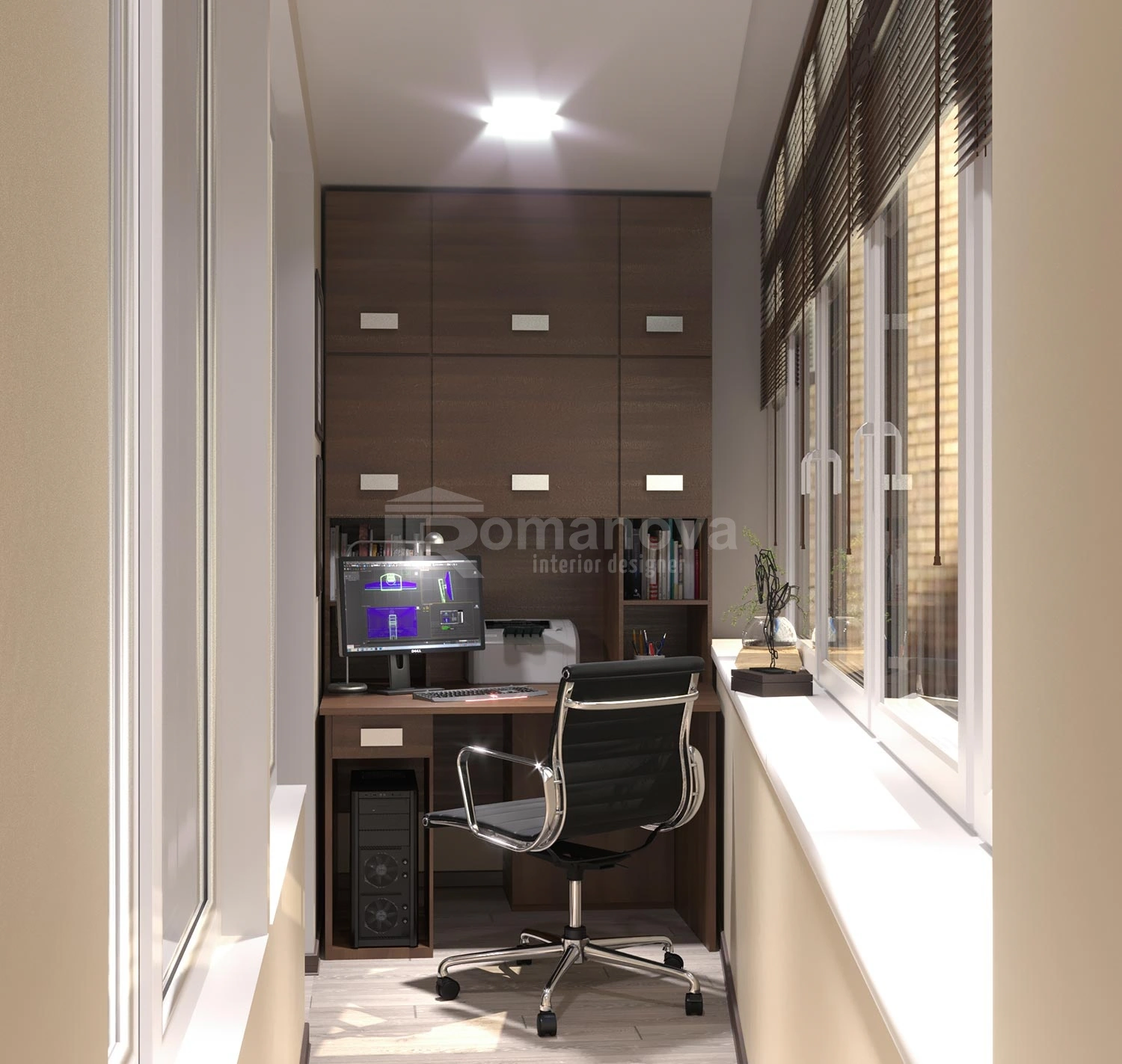 Хозяин квартиры много работает дома, поэтому решено было расположить рабочий кабинет на балконе. Там установлен удобный и функциональный рабочий стол, на котором уместилась вся нужная для работы оргтехника. Цветовая палитра для стен в интерьере балкона, выполнена в светло-бежевых тонах. Вся мебель и горизонтальные деревянные жалюзи, выбраны в цвете венге. Световое оформление данного пространства, дополнено точечными светильниками и настольной лампой. Это позволяет максимально визуально представить, что человек находится в офисном, комфортном пространстве, спроектированном специально для рабочей обстановки.