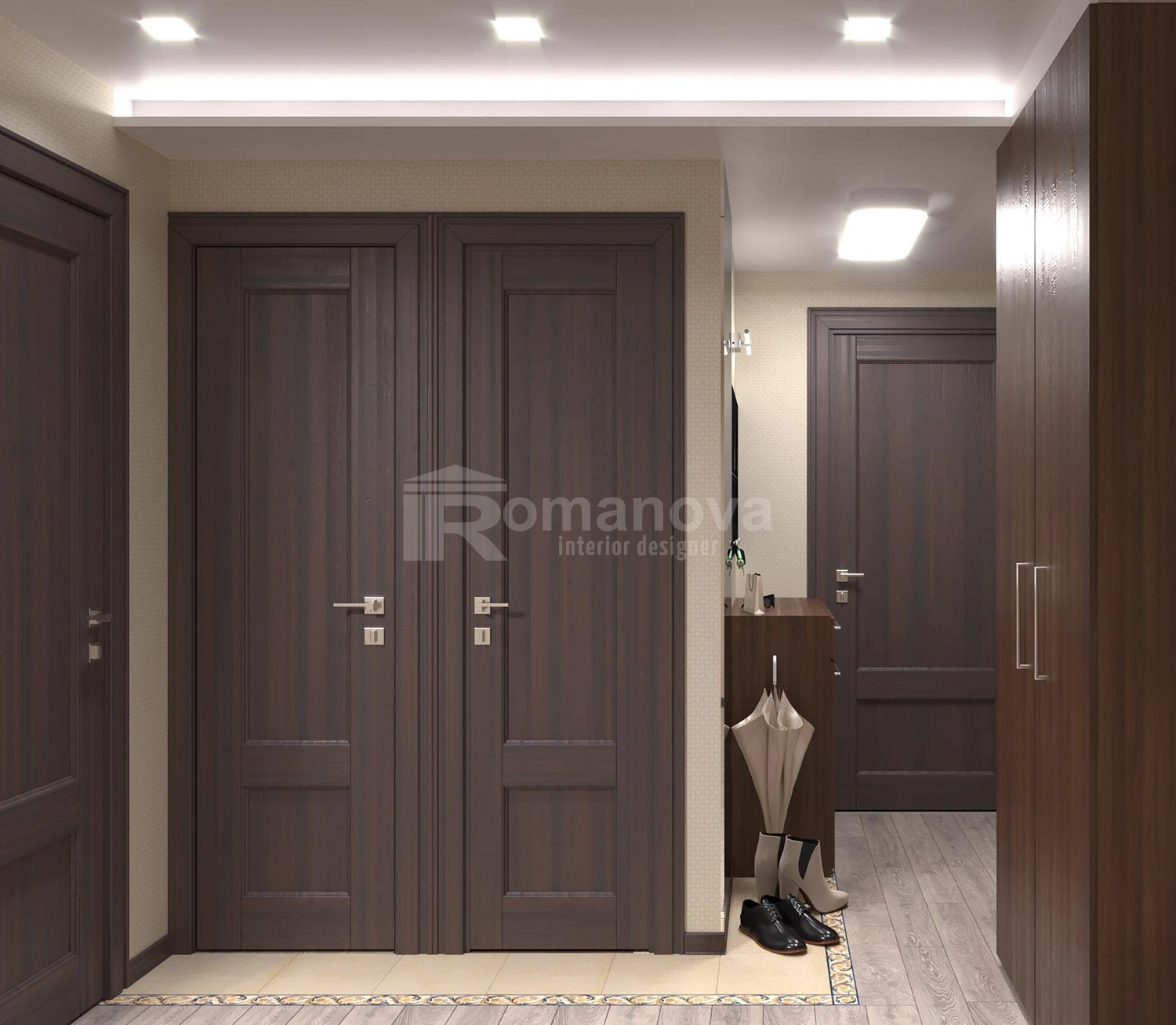 Из-за конструктивных особенностей потолочной части в прихожей (там проходит вентиляционный короб большого диаметра), был спроектирован двухуровневый потолок с разноплановыми осветительными приборами. Функциональной частью интерьера прихожей стал встроенный шкаф и комод-консоль над котором расположили доску-ключницу, что очень порадовало хозяев дома, так как они очень любят писать друг другу записки, когда уходят из дома. Большое зеркало помимо своего функционального назначения, имеет ещё и декоративное назначение, так как визуально расширяет пространство небольшой комнаты.