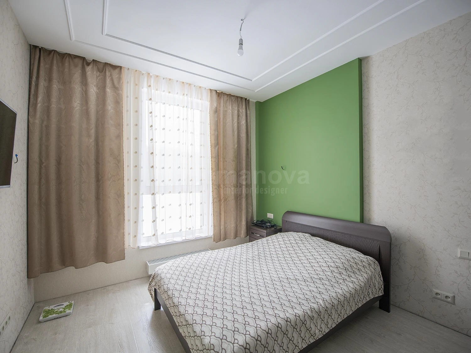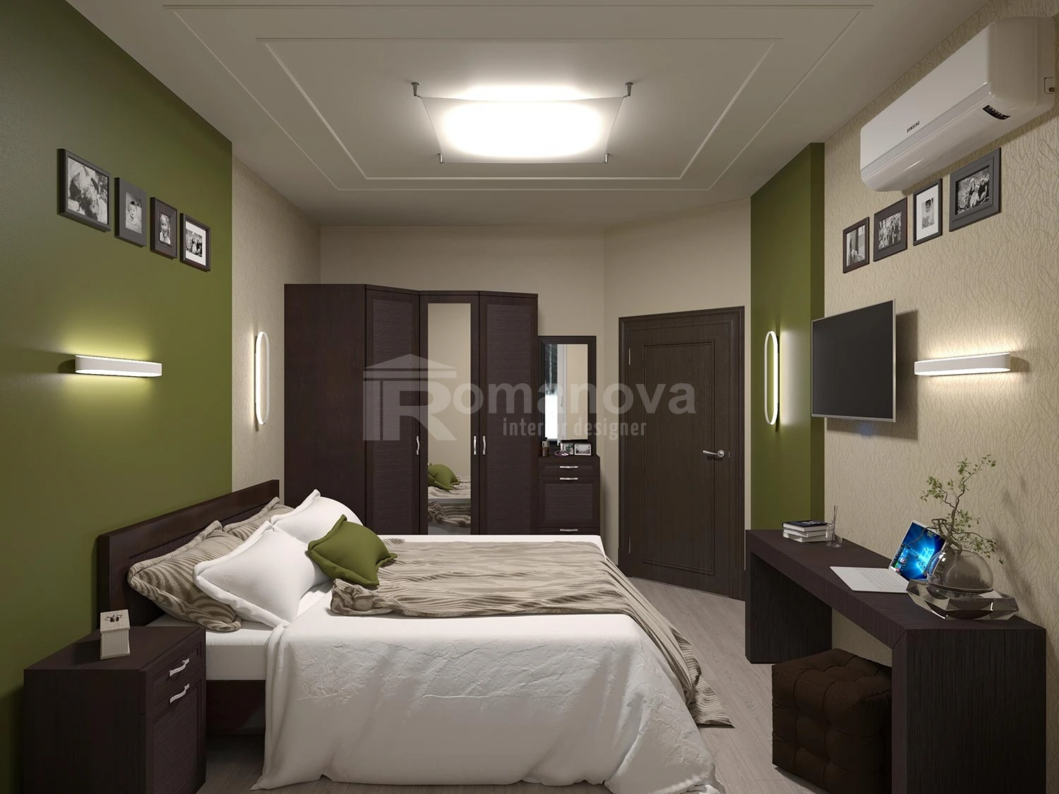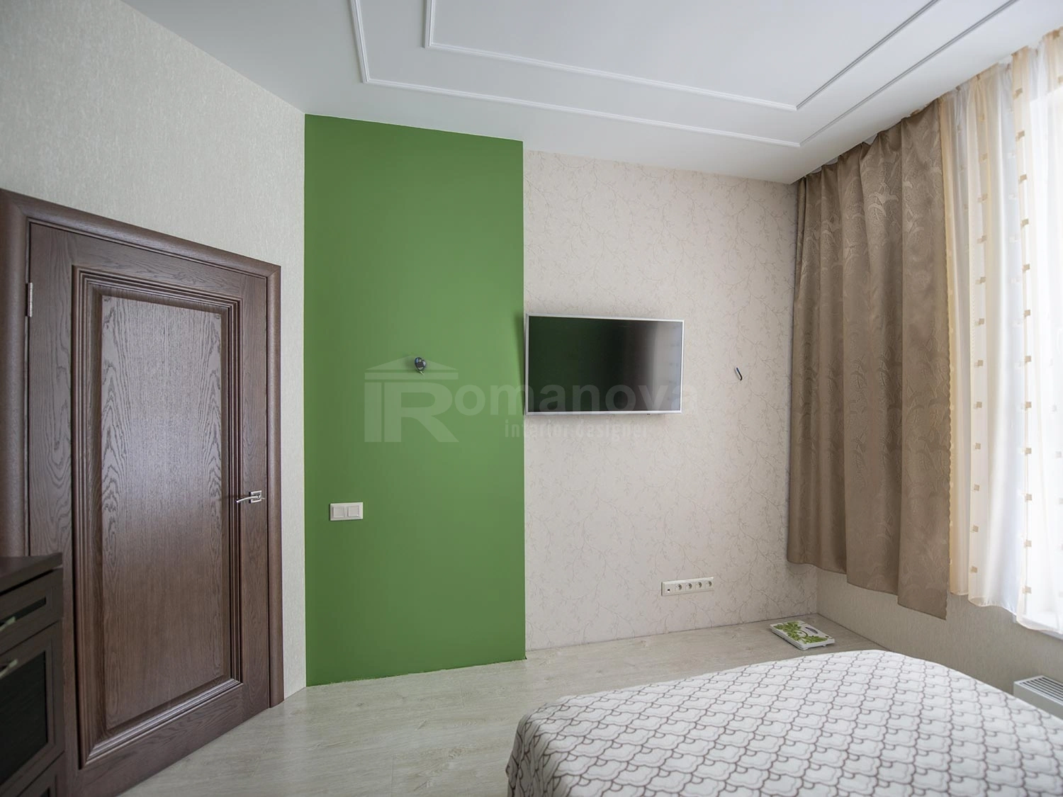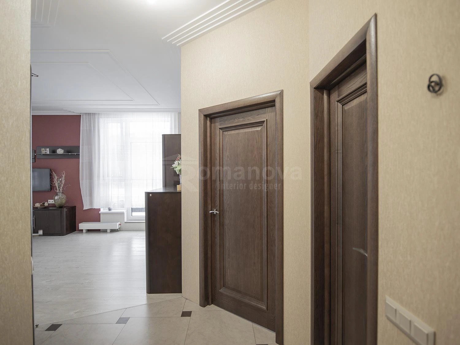 Основная фоновая цветовая палитра для стен, выбрана в бежевых тонах с добавлением акцентных цветовых пятен: бордового и травянистого зелёного. Подобная цветовая палитра очень близка для заказчиков. Принципиальным условием для них было применение в новой квартире мебель для спальни и гостиной уже купленную ими в своё время. Мебель имеет цвет венге, данный цвет очень импонирует хозяевам дома, тем самым задаёт тематику всей остальной мебели и межкомнатных дверей в квартире. Дизайнер интерьера Ирина Романова в проекте с основной темной мебелью и дверьми, решила отступить от темного цвета и привнести светлых тонов только для одного помещения, что очень заинтриговало хозяев и идея была ими принята с большим удовольствием, но всё по порядку.