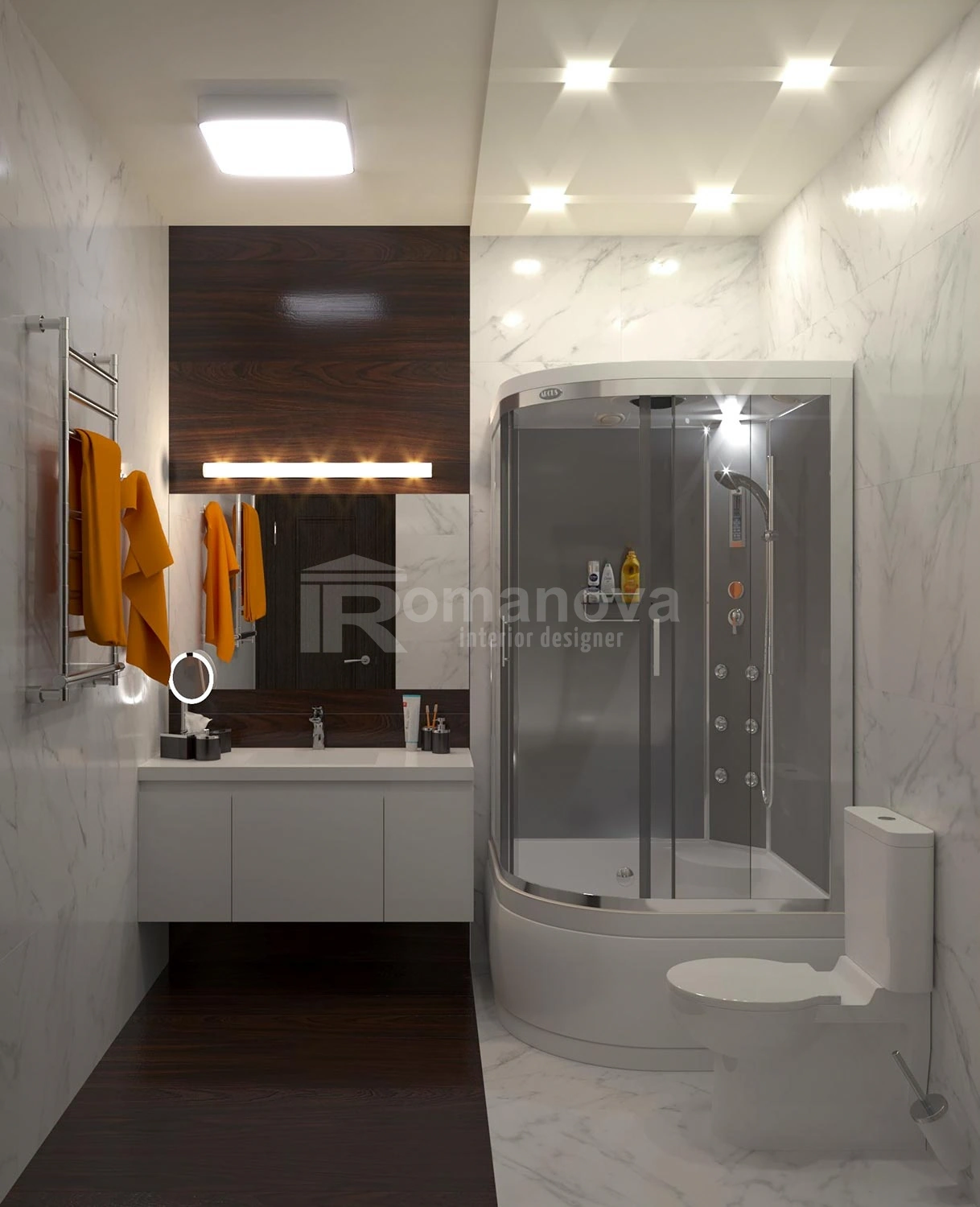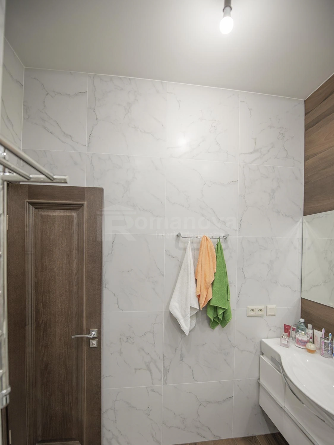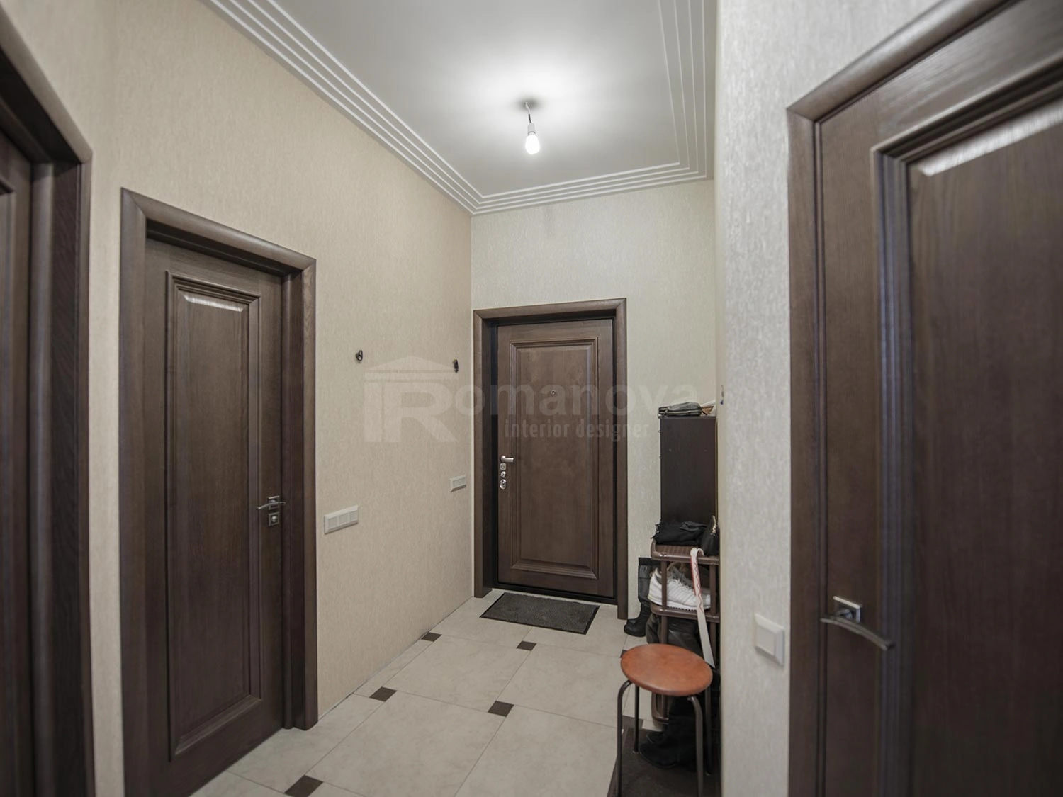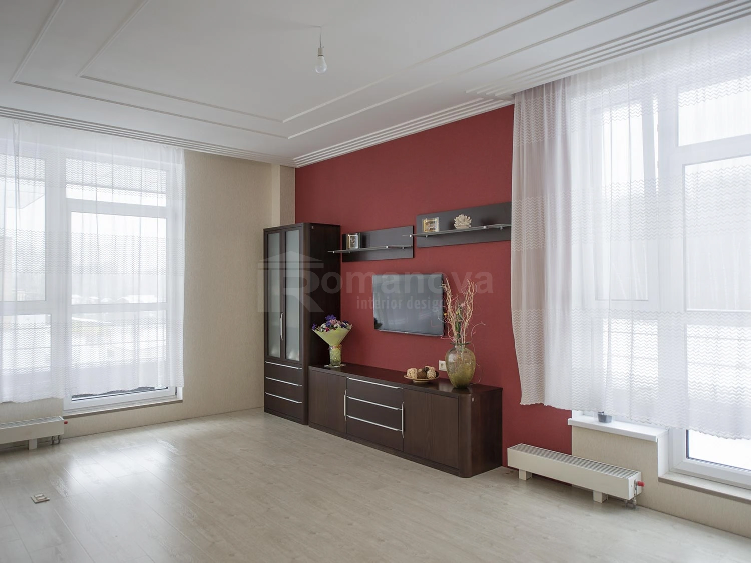 Основная фоновая цветовая палитра для стен, выбрана в бежевых тонах с добавлением акцентных цветовых пятен: бордового и травянистого зелёного. Подобная цветовая палитра очень близка для заказчиков. Принципиальным условием для них было применение в новой квартире мебель для спальни и гостиной уже купленную ими в своё время. Мебель имеет цвет венге, данный цвет очень импонирует хозяевам дома, тем самым задаёт тематику всей остальной мебели и межкомнатных дверей в квартире. Дизайнер интерьера Ирина Романова в проекте с основной темной мебелью и дверьми, решила отступить от темного цвета и привнести светлых тонов только для одного помещения, что очень заинтриговало хозяев и идея была ими принята с большим удовольствием, но всё по порядку.